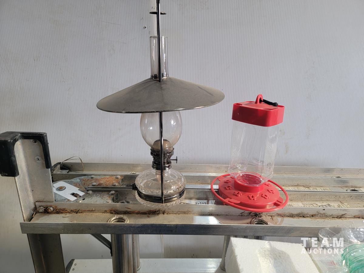 ladder, portable wash sink, kerosene lamp, hummingbird feeder, solar lights