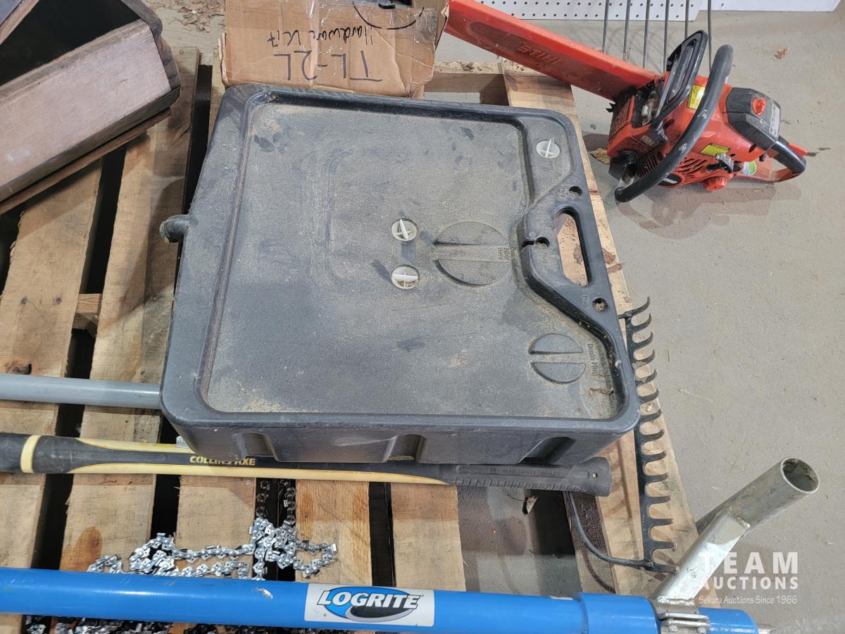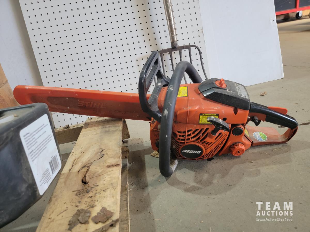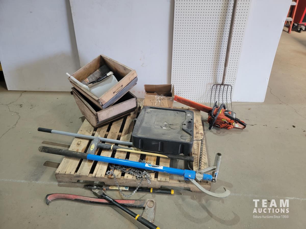Echo Cs-370 chainsaw, axe, Fiskars branch cutter, Logrite Cant hook, 6 lb Collins axe, pitch fork, particle boards, oil drain pan
