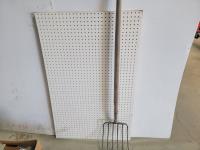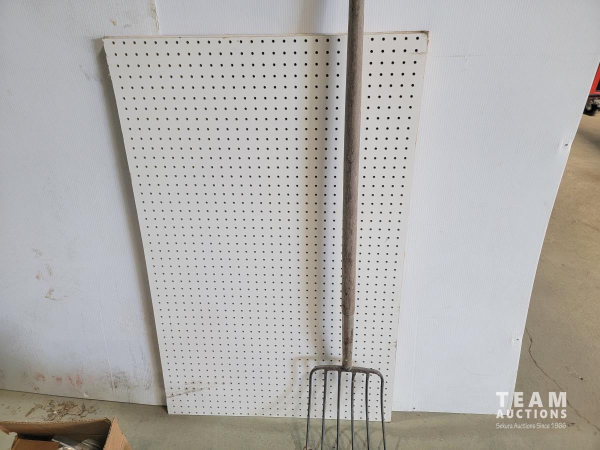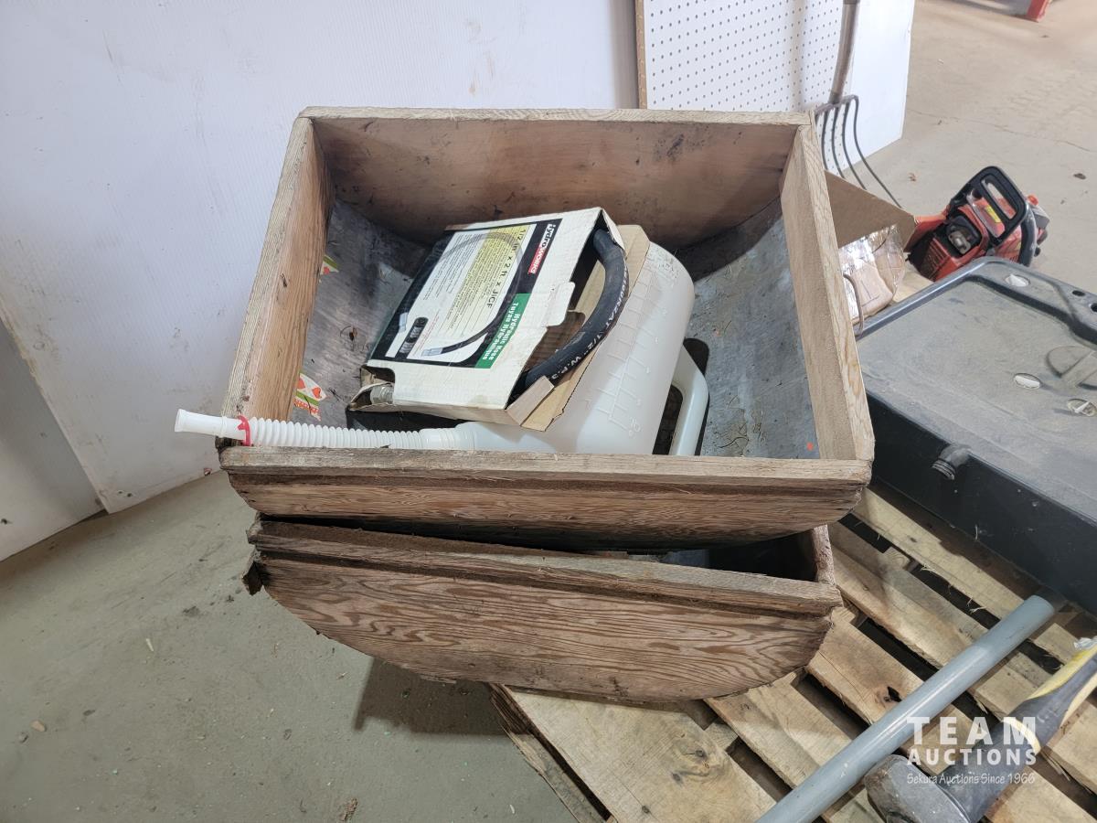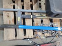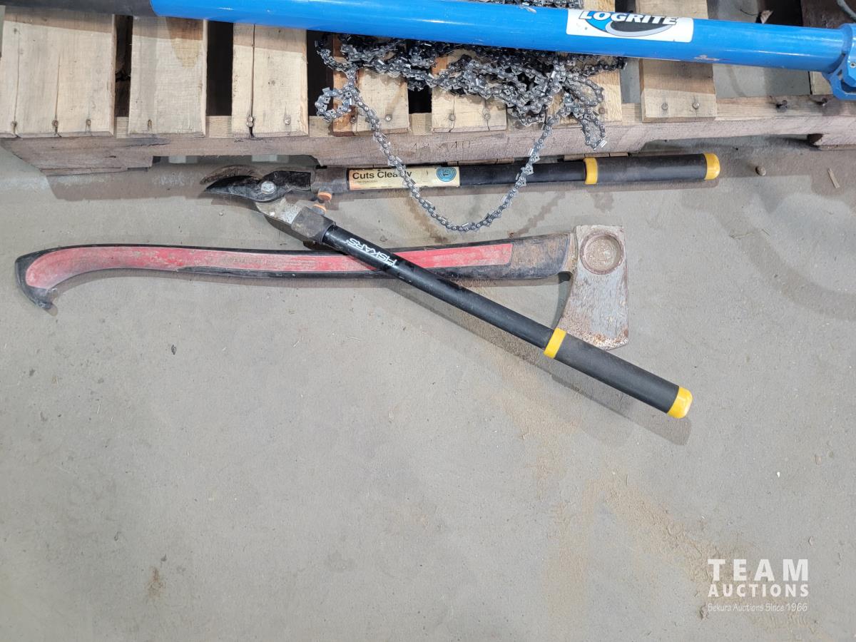 Echo Cs-370 chainsaw, axe, Fiskars branch cutter, Logrite Cant hook, 6 lb Collins axe, pitch fork, particle boards, oil drain pan