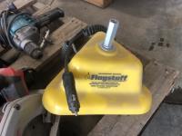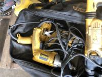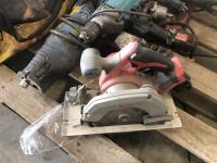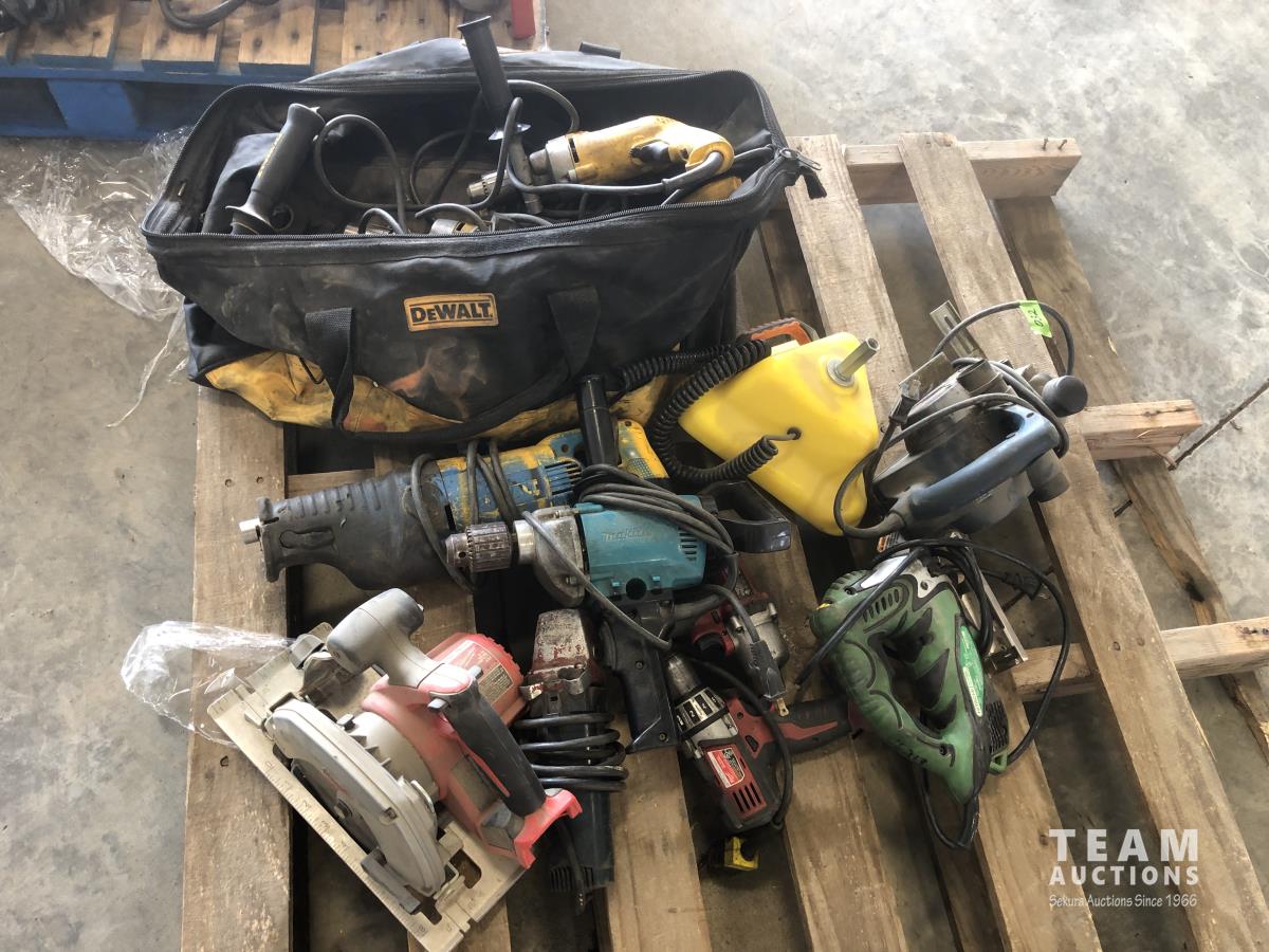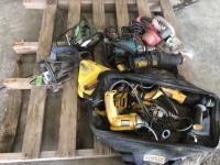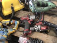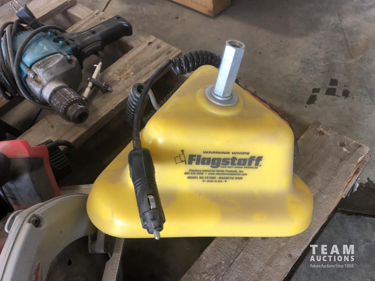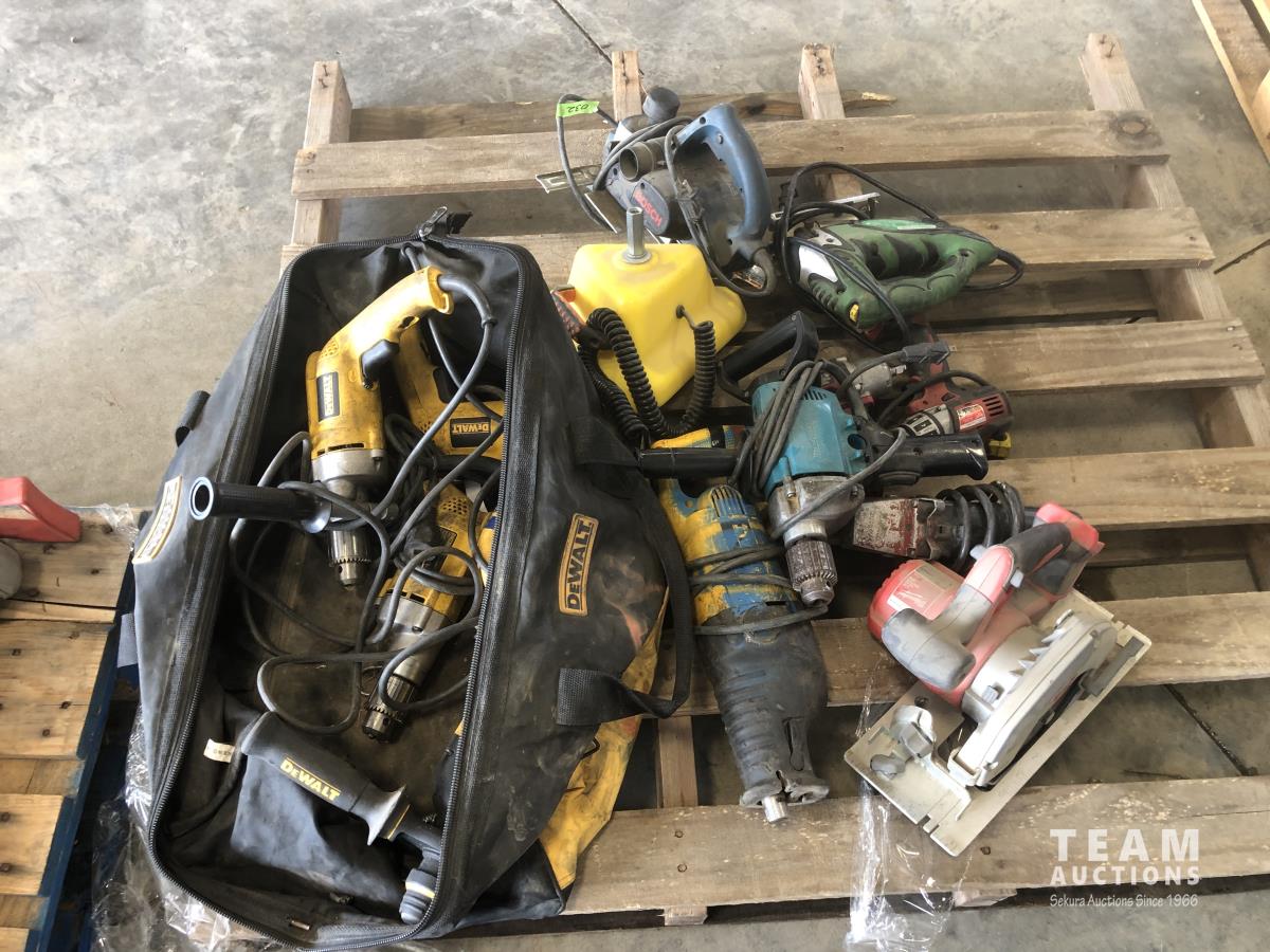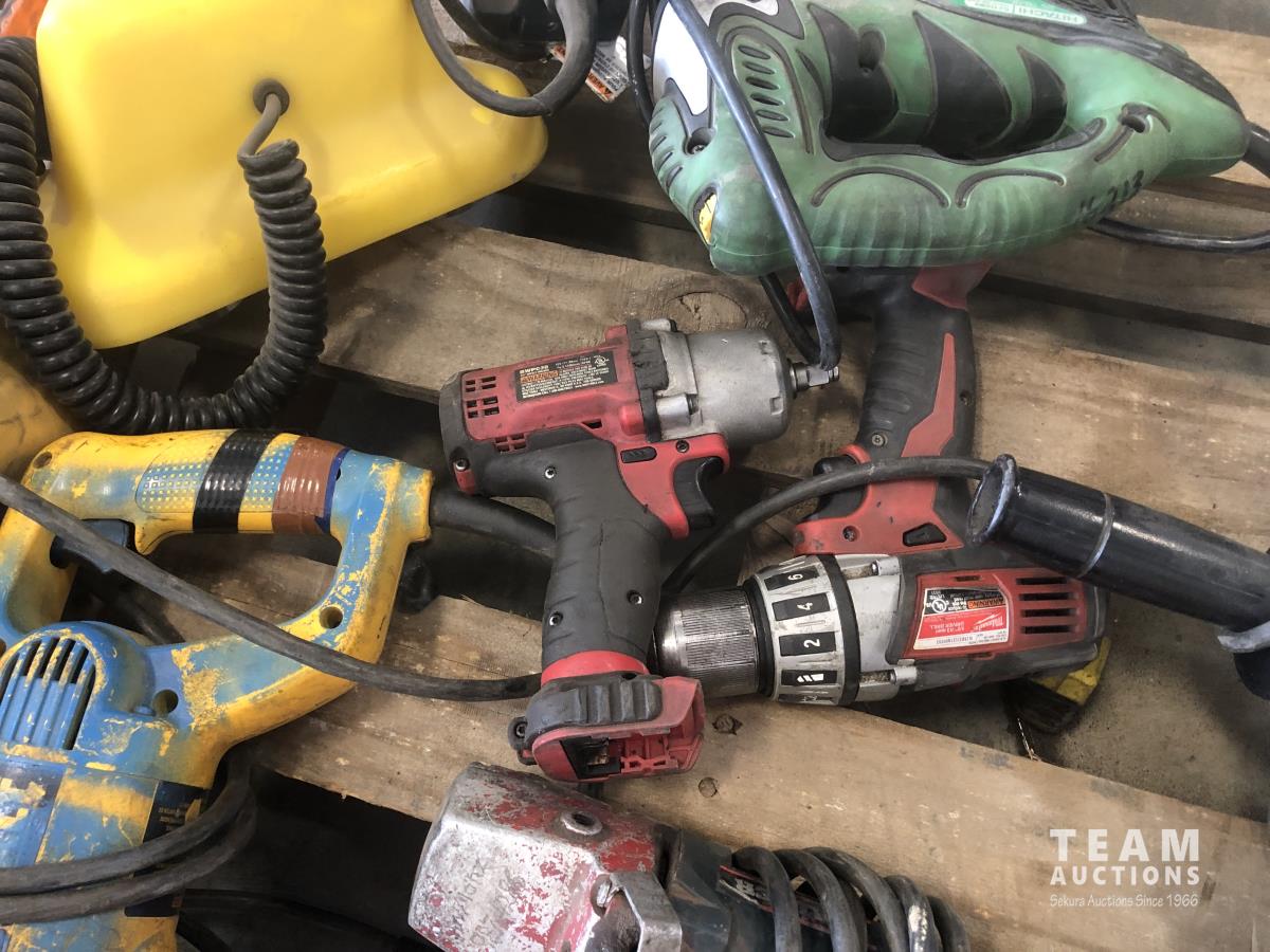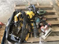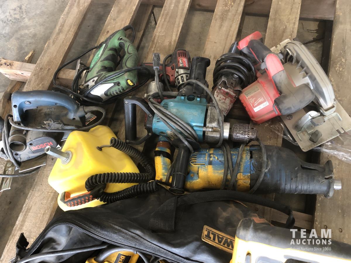 Bosch planner, Hitachi jig saw, Makita hammer drill, (2) Milwaukee drills, (5) Dewalt drills, Flagstaff whip holder, Milwaukee 6-1/2 inch circular saw and angle grinder