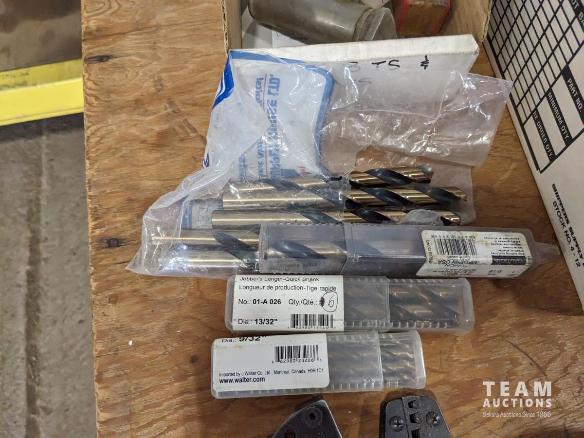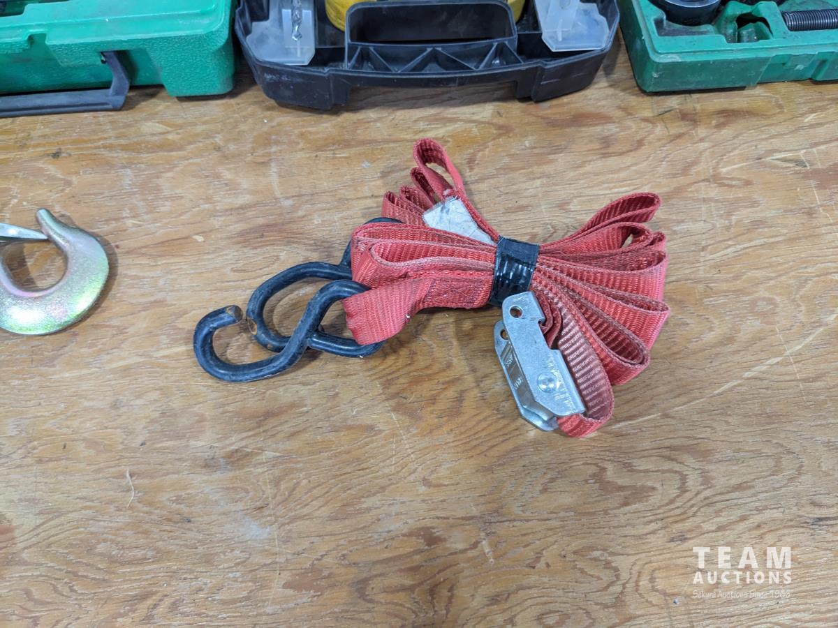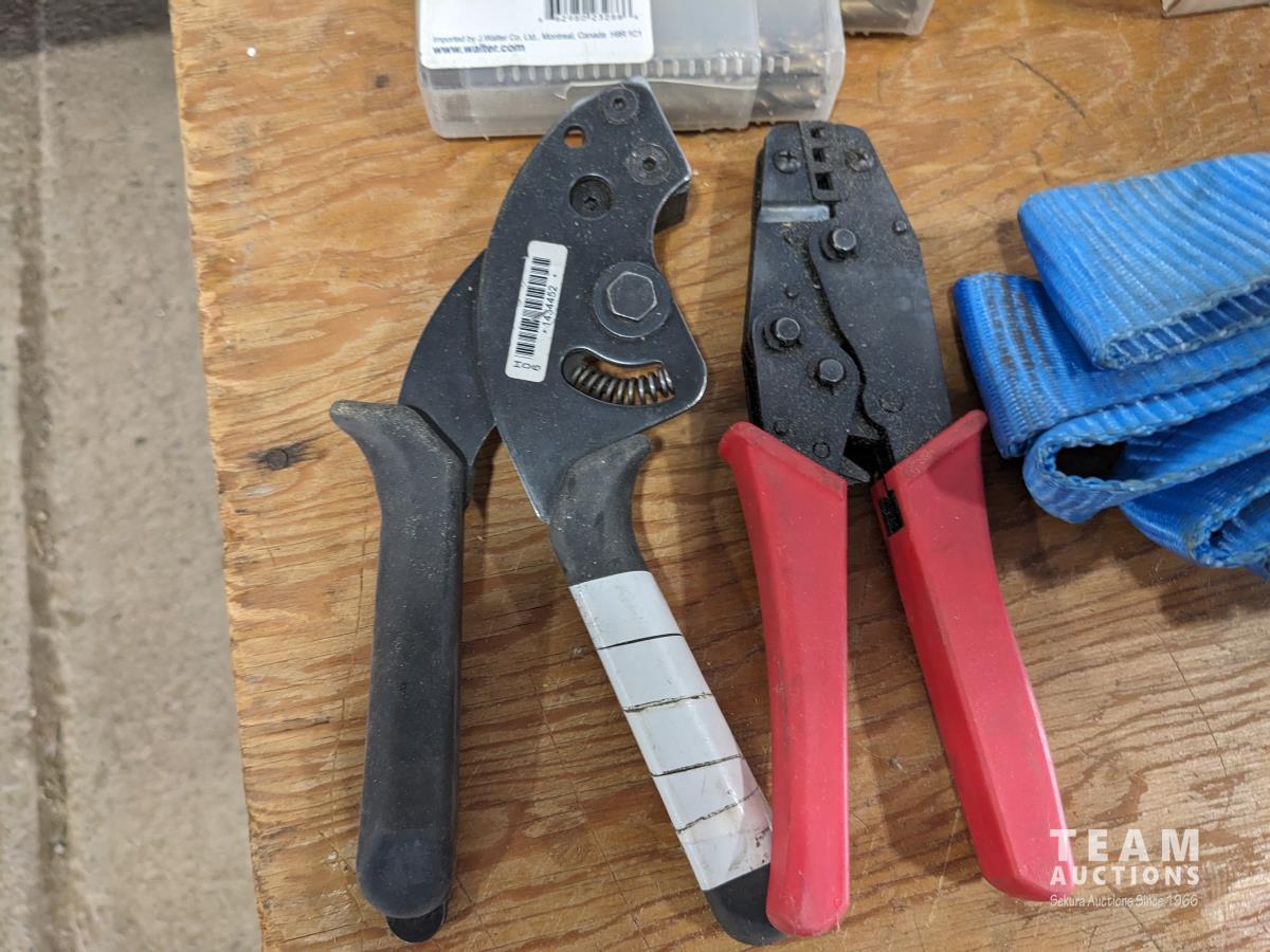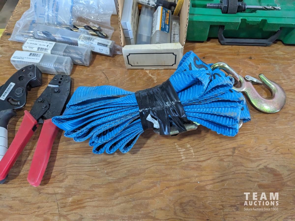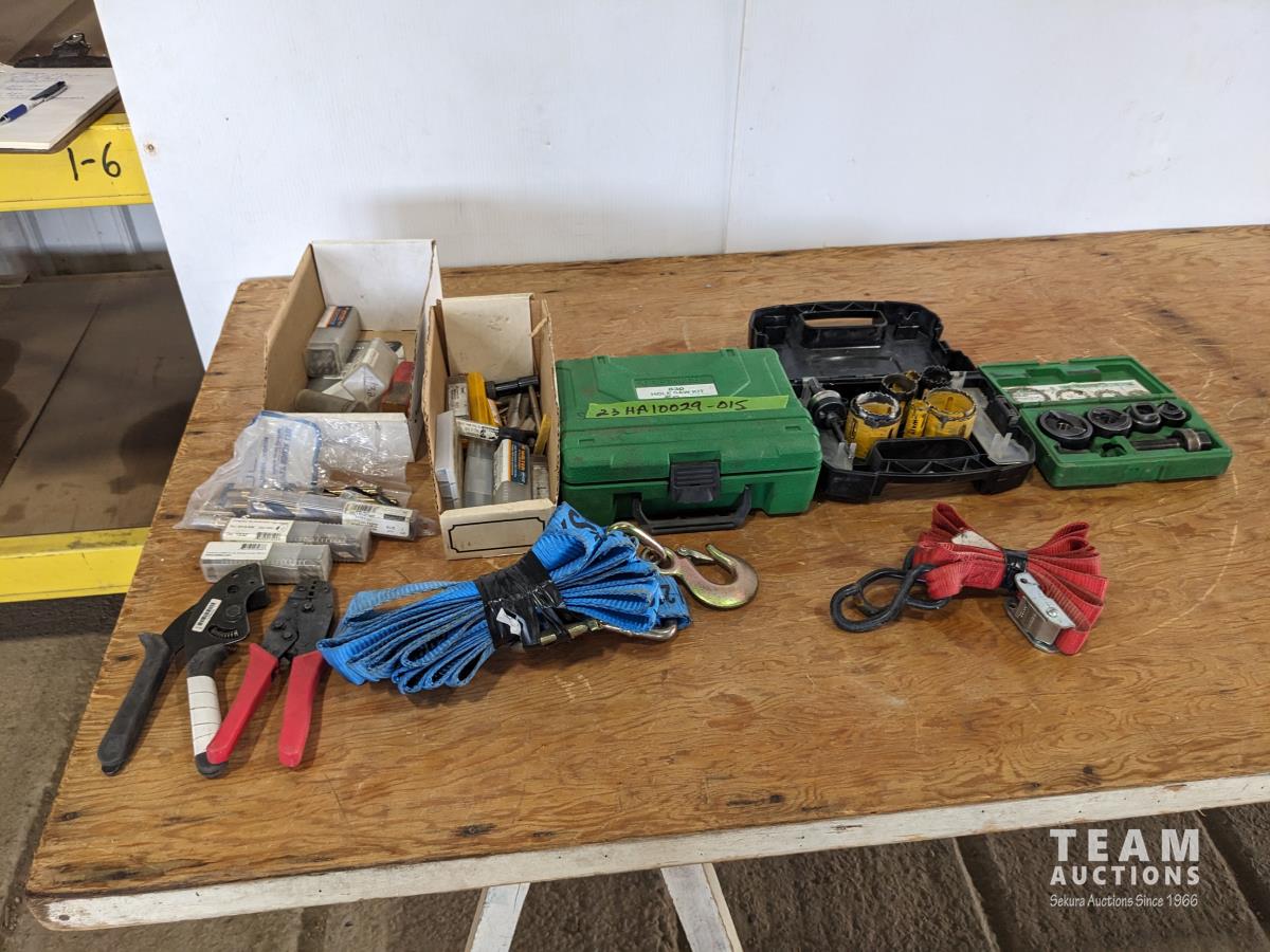 (2) hole saw kits, knock out punch set, miscellaneous drill bits, crimping pliers, assorted taps, (2) straps