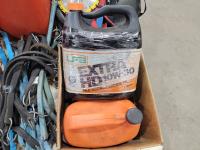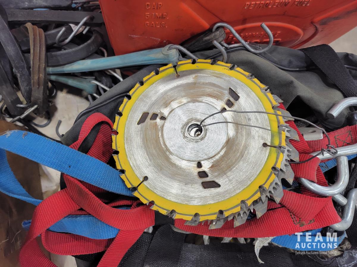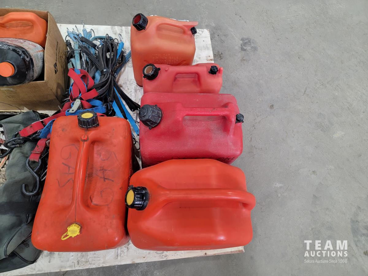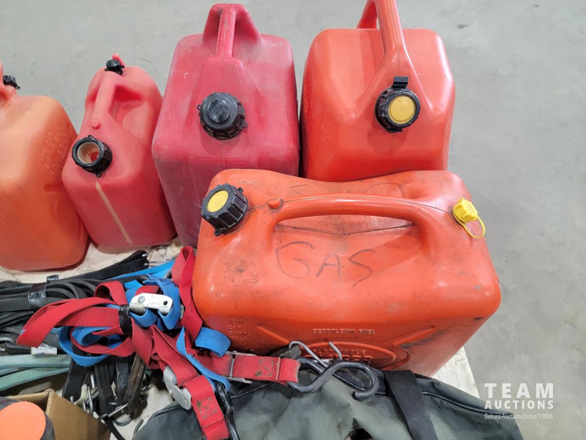 (5) Jerry cans, large qty of bungee cords, (6) saw blades, bag of assorted rope and (2) extra HD 10w-30 oil jugs