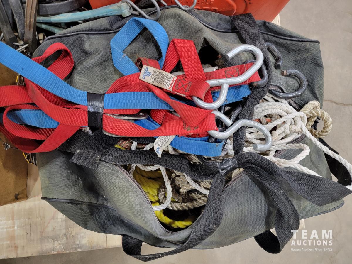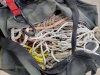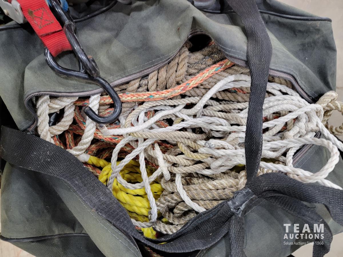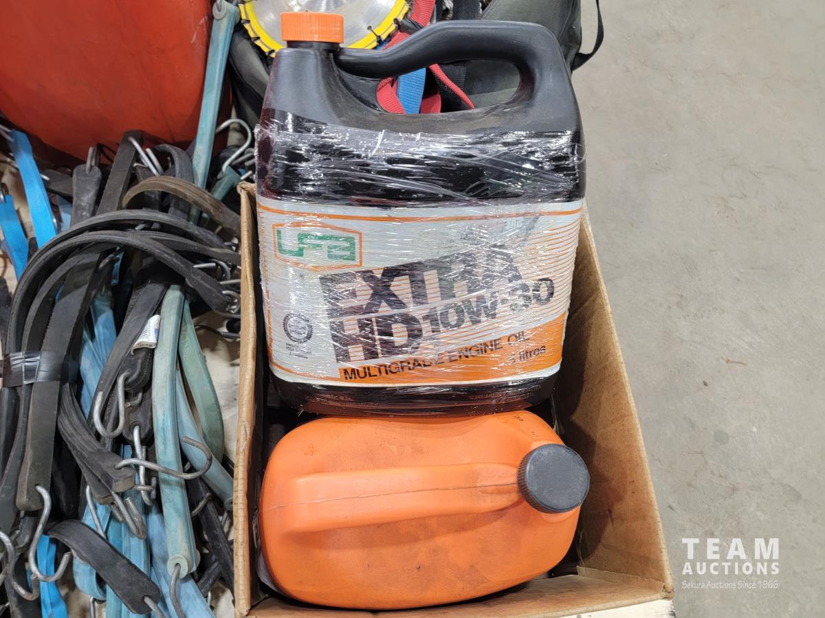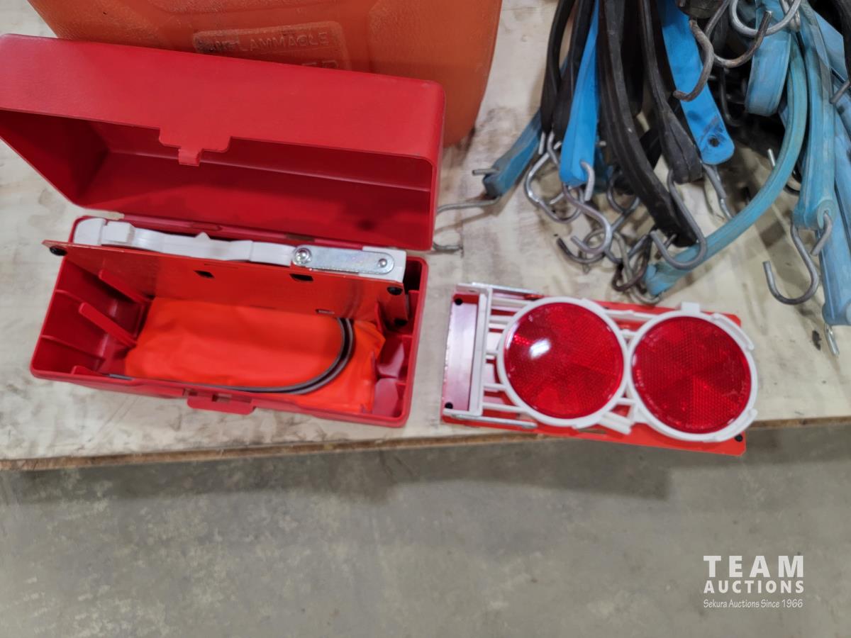 (5) Jerry cans, large qty of bungee cords, (6) saw blades, bag of assorted rope and (2) extra HD 10w-30 oil jugs