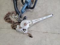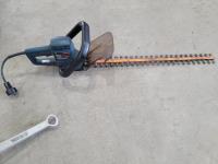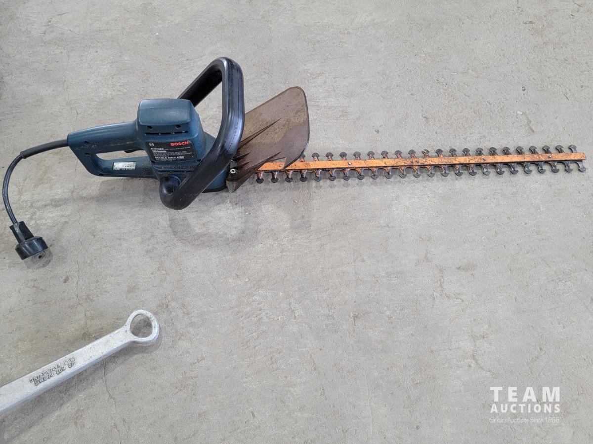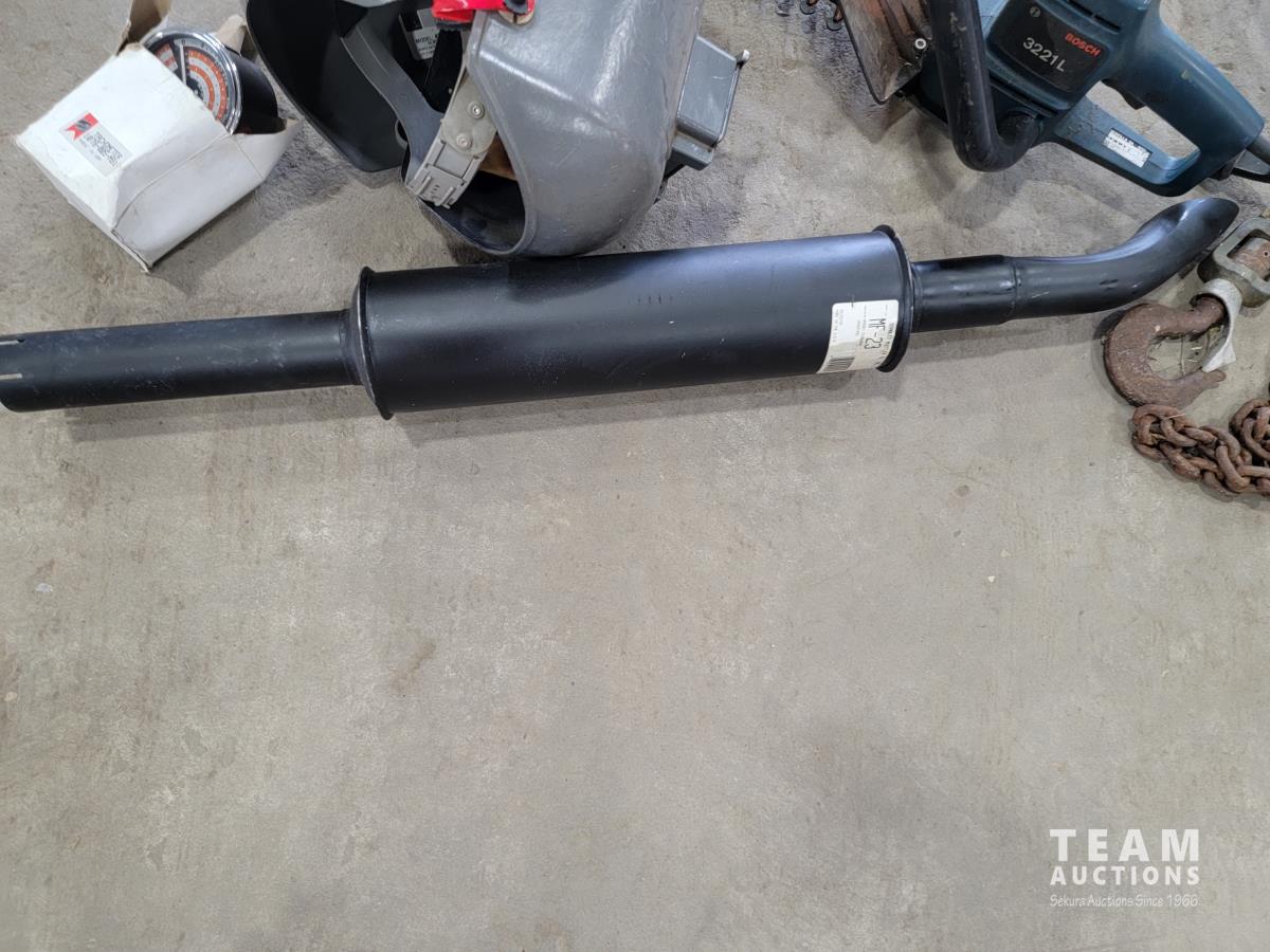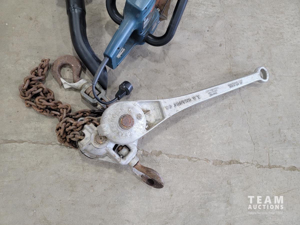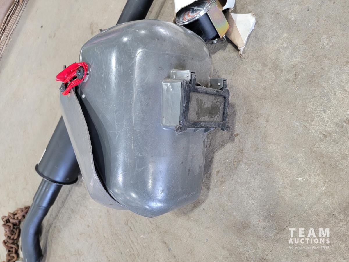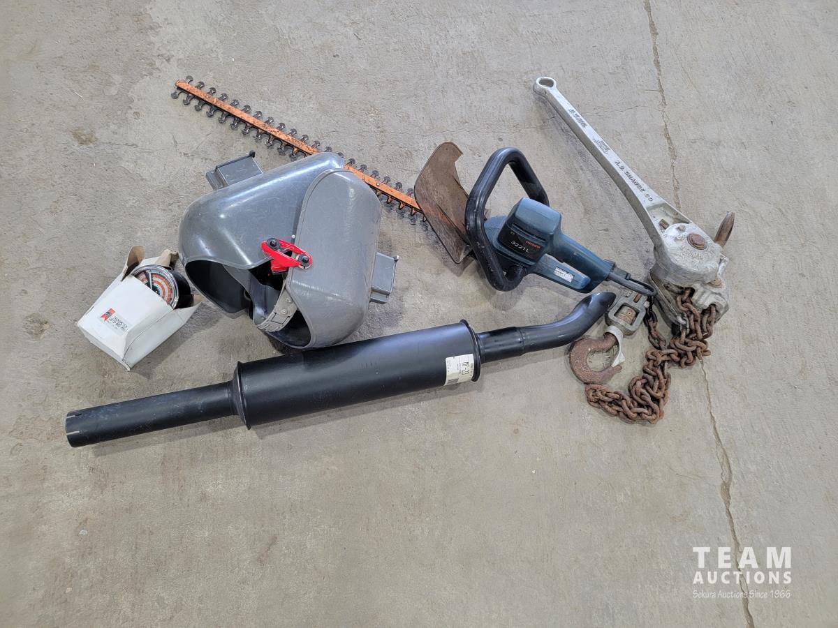 Stanley muffler, Bosch 3221 L hedge trimmer, (2) welding helmets, 2 ton chain hoist and tachometer