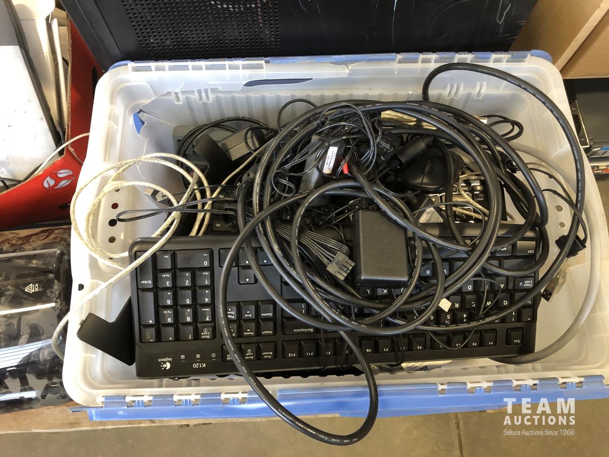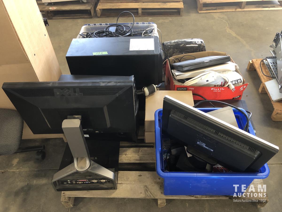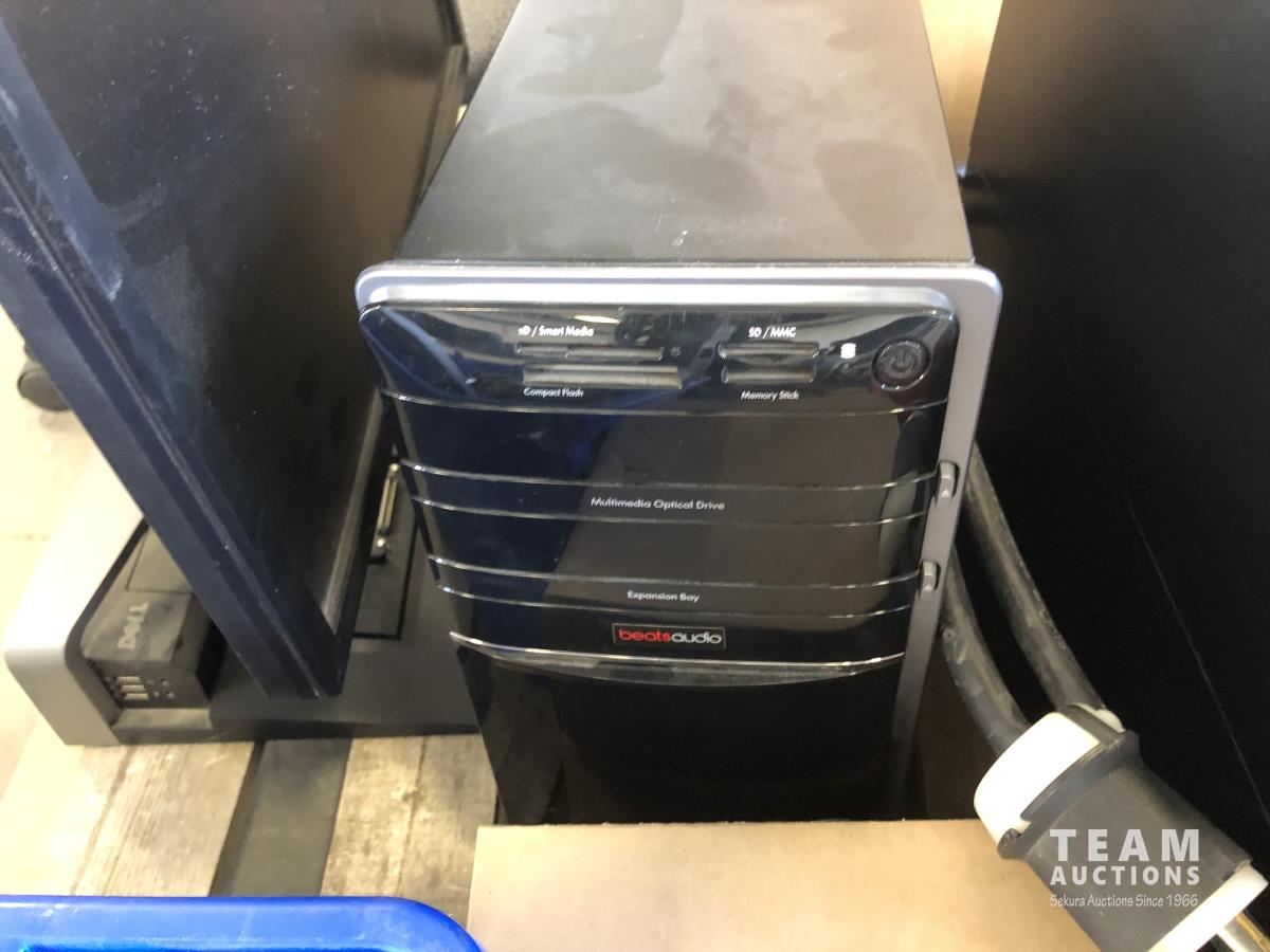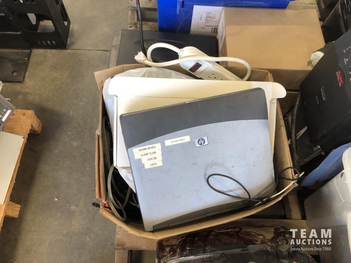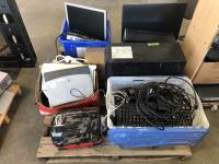 Computer keyboards and hardware, hand towel dispenser, APC desktop computer, (2) monitors, HP laptop, HP desktop computer, miscellaneous computer items