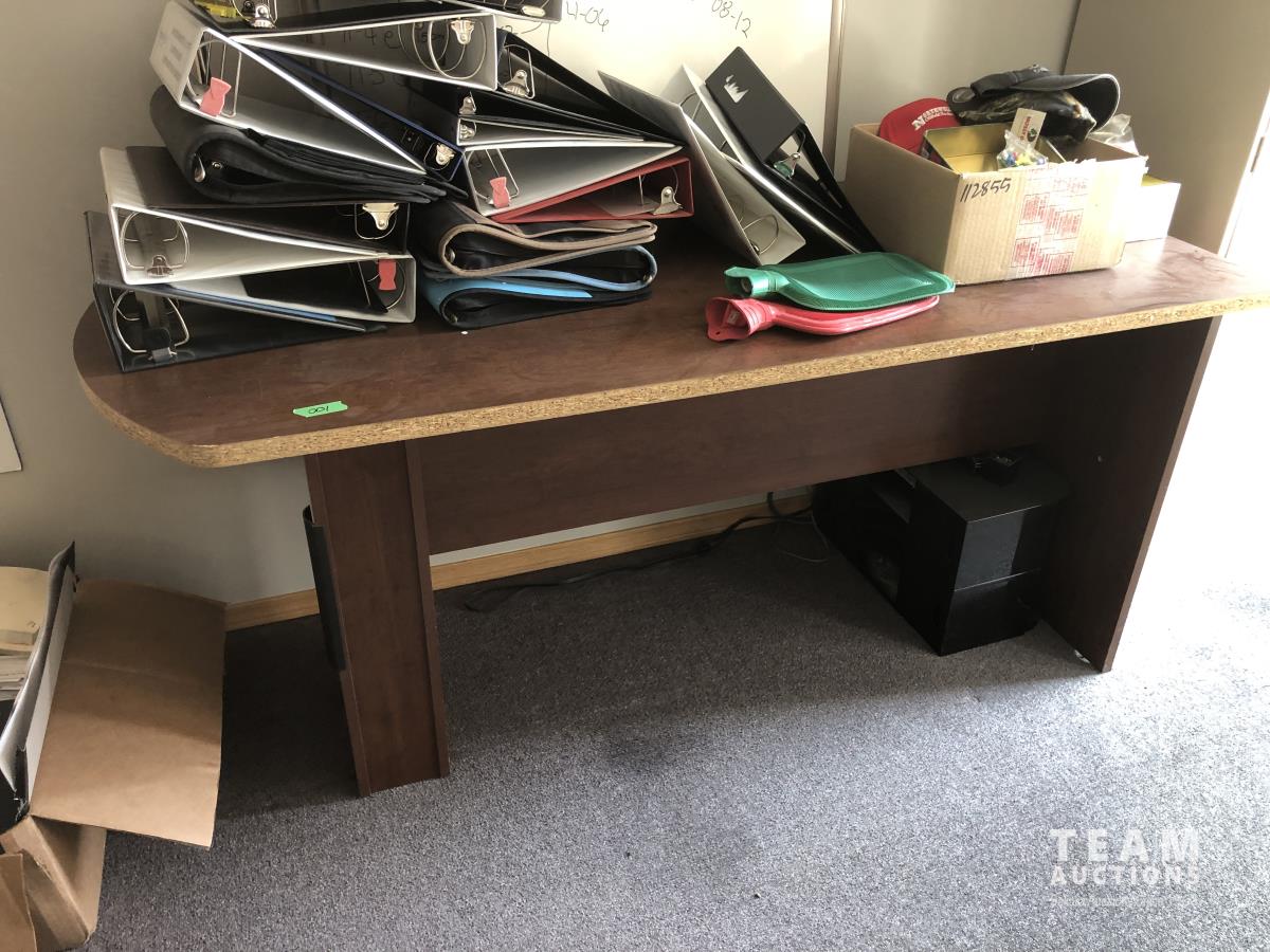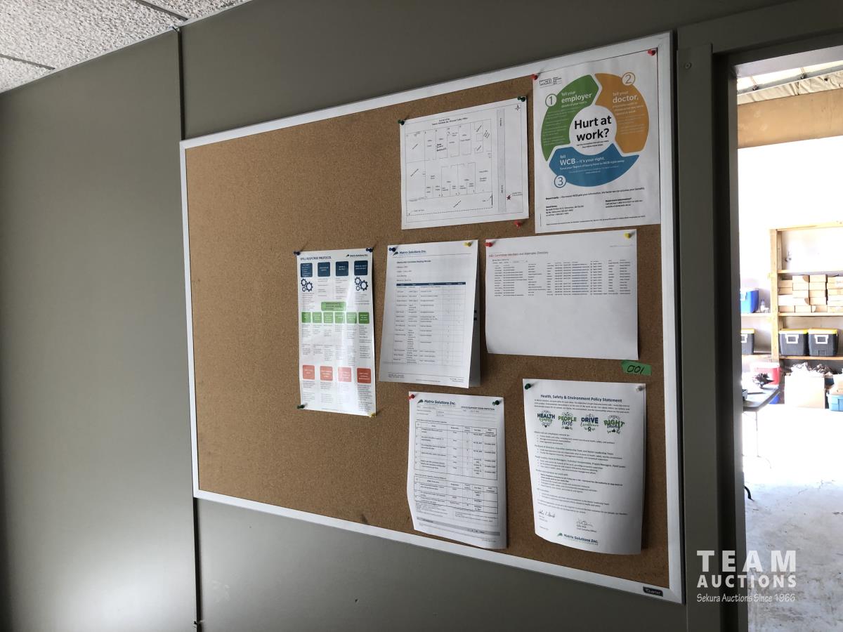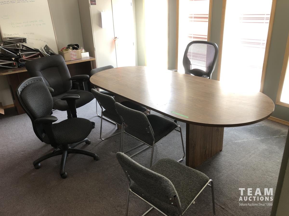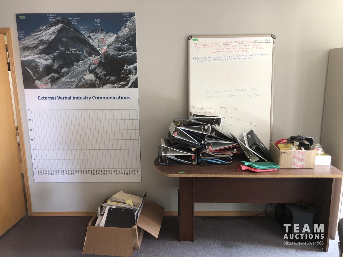 Office Table: 93.5 inch l x 43.5 inch w x 29 inch h, (7) chairs, whiteboard: 34 inch x 48 inch, corkboard: 36 inch x 48 inch, office desk: 65 inch l x 28 inch w x 30 inch h, assortment of ring binder files, cabinet: 35.5 inch l x 22 inch d x 65 inch h, miscellaneous office equipment, styrofoam graph chart