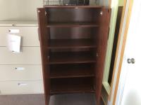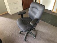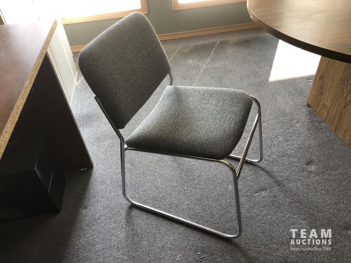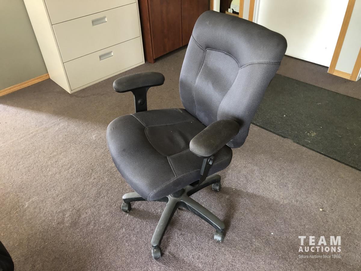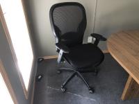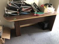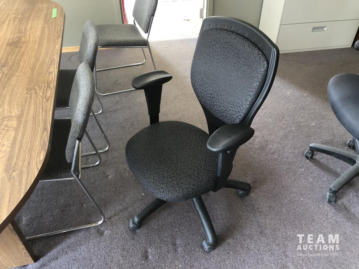 Office Table: 93.5 inch l x 43.5 inch w x 29 inch h, (7) chairs, whiteboard: 34 inch x 48 inch, corkboard: 36 inch x 48 inch, office desk: 65 inch l x 28 inch w x 30 inch h, assortment of ring binder files, cabinet: 35.5 inch l x 22 inch d x 65 inch h, miscellaneous office equipment, styrofoam graph chart