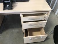 Office desk: 47 inch l x 32 inch d x 29.5 inch h, desktop section: 47 inch l x 16 inch d x 44 inch h, three drawer under desk filing cabinet, under desk keyboard tray, (2) chairs, desk side shelf: 31 inch x 31 inch, desk organizer, stapler, hole punch and tape dispenser