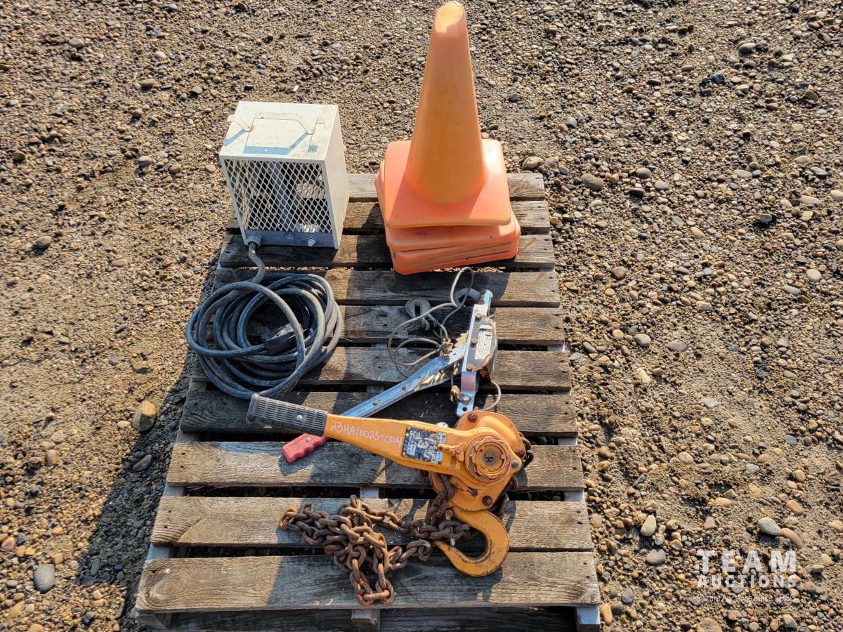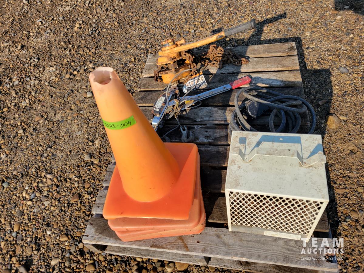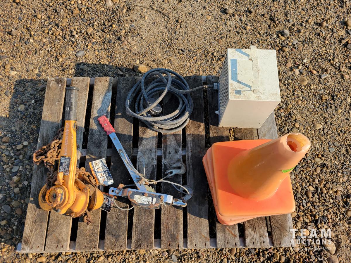 (5) traffic cones, 240v construction heater, 2 ton come-a-long, 3 ton come-a-long
