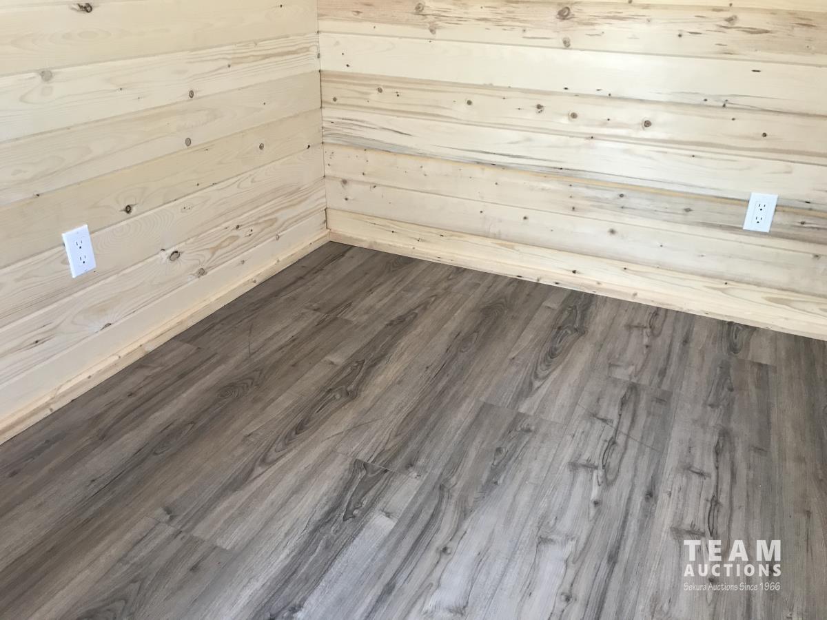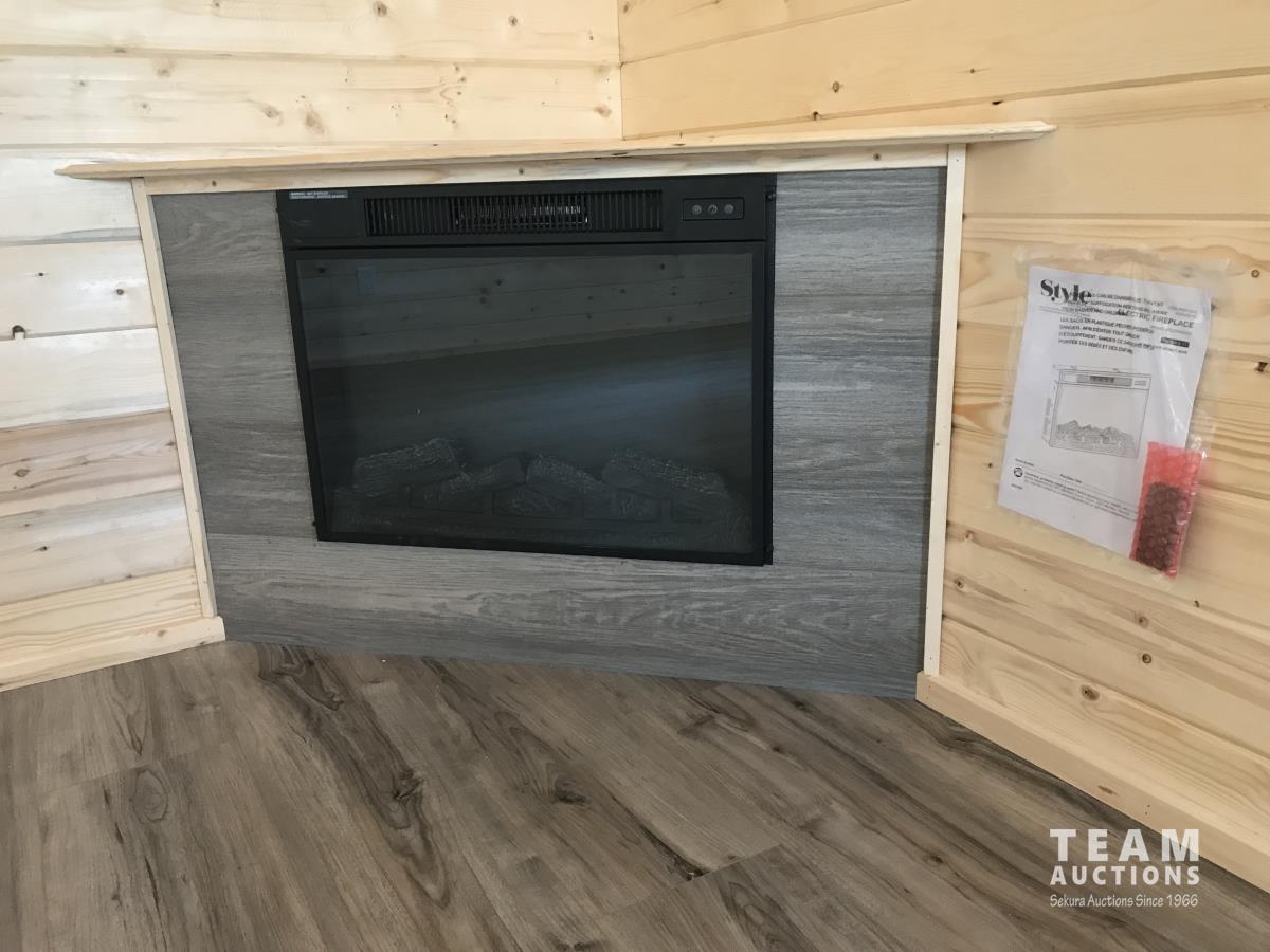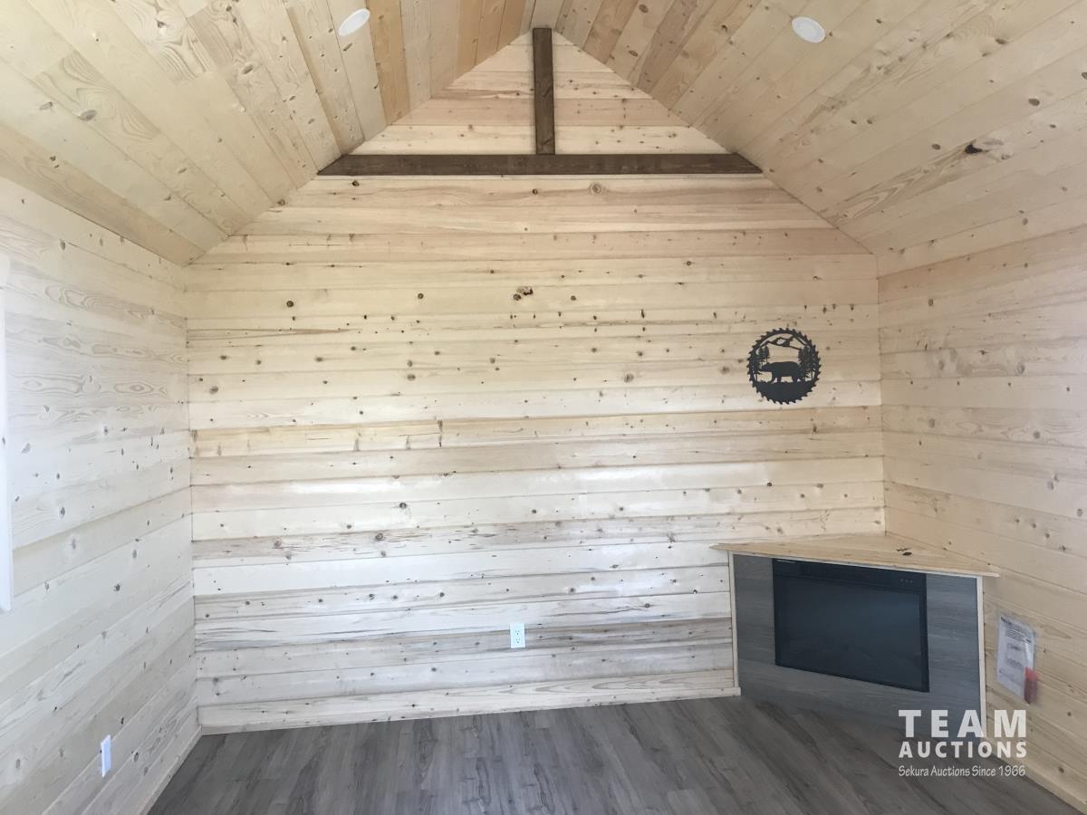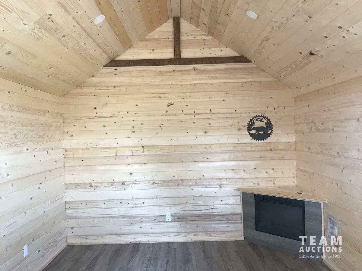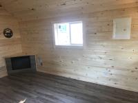 Finished inside, 100 amp service, wired, fully insulated, tin roof, electric fireplace, on treated 6X6 inch skids, built July 2023.