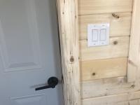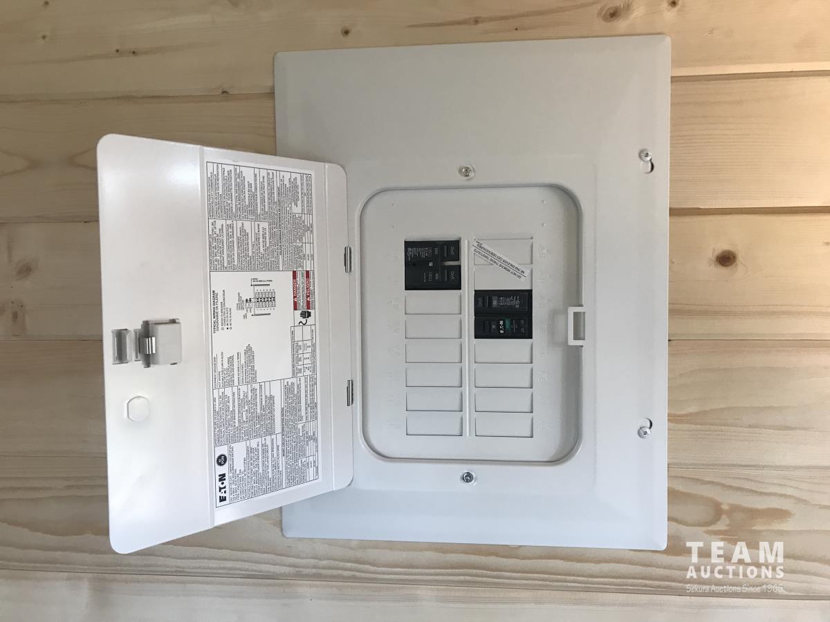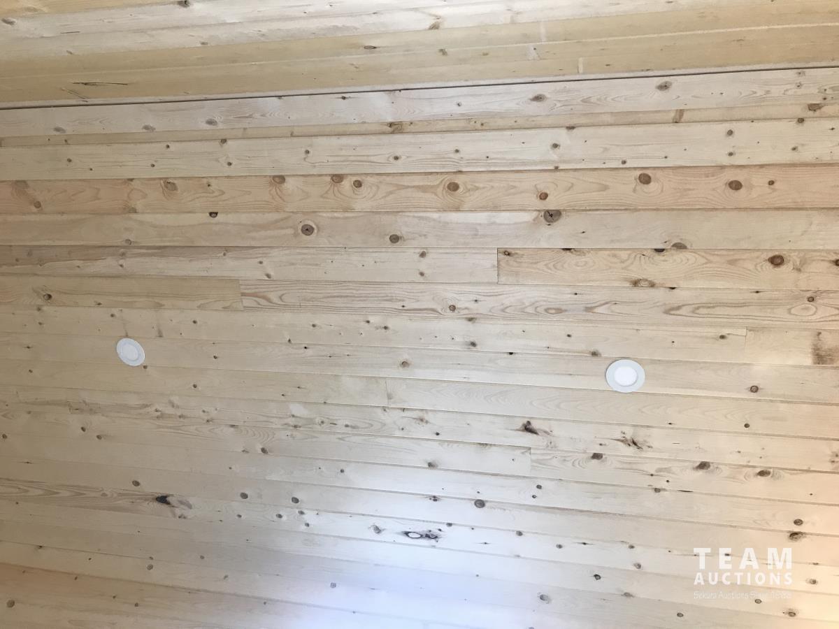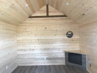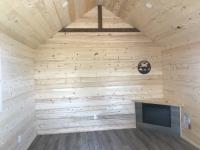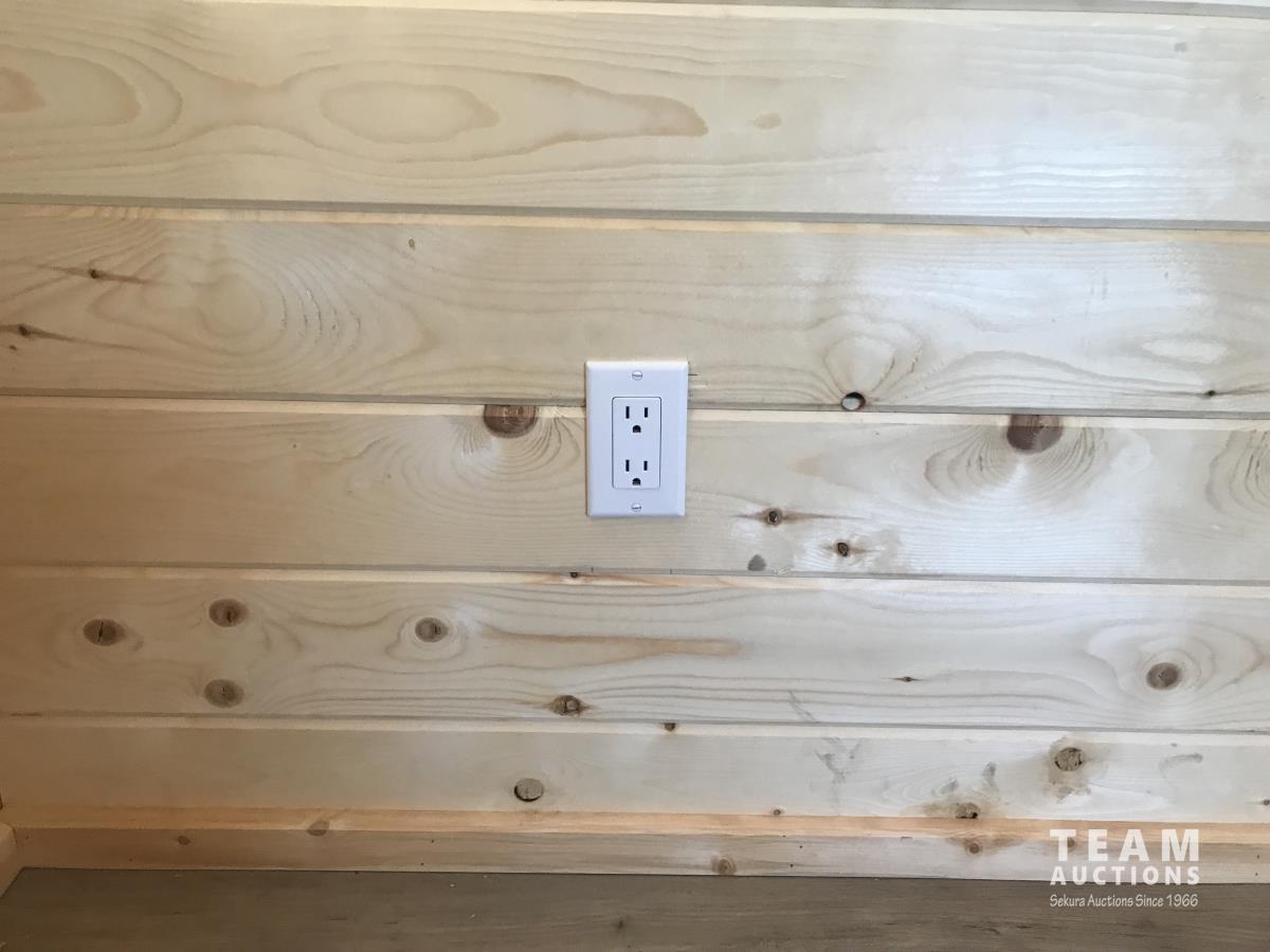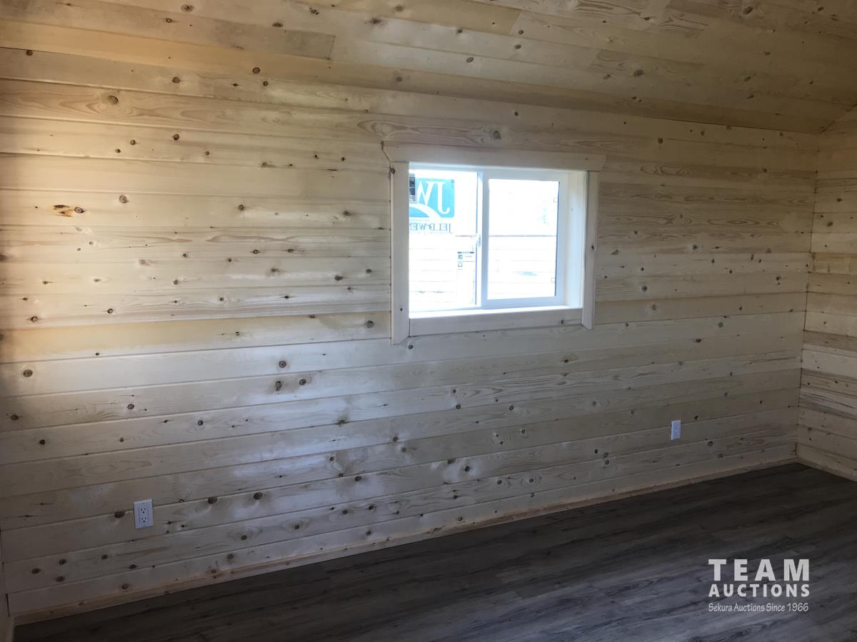 Finished inside, 100 amp service, wired, fully insulated, tin roof, electric fireplace, on treated 6X6 inch skids, built July 2023.