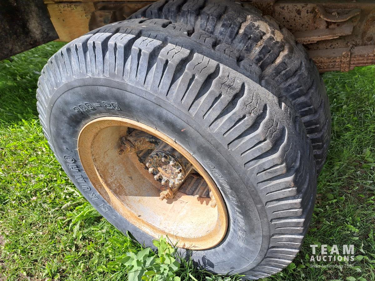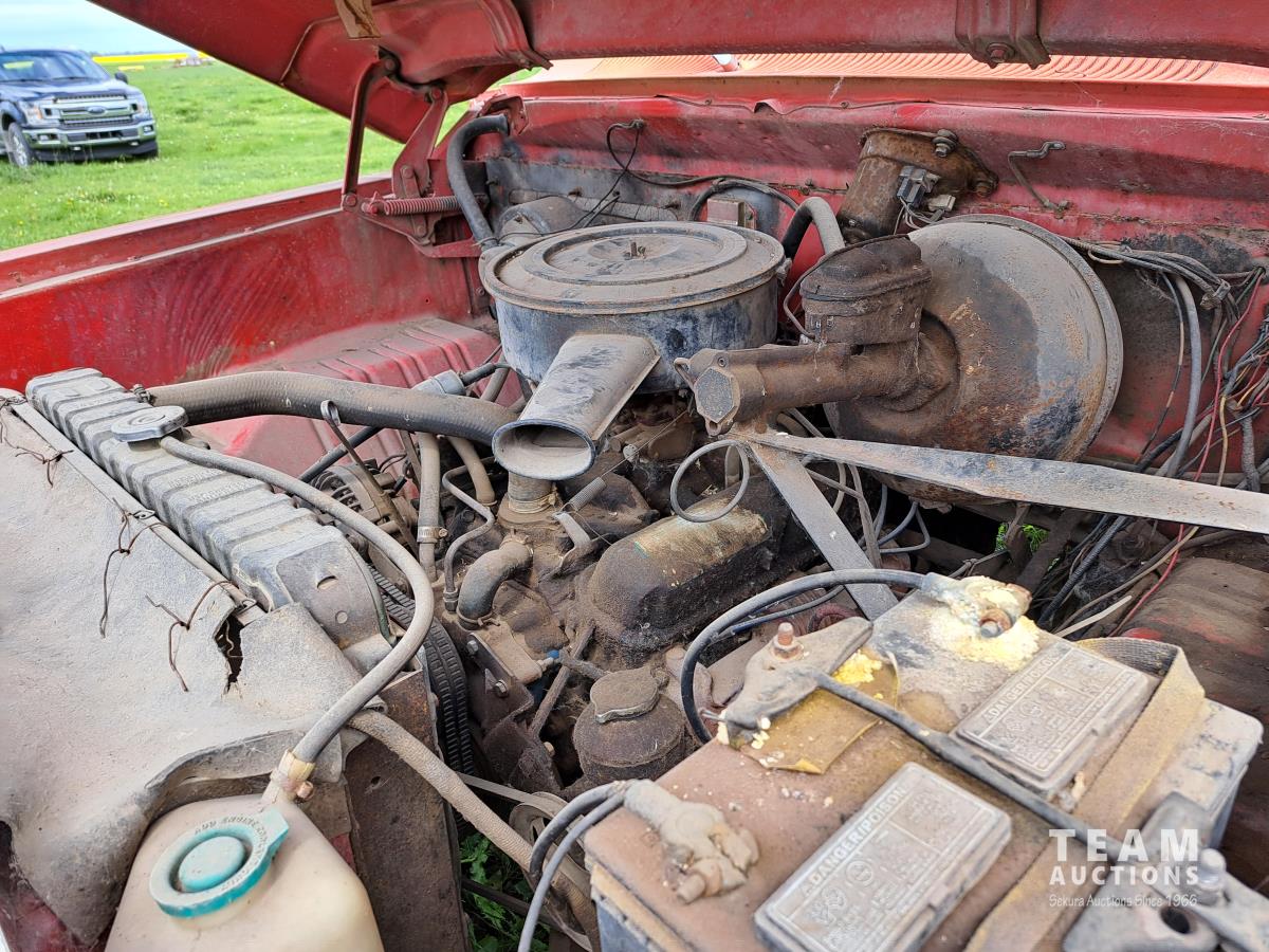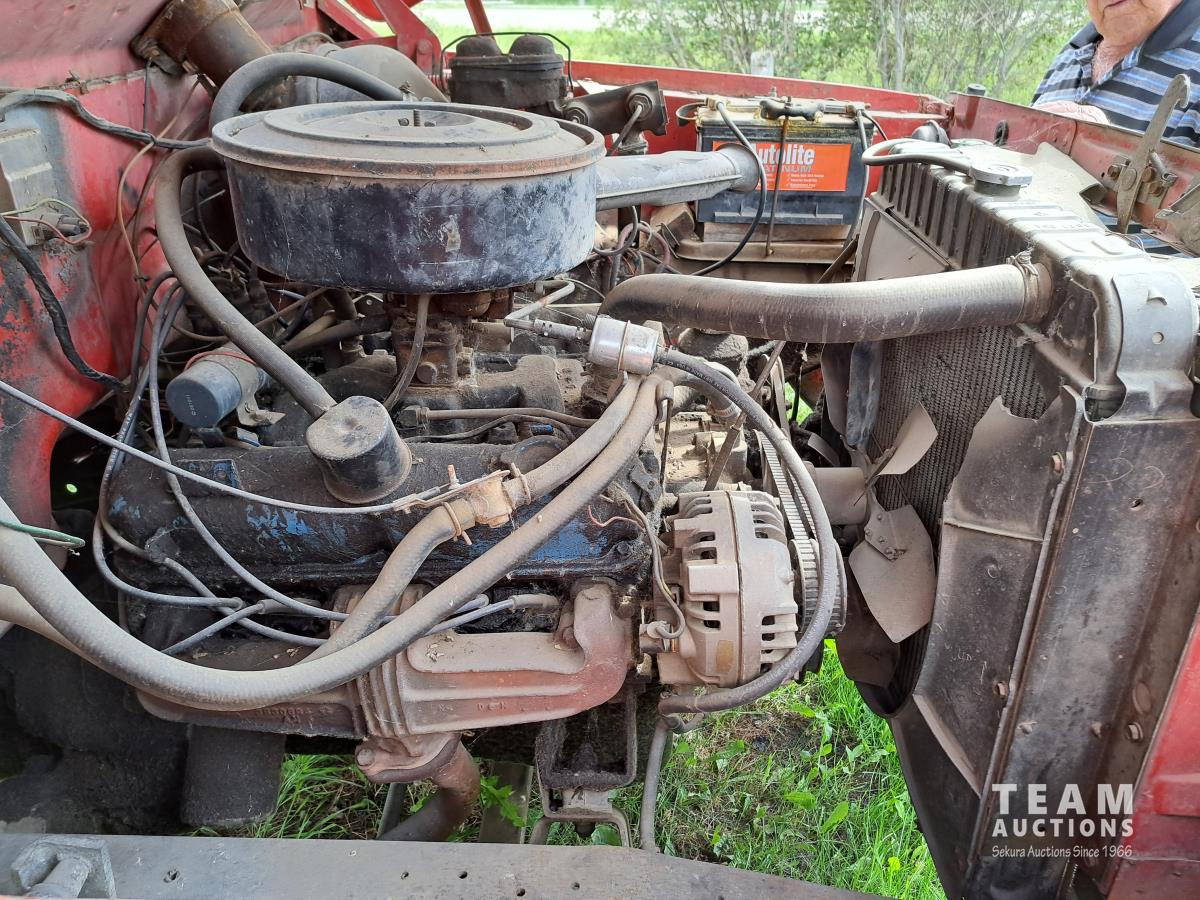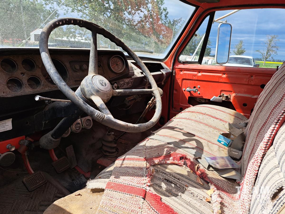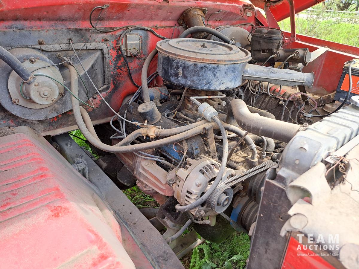 Chysler 318 cu in V8 gas engine, 16 ft box, single cylinder hoist, spring suspension, 9.00-20 tires