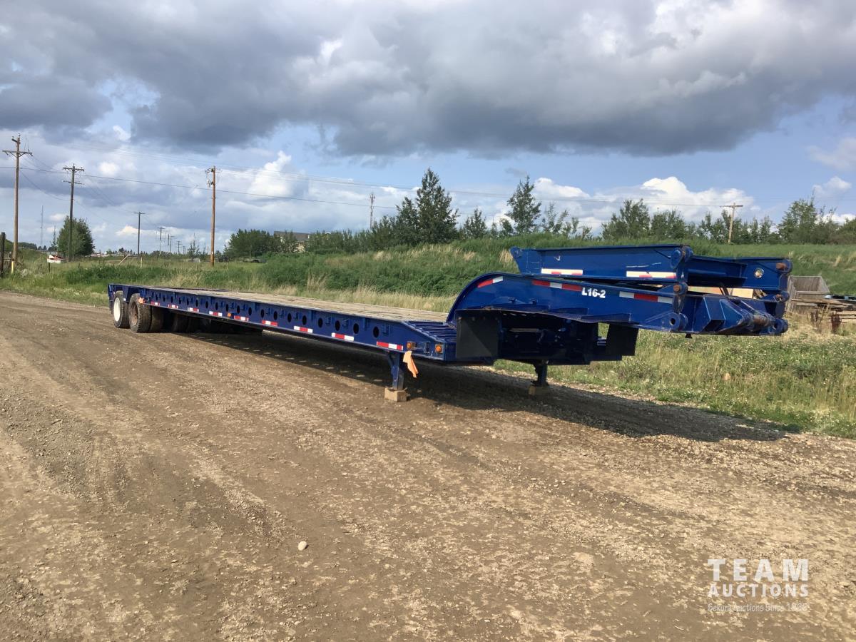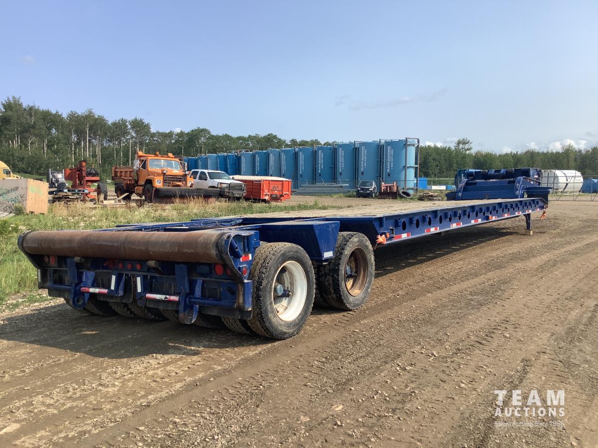 Mechanical detachable neck, flip neck extension for tandem jeep, 10-1/2 wide deck, 48 ft long main deck, rear live roll and (2) air lift live kicker rolls, pin pockets, wide load lights, 275/70R22.5 tires