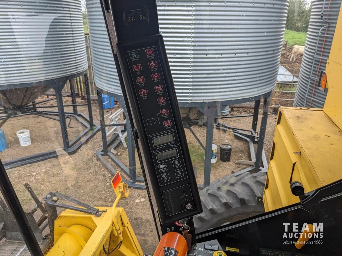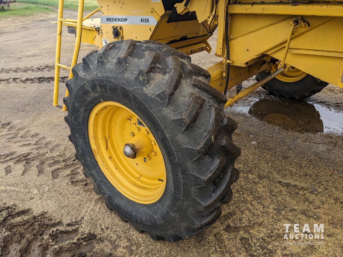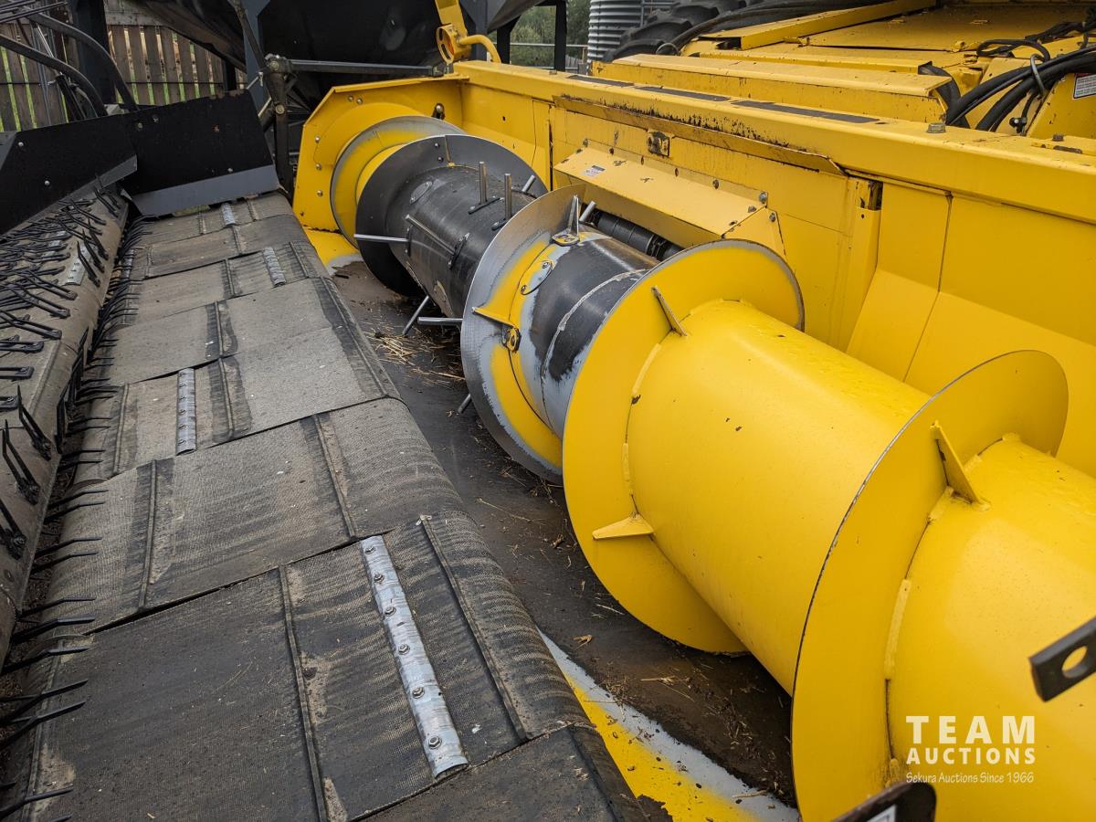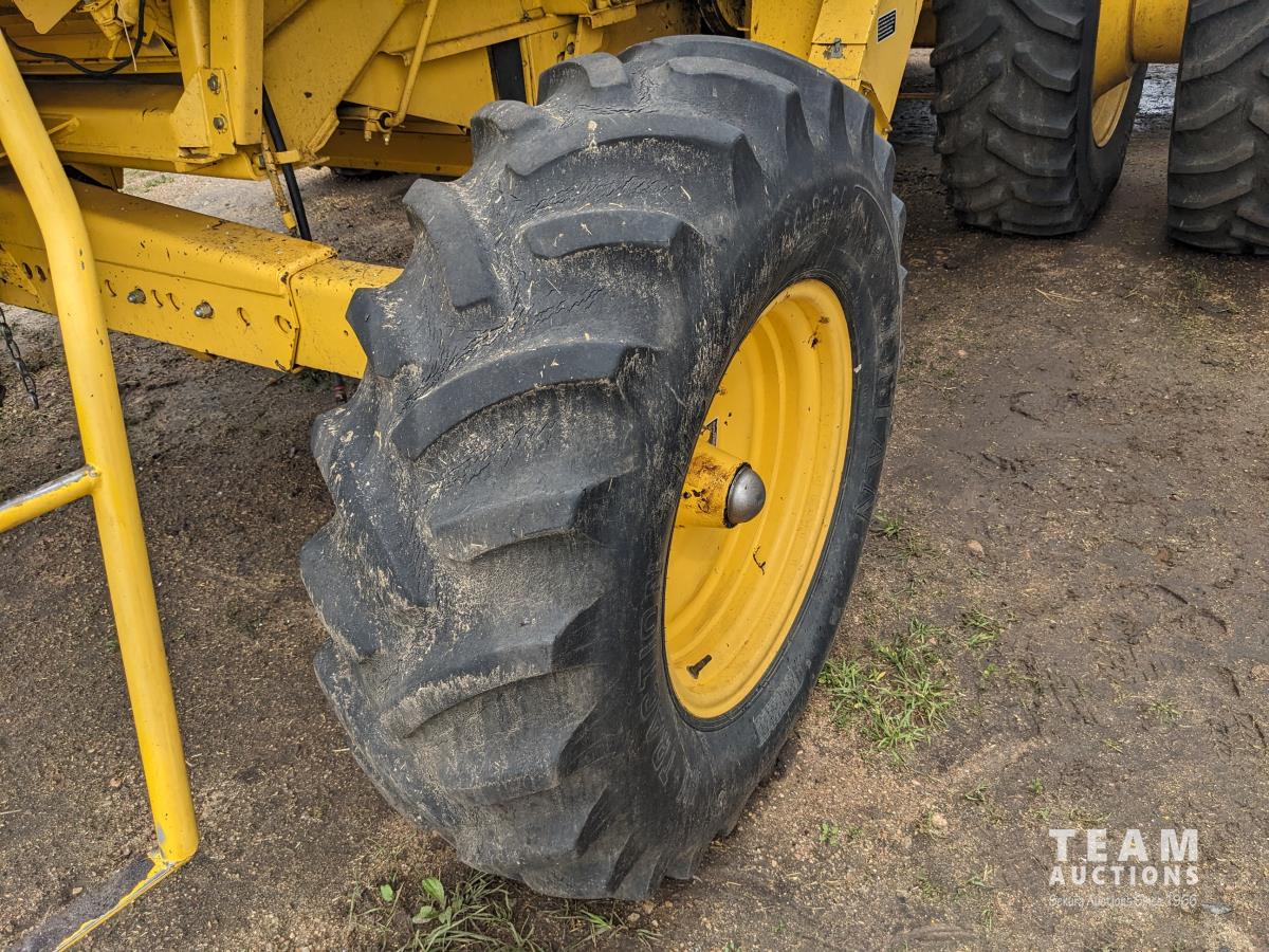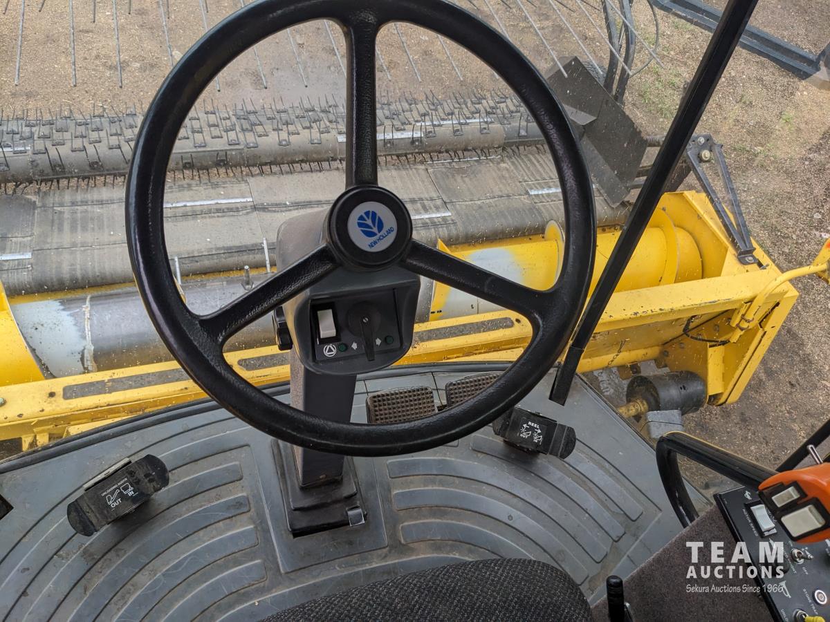 New Holland 14 ft pick-up header, reverser, rock trap, Swath Master pickup, Big Top hopper extension, Redekop 4150 chopper, A/C, buddy seat, 18.4R42 front tires, duals, 14.9-24 rear tires