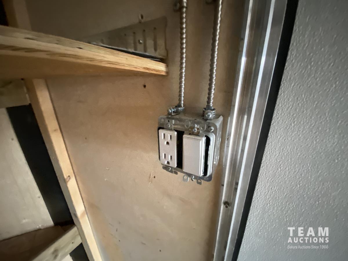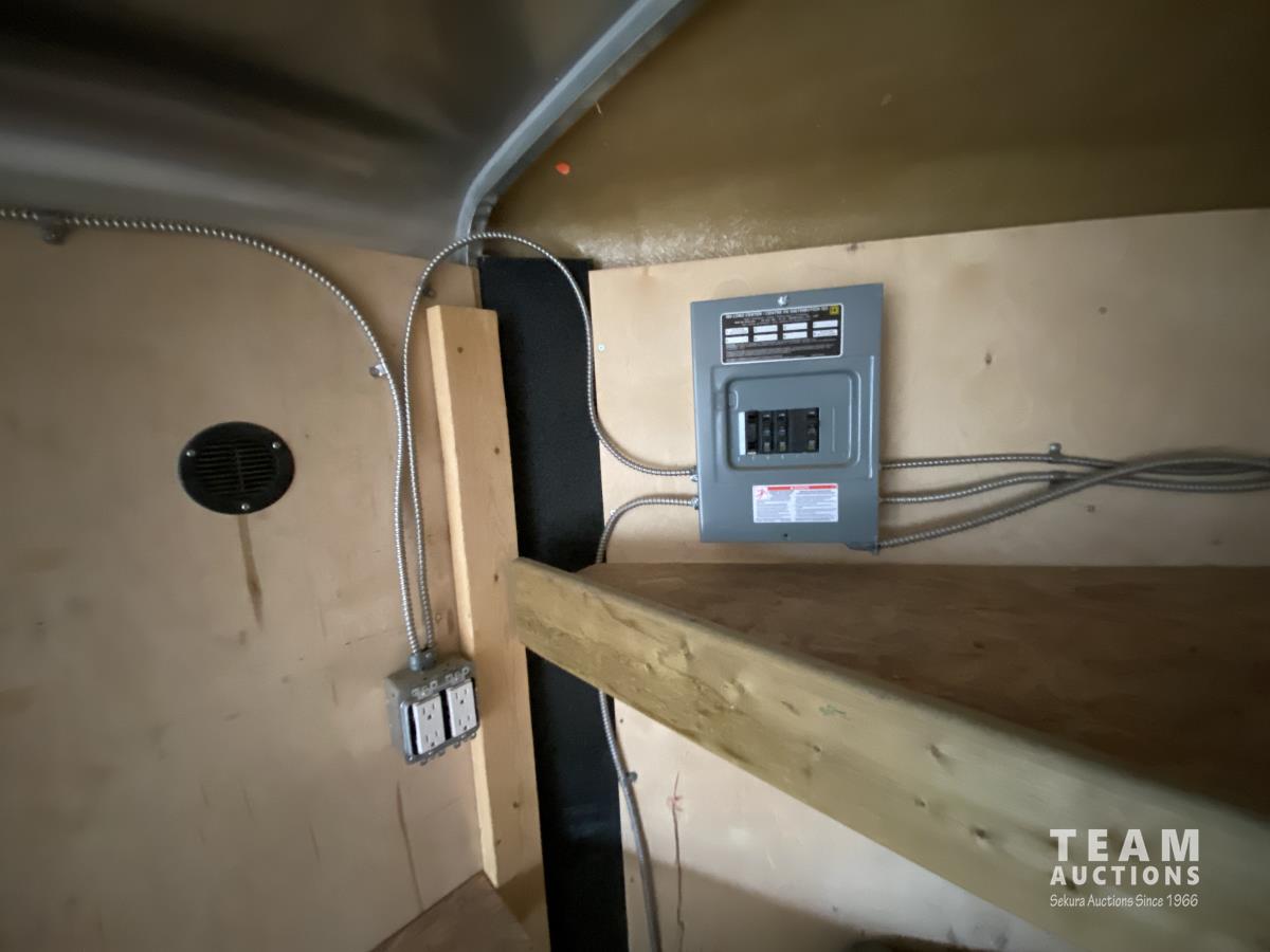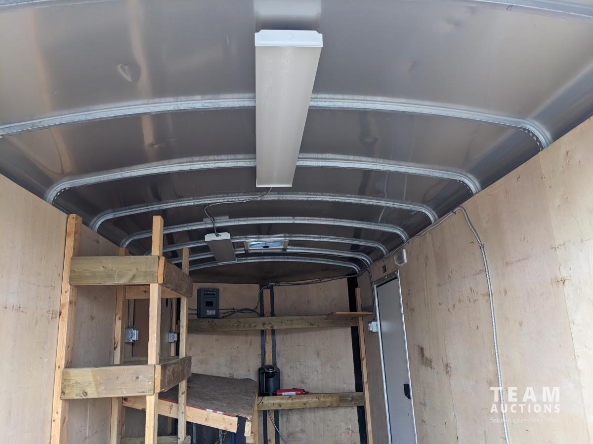 81 inch interior width, 83 inch interior height, ball hitch, side door, barn doors, electric brakes, torsion suspension, fully wired, interior lighting, wood finish w/ custom racks and table, 3500 lb axles, 205/75R15 tires