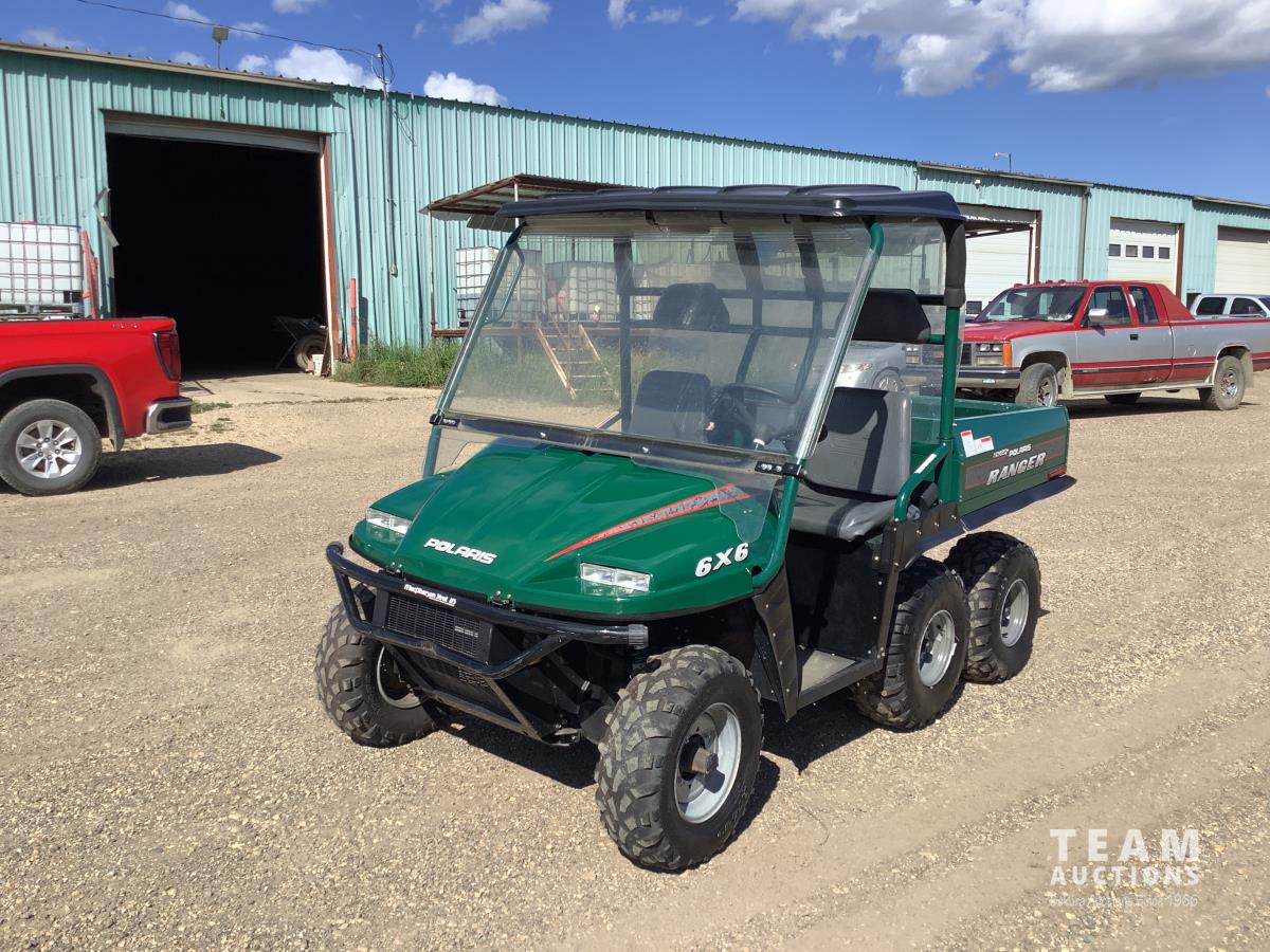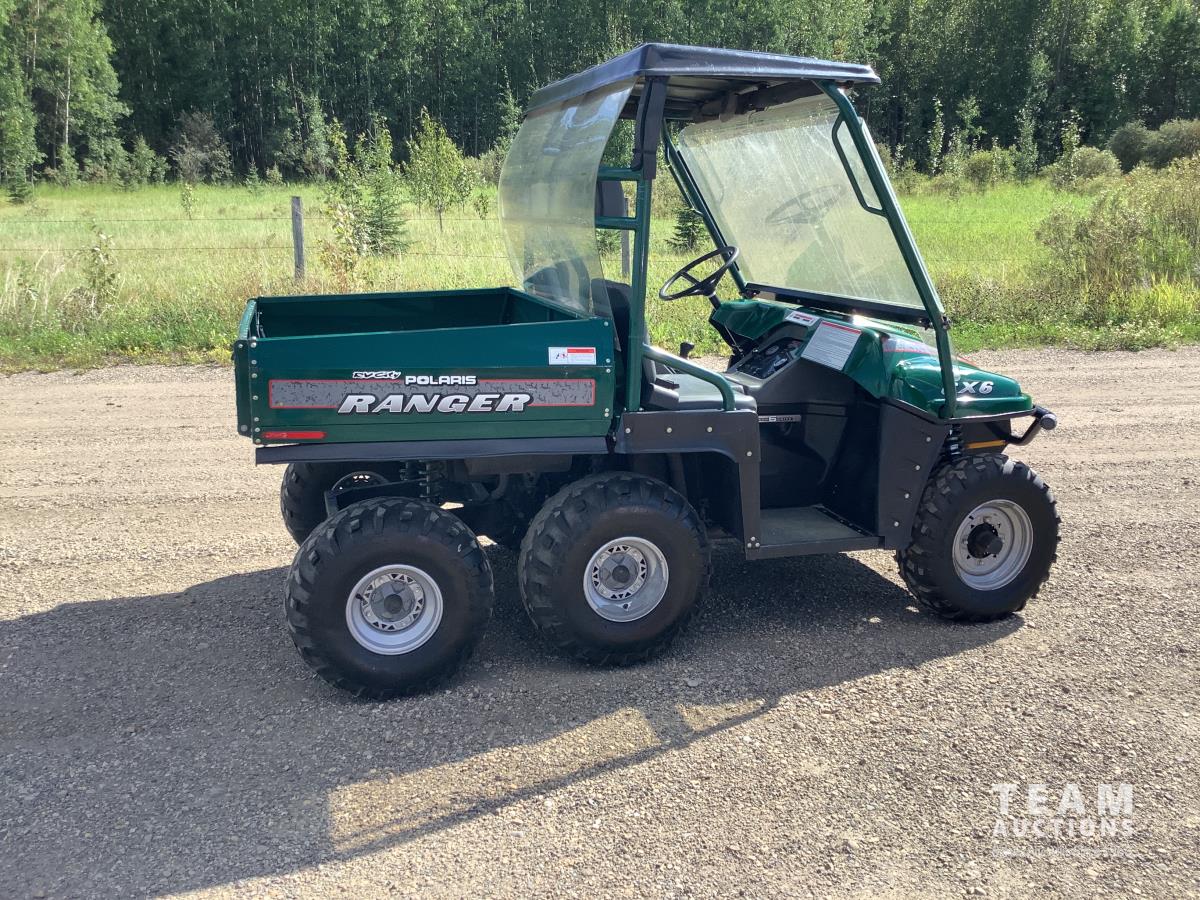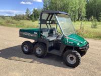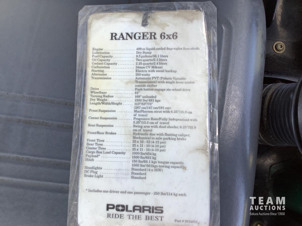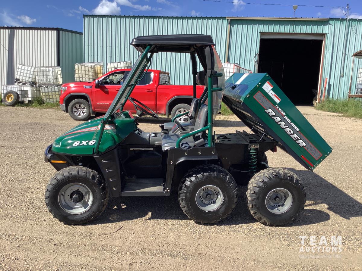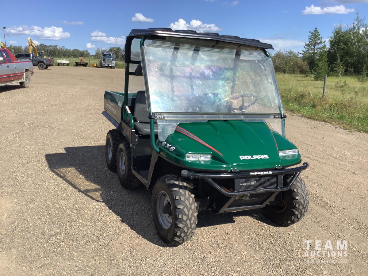 500 cc, liquid cooled, four valve, four stroke engine, electric start new battery, back up recoil start, 36 liter fuel tank, CV Mikuni carb, automatic Polaris Variable Transmission with centre console shift, push button engage 6 wheel drive, hydraulic disc brakes, full independent suspension, tilt dump box
