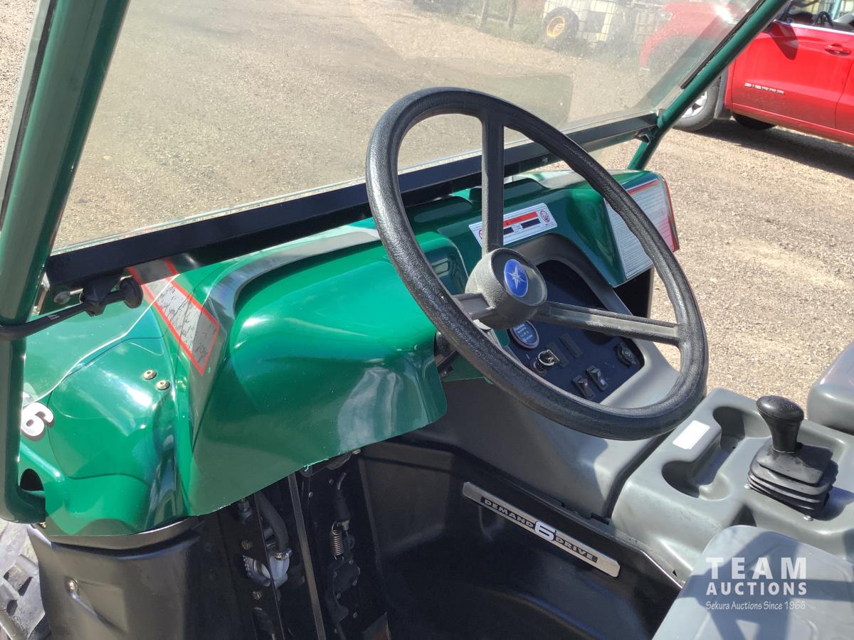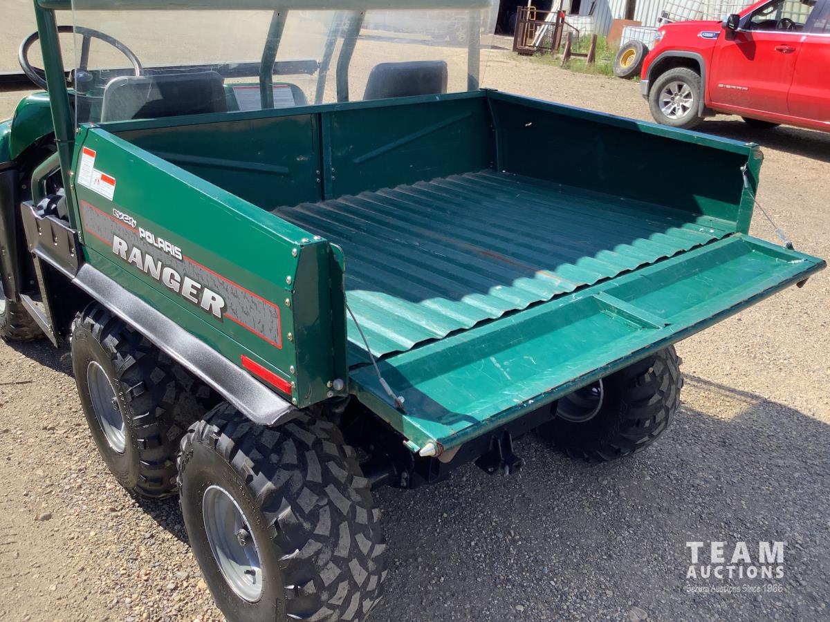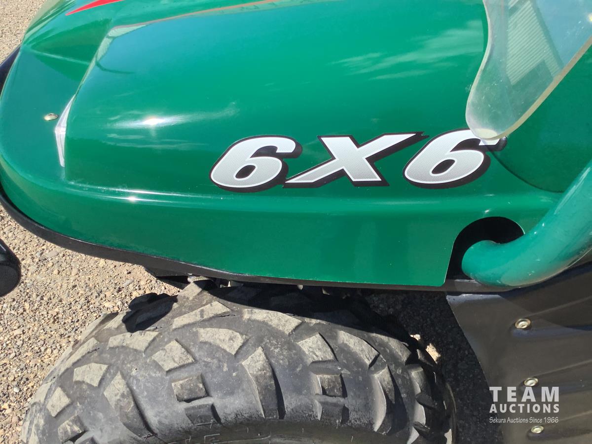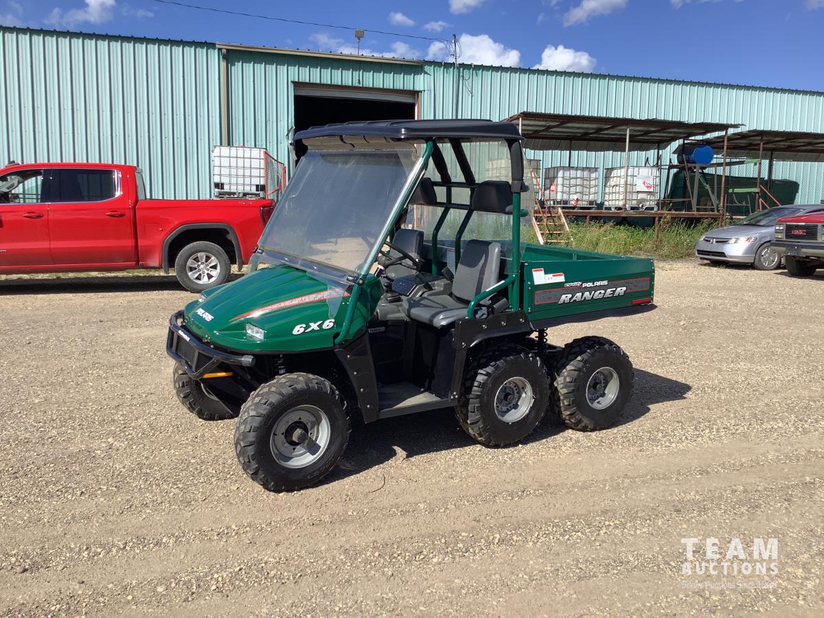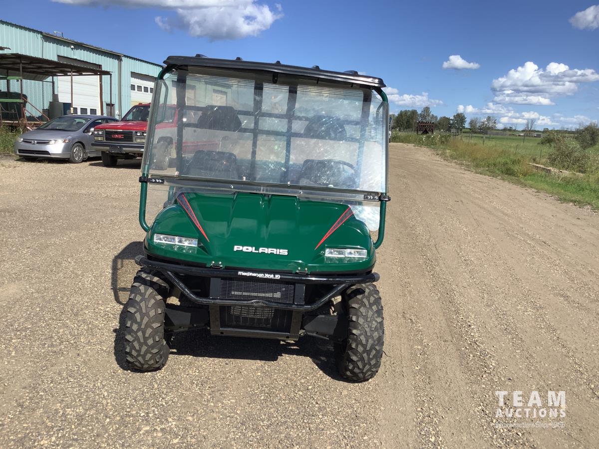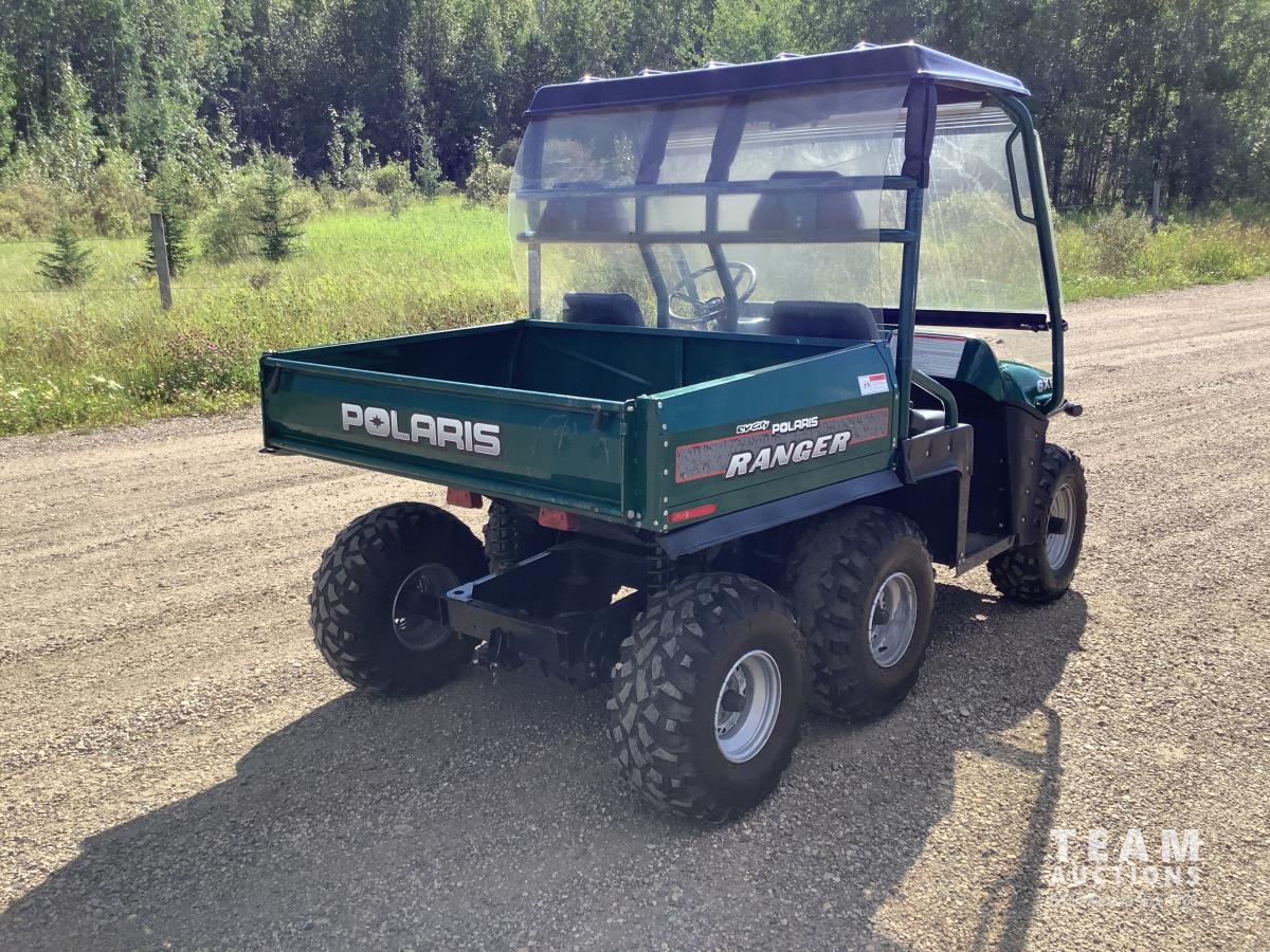 500 cc, liquid cooled, four valve, four stroke engine, electric start new battery, back up recoil start, 36 liter fuel tank, CV Mikuni carb, automatic Polaris Variable Transmission with centre console shift, push button engage 6 wheel drive, hydraulic disc brakes, full independent suspension, tilt dump box