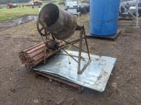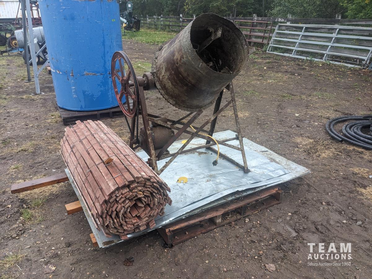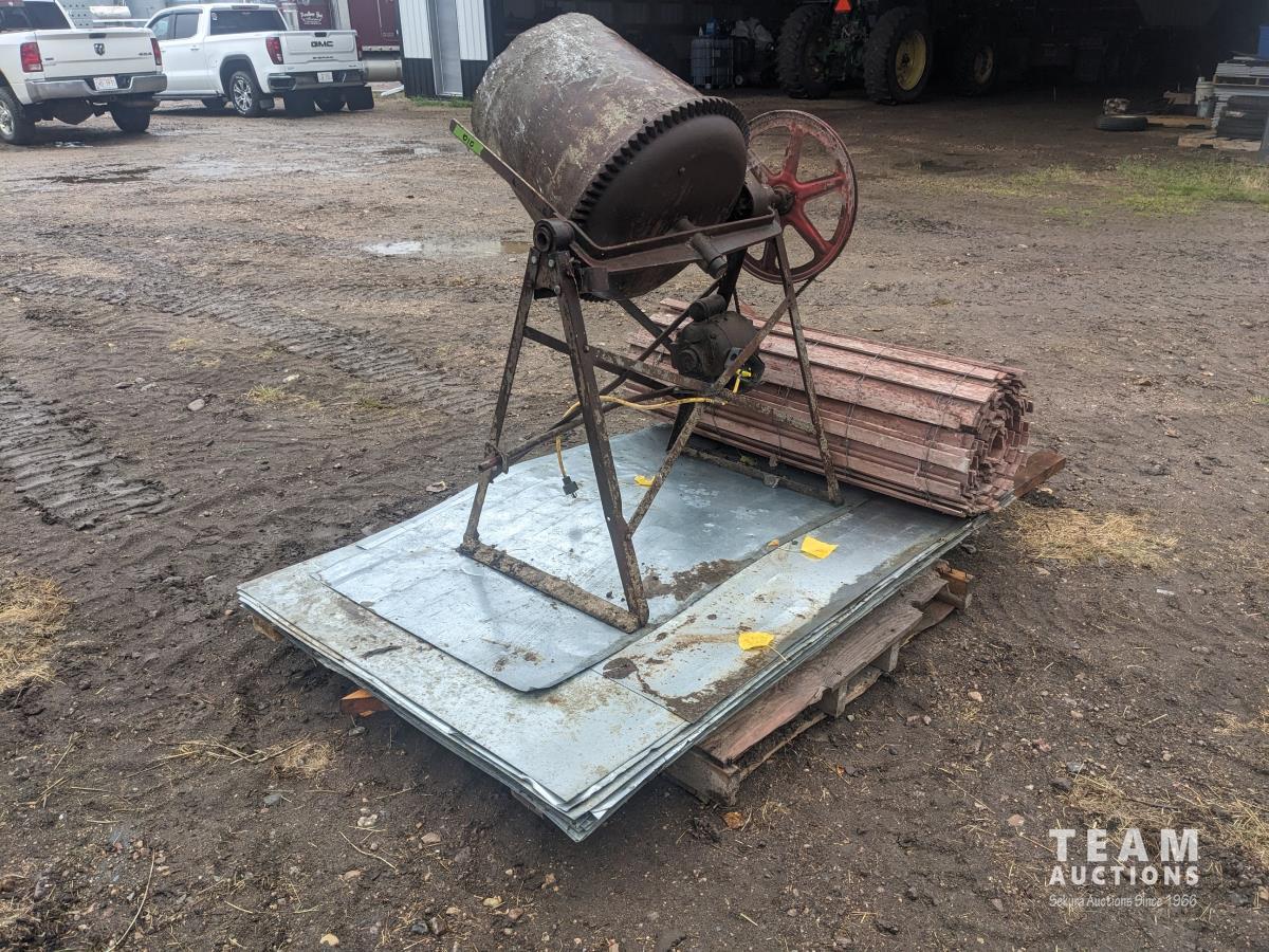 17 Qty of Sheet Metal, Roll of Wood Snow Fence, Electric Concrete Mixer
