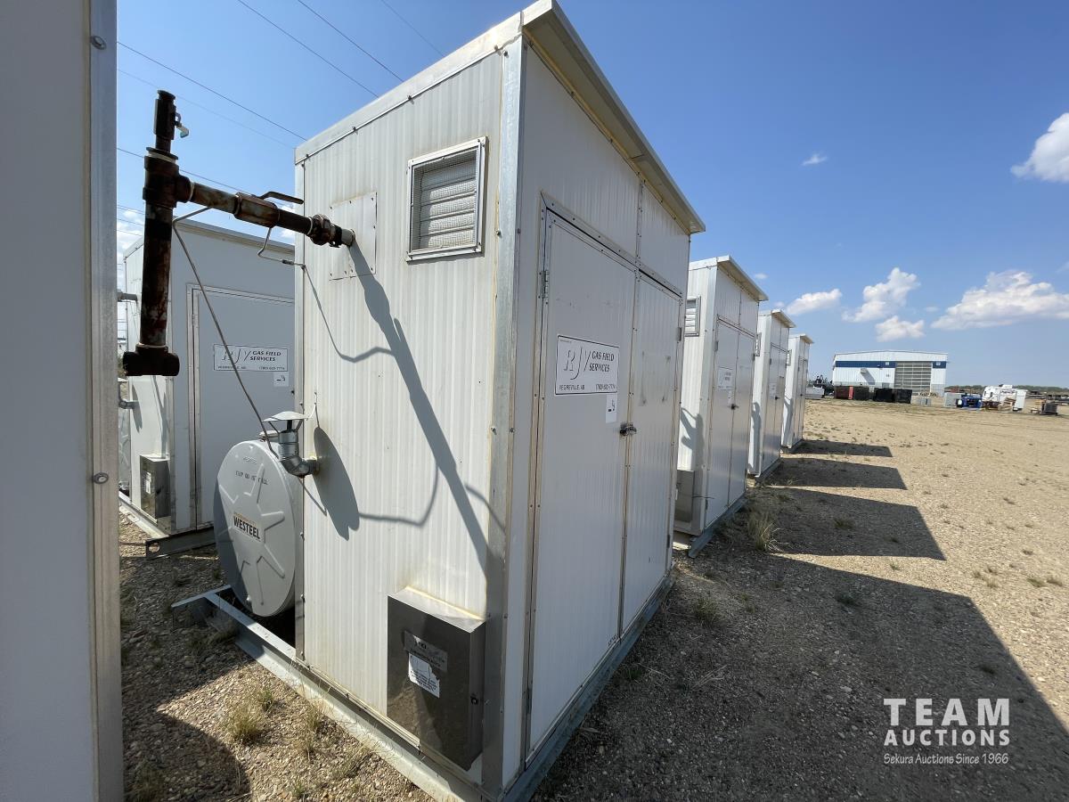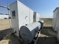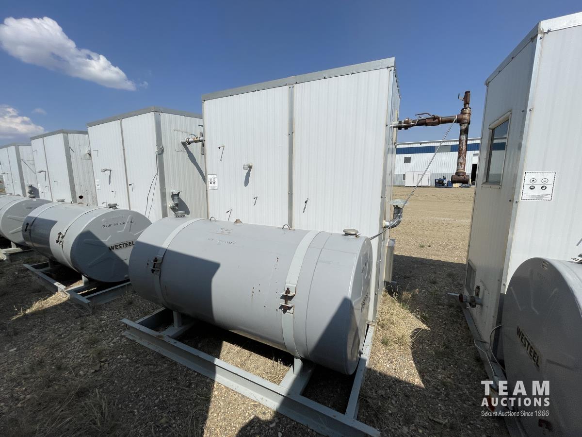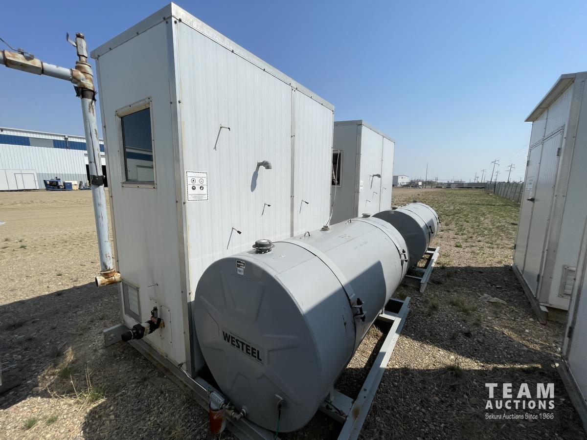 Skid dimensions 7 ft wide X 8 ft long X 8 ft high, building dimensions 4 ft wide X 7 ft long X 7 ft 0 inch high, double wall Westeel mounted tank, chemical injectors and meters