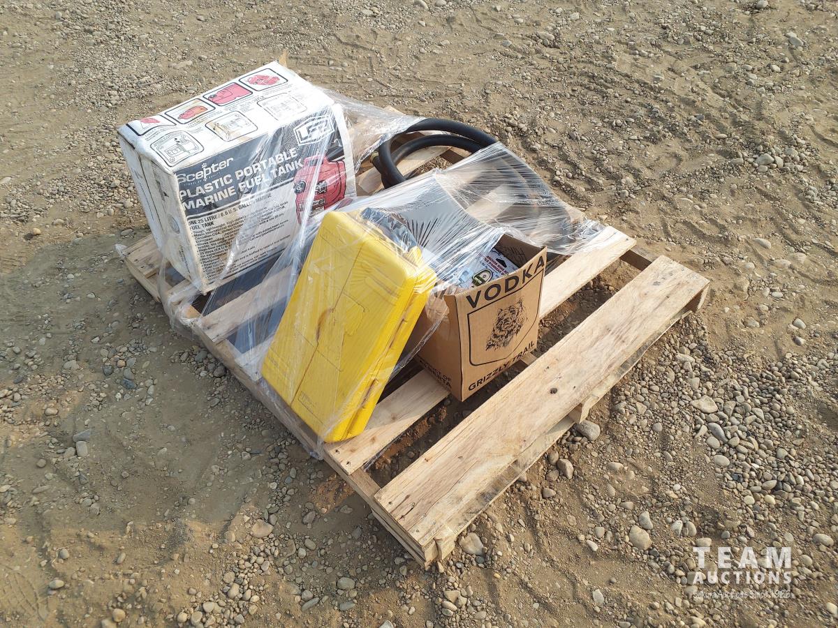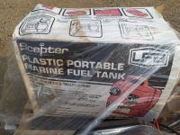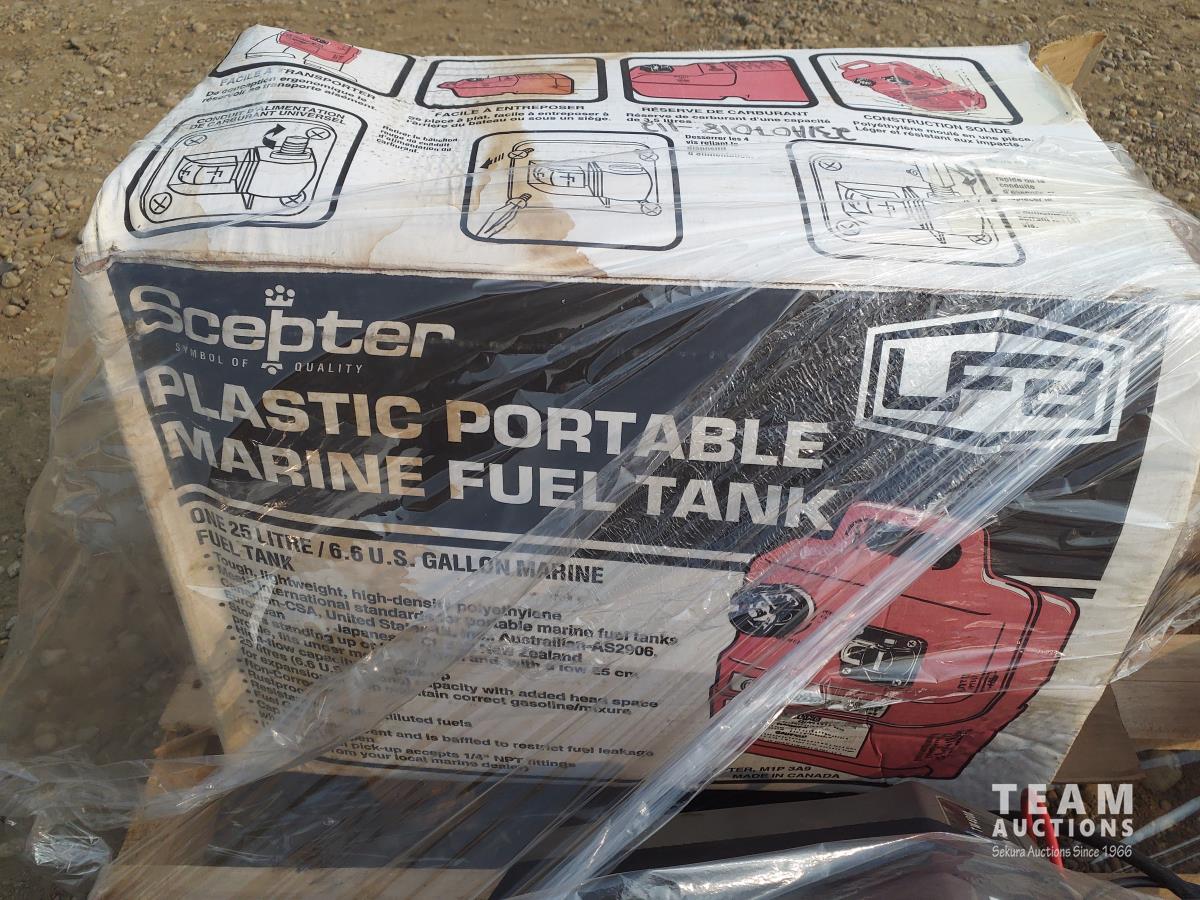 Box of new and used latches, hinges, hooks, plastic portable marine fuel tank