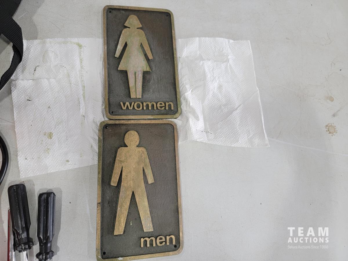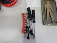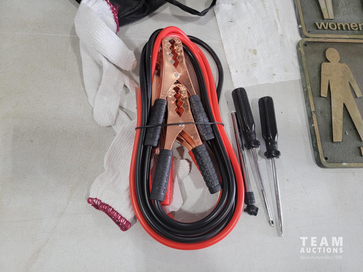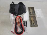 1701 (2) Metal Signs, Booster Cables with Tire Gauge, (2) Screwdrivers and Bits