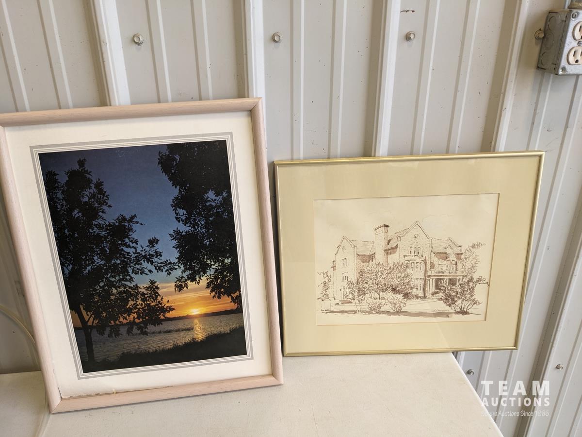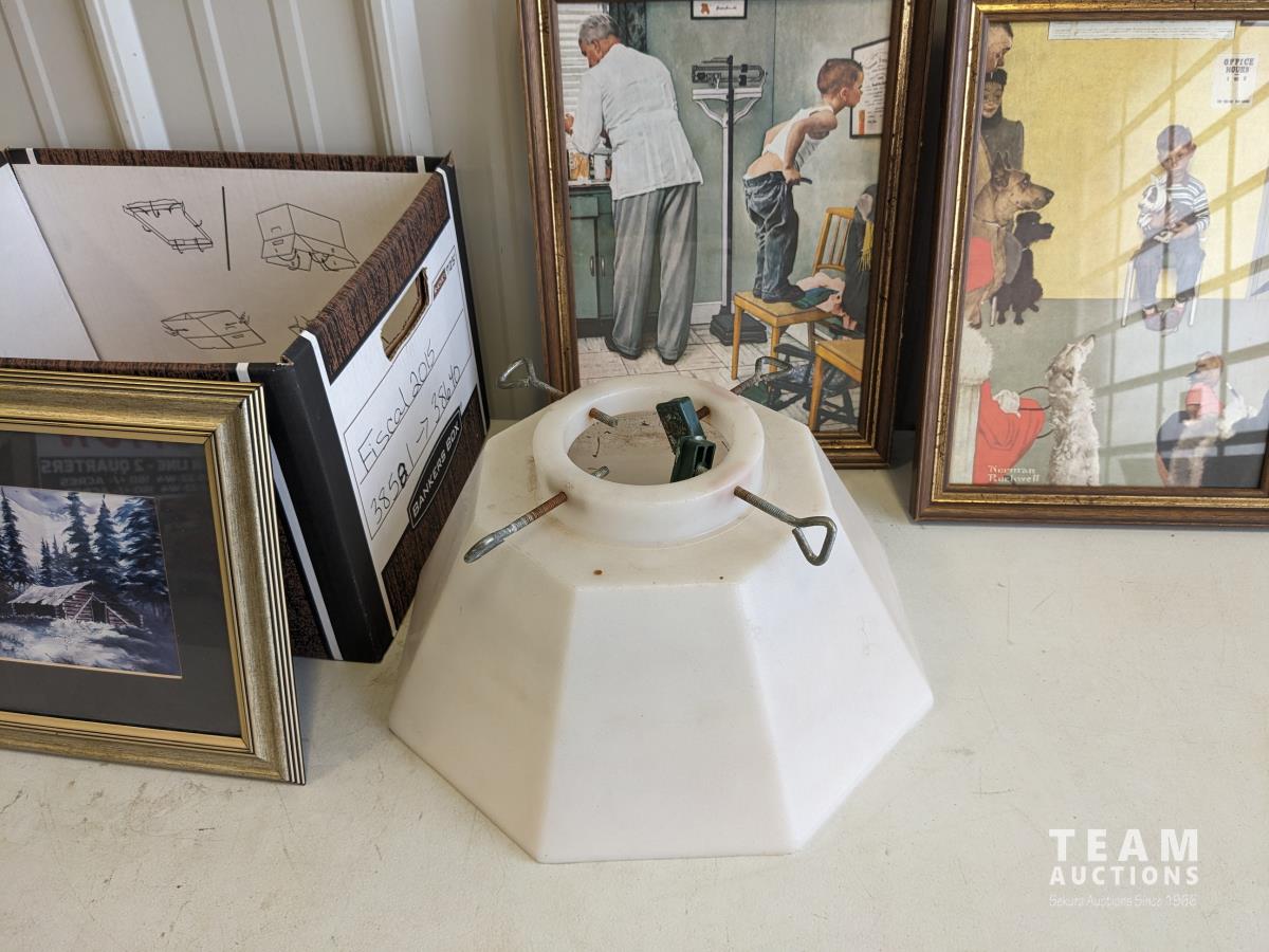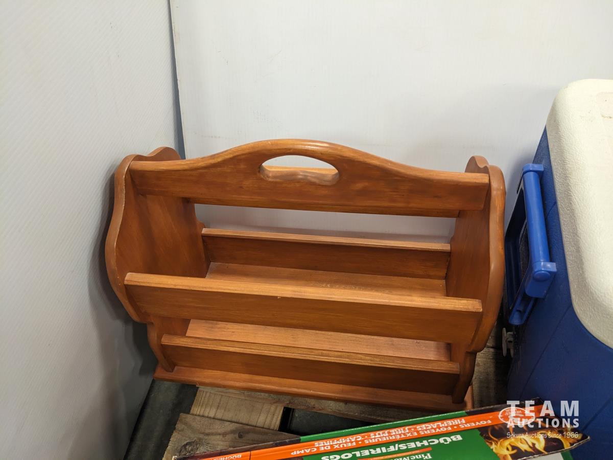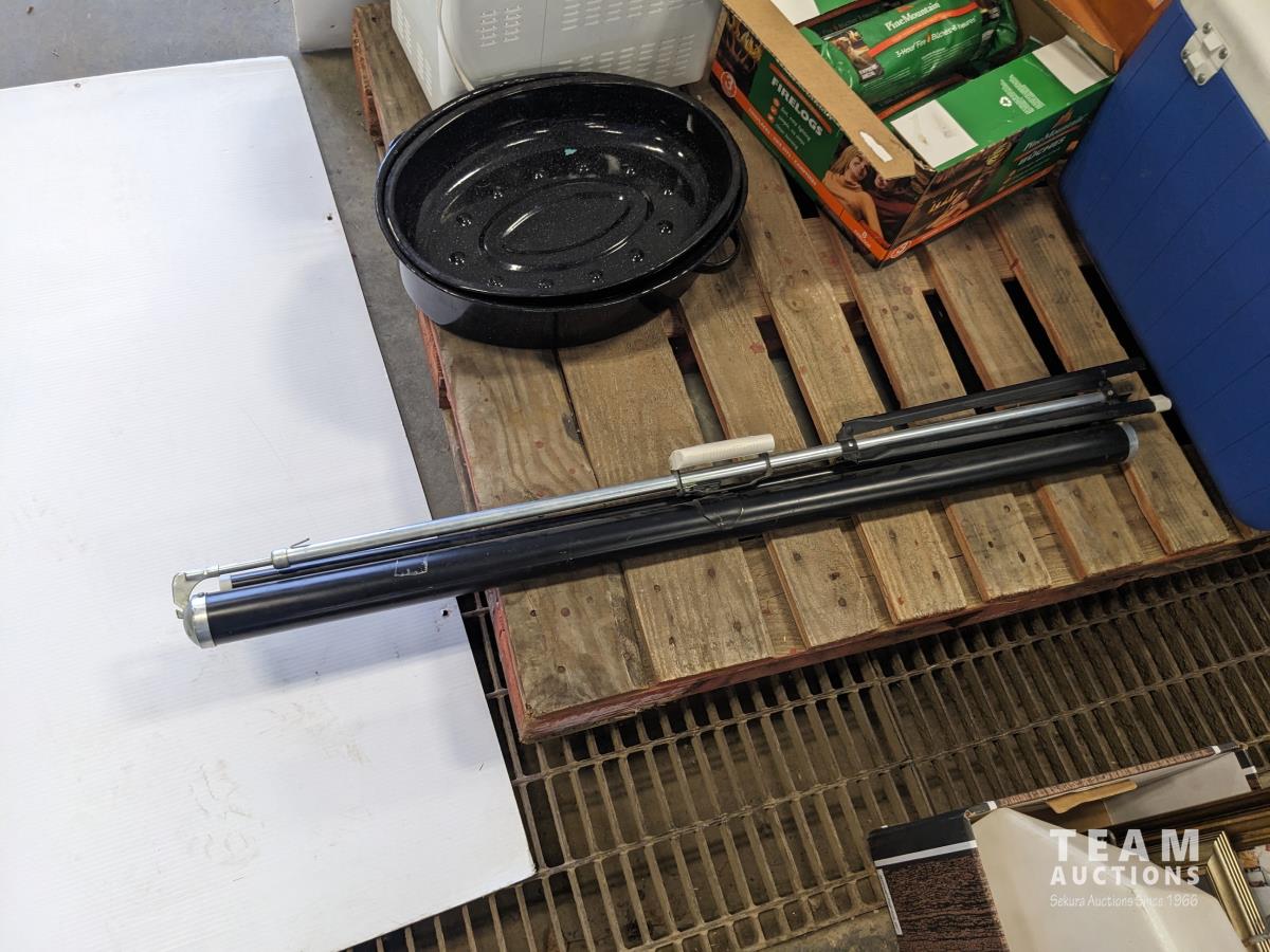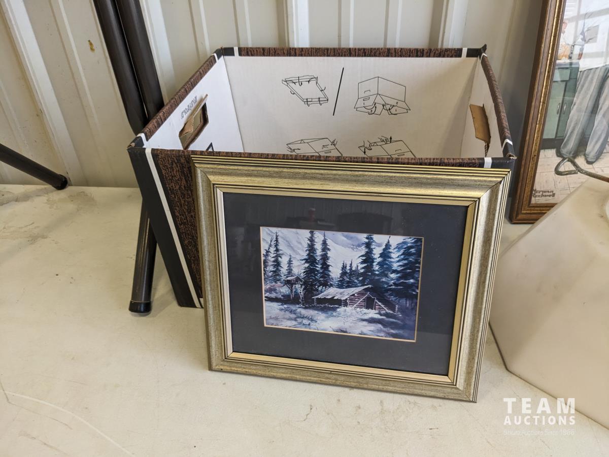 Qty of wall pictures, dehumidifier, roaster pan, fire logs, cooler, magazine rack, movie screen, projector table