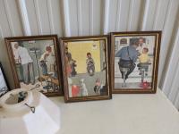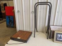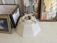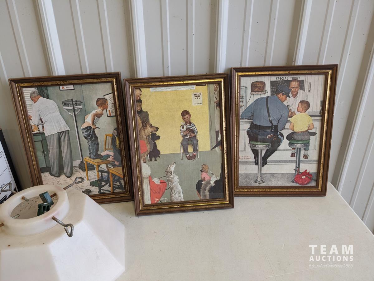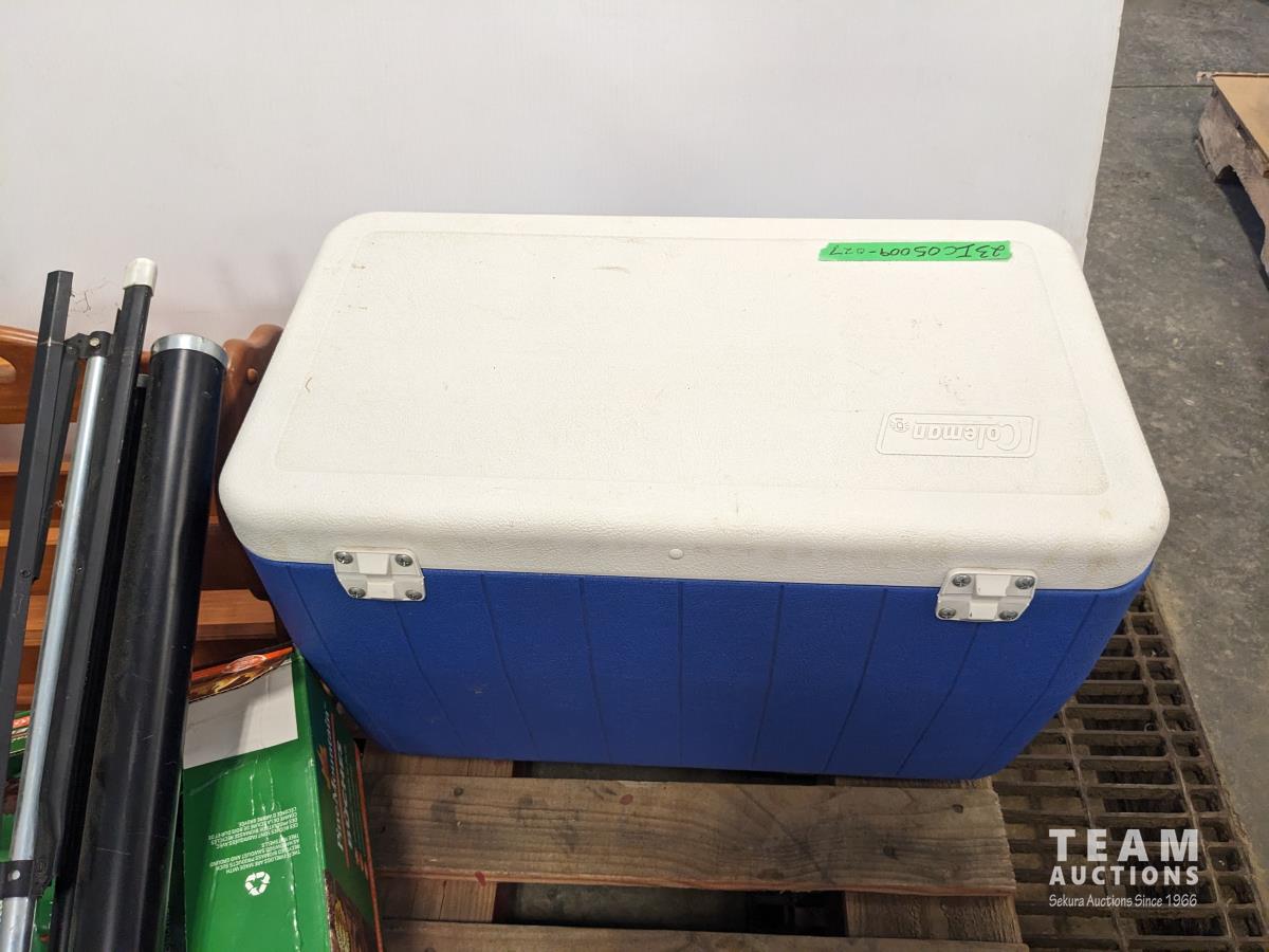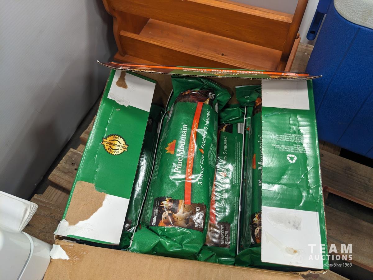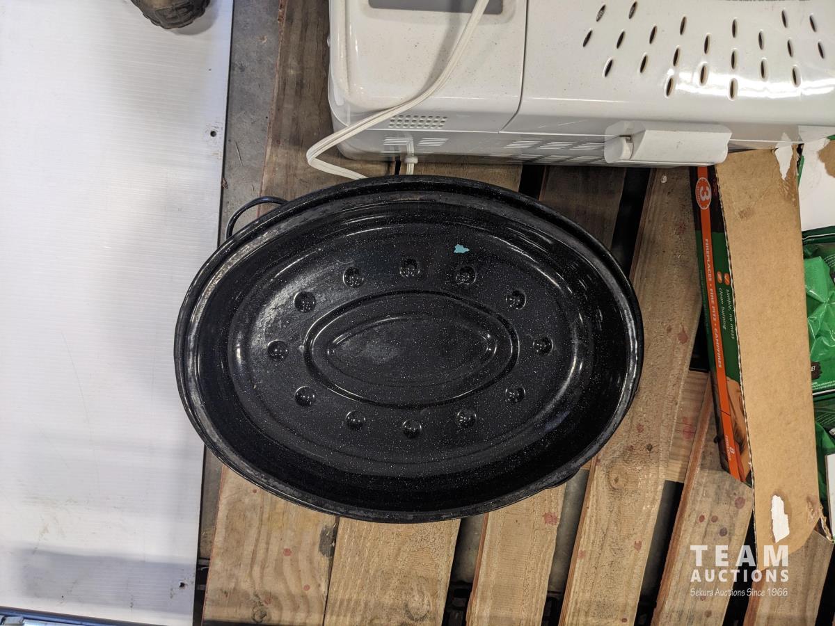 Qty of wall pictures, dehumidifier, roaster pan, fire logs, cooler, magazine rack, movie screen, projector table