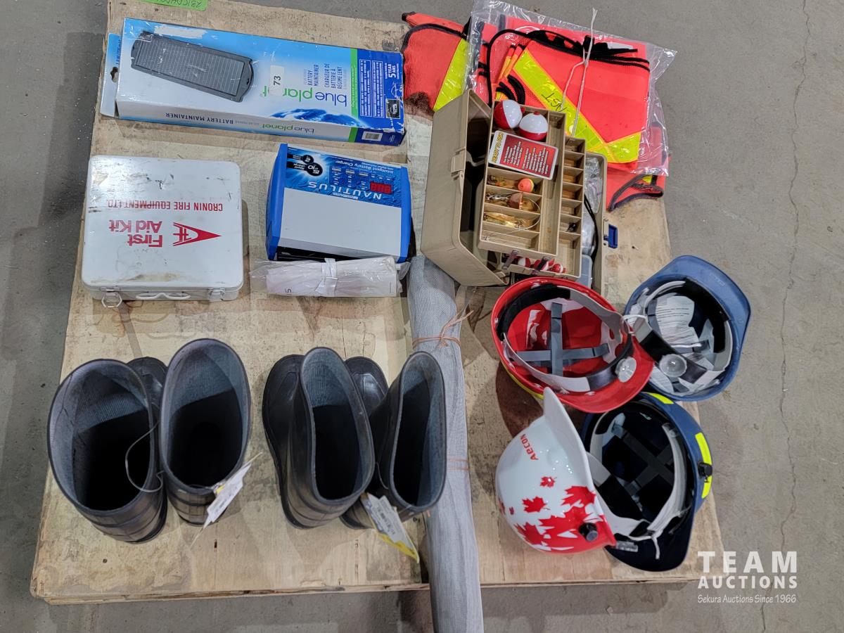 (2) pairs size 7 steel toed rubber boots, (4) hard hats, safety vests, first aid kit, motomaster nautilus battery charger, solar battery maintainer