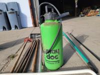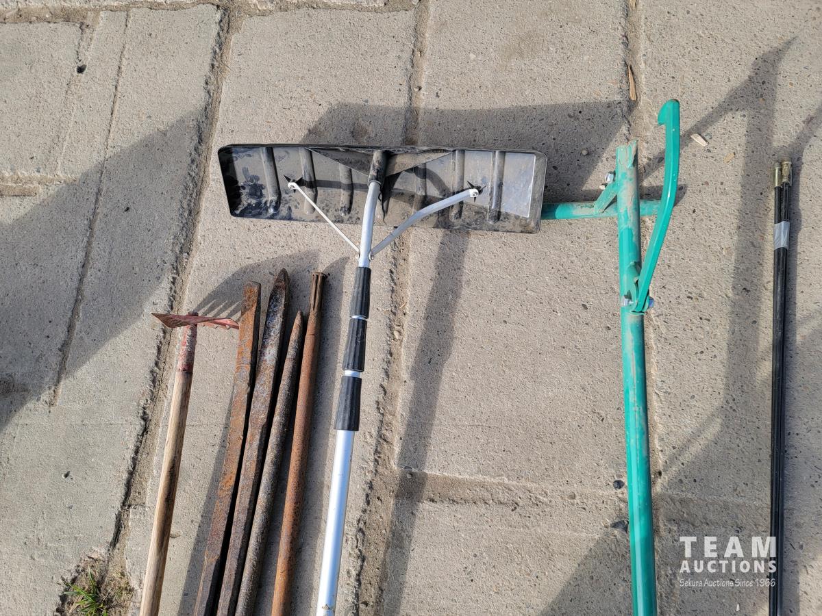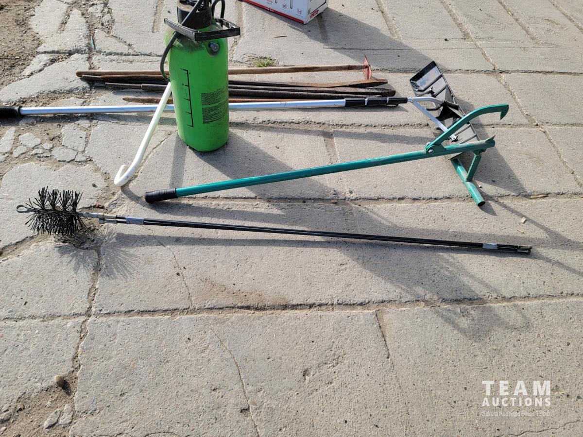 Spray Doc, log roller, chimney brush, roof rake, pry bars