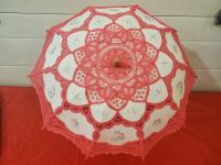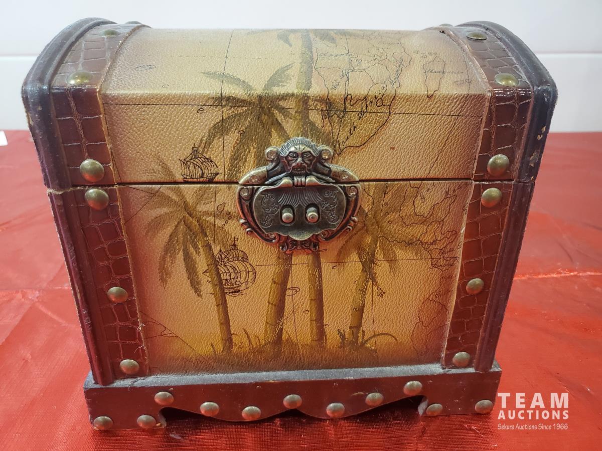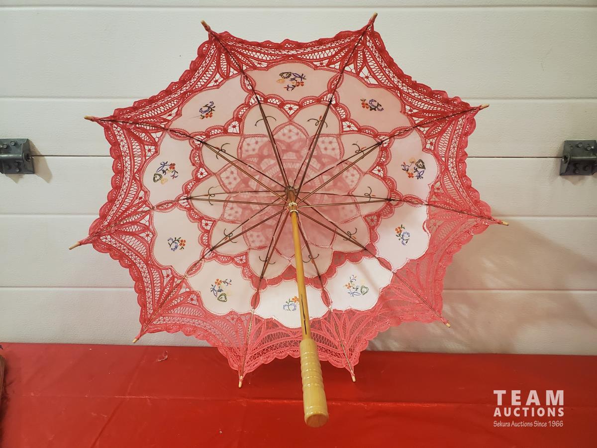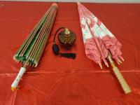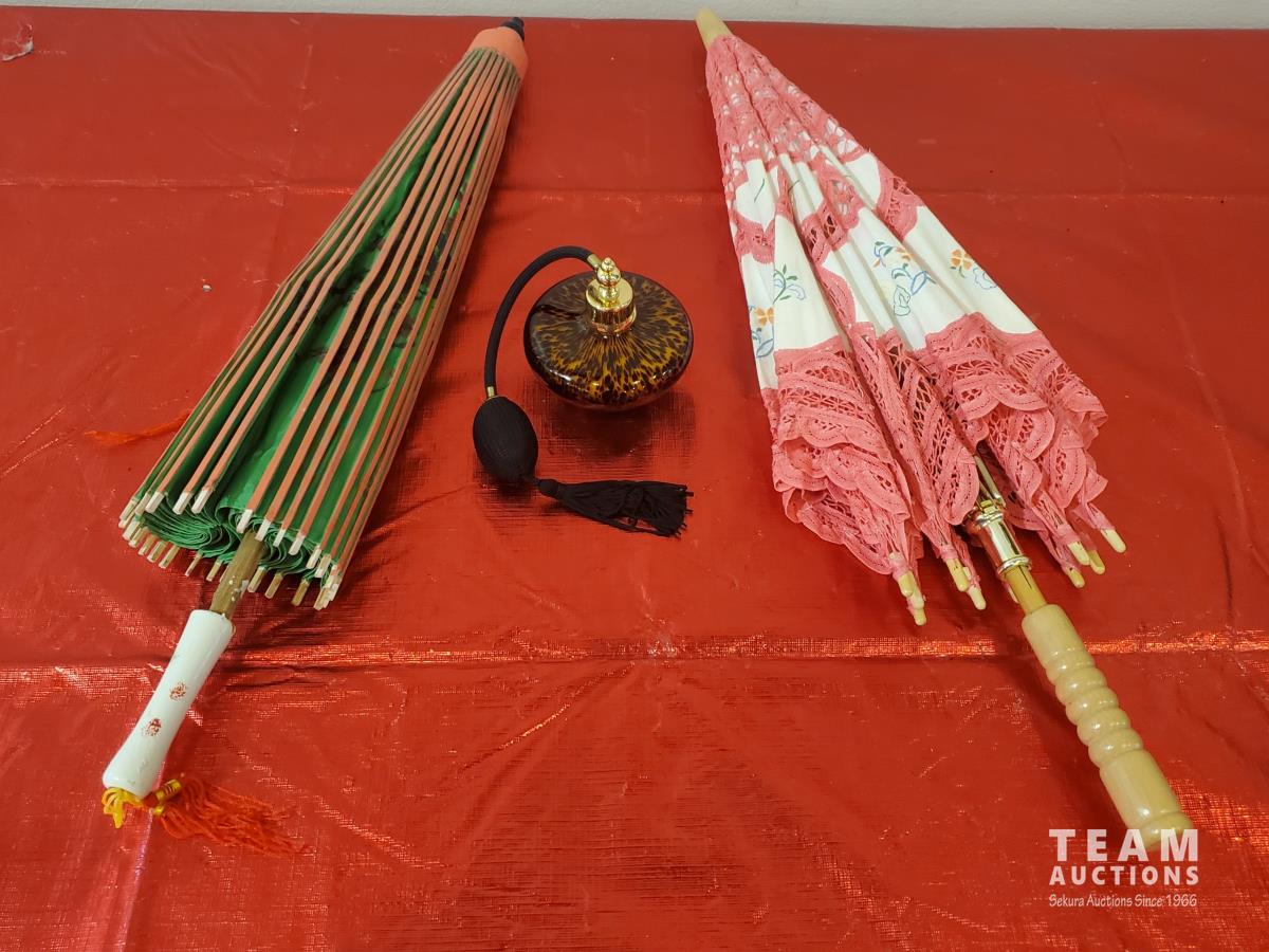 Storage Trunk / Living Room Treasure Chest Collection Cabinet, Vintage Small Brown Liz Claiborne Purse Unique Design Floral Inside Chain Top, Made in Ireland Antique Ladies Evening Clutch Purse, Framed Lace with Windmill, 100ml Vintage Crystal Style Refillable Perfume, Atomizer Spray Bottle, (2) Parasols - 1 Bamboo Umbrella & 1 Silk Floral Design