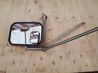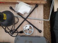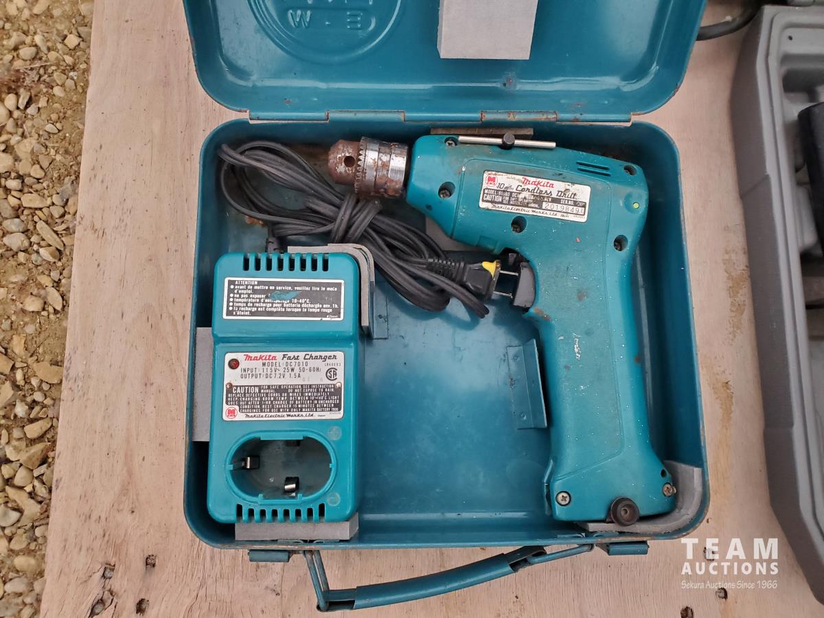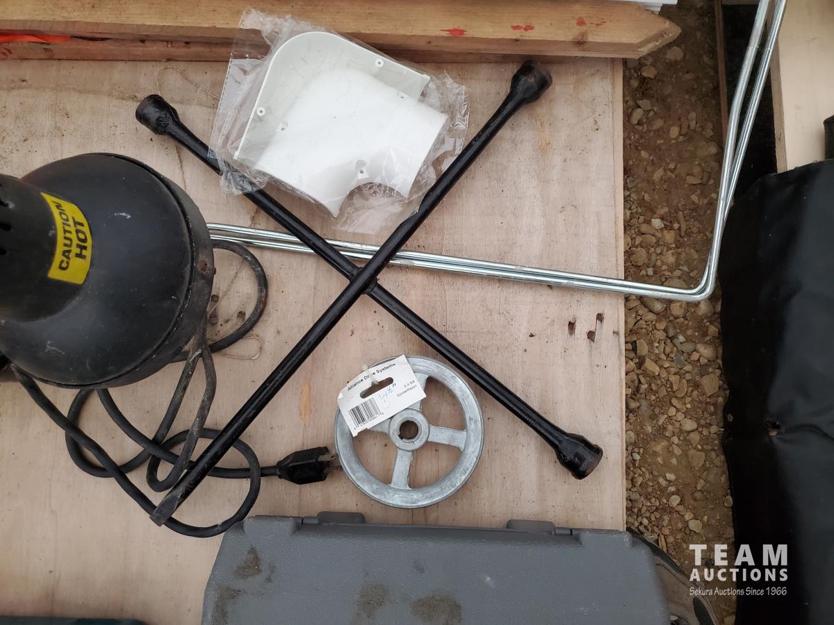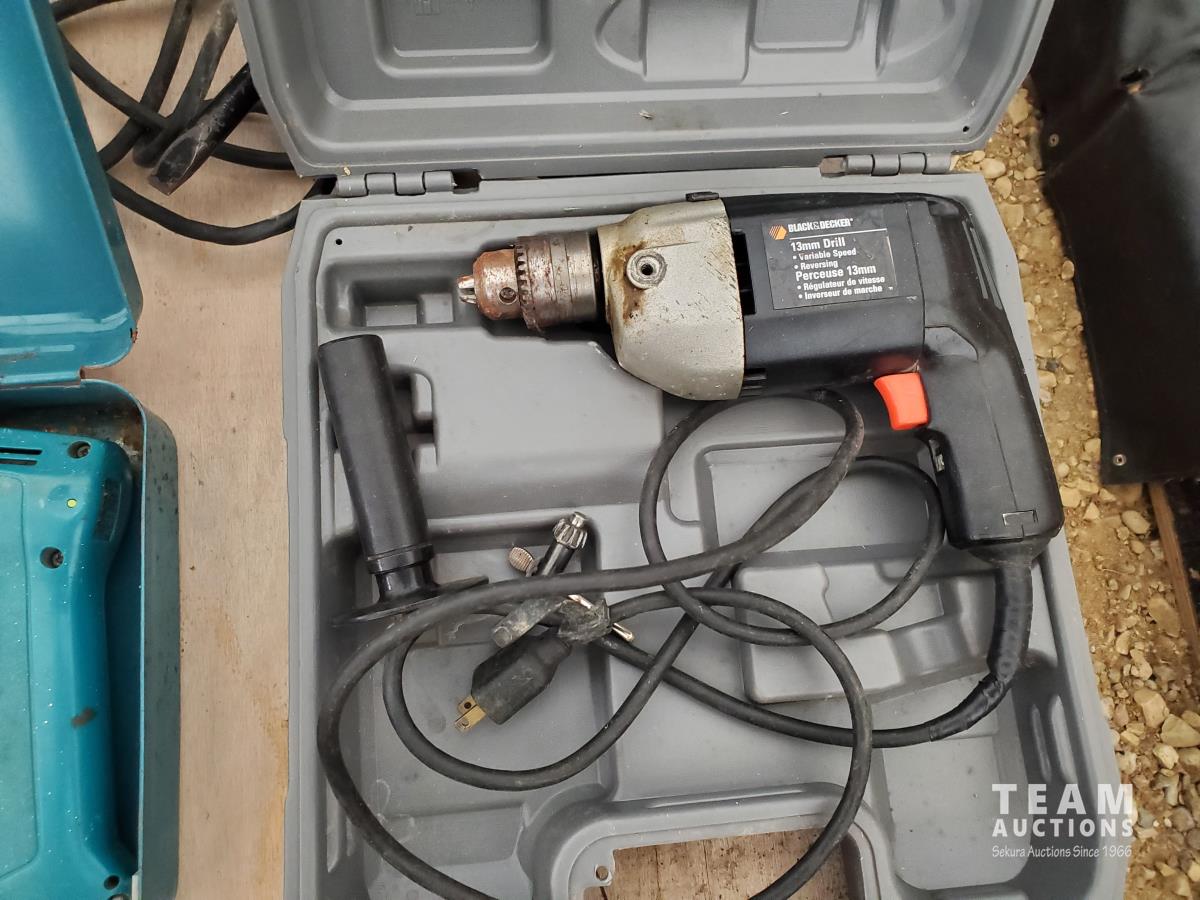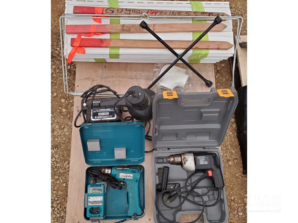 Black&Decker 1/2 inch Variable Speed Reversing, Hammer Drill, Makita 3/8 Cordless Drill Charger & Case, (2) Jack Stands, (1) Truck Side Door Mirror, (2) Bullet Proof Truck Mud Flaps, Motorcycle Luggage Rack/ Backrest, RV 12 volt Air Conditioning Evaporator, Bundle of Garden Greenhouse Bows