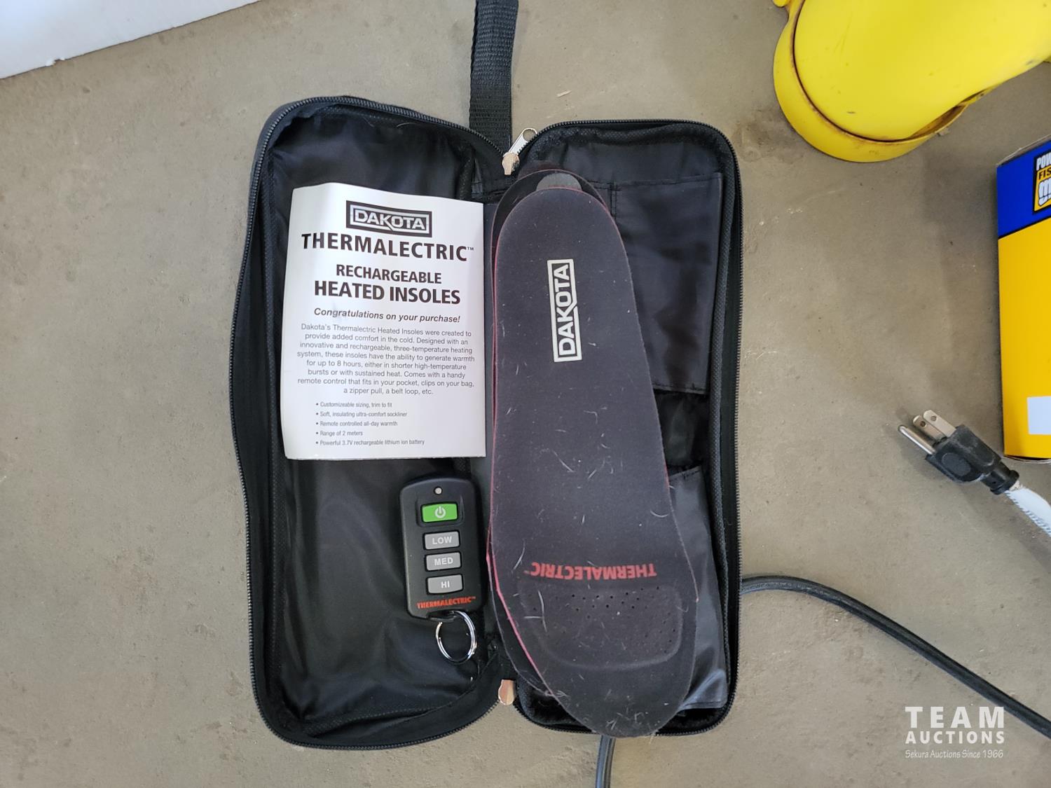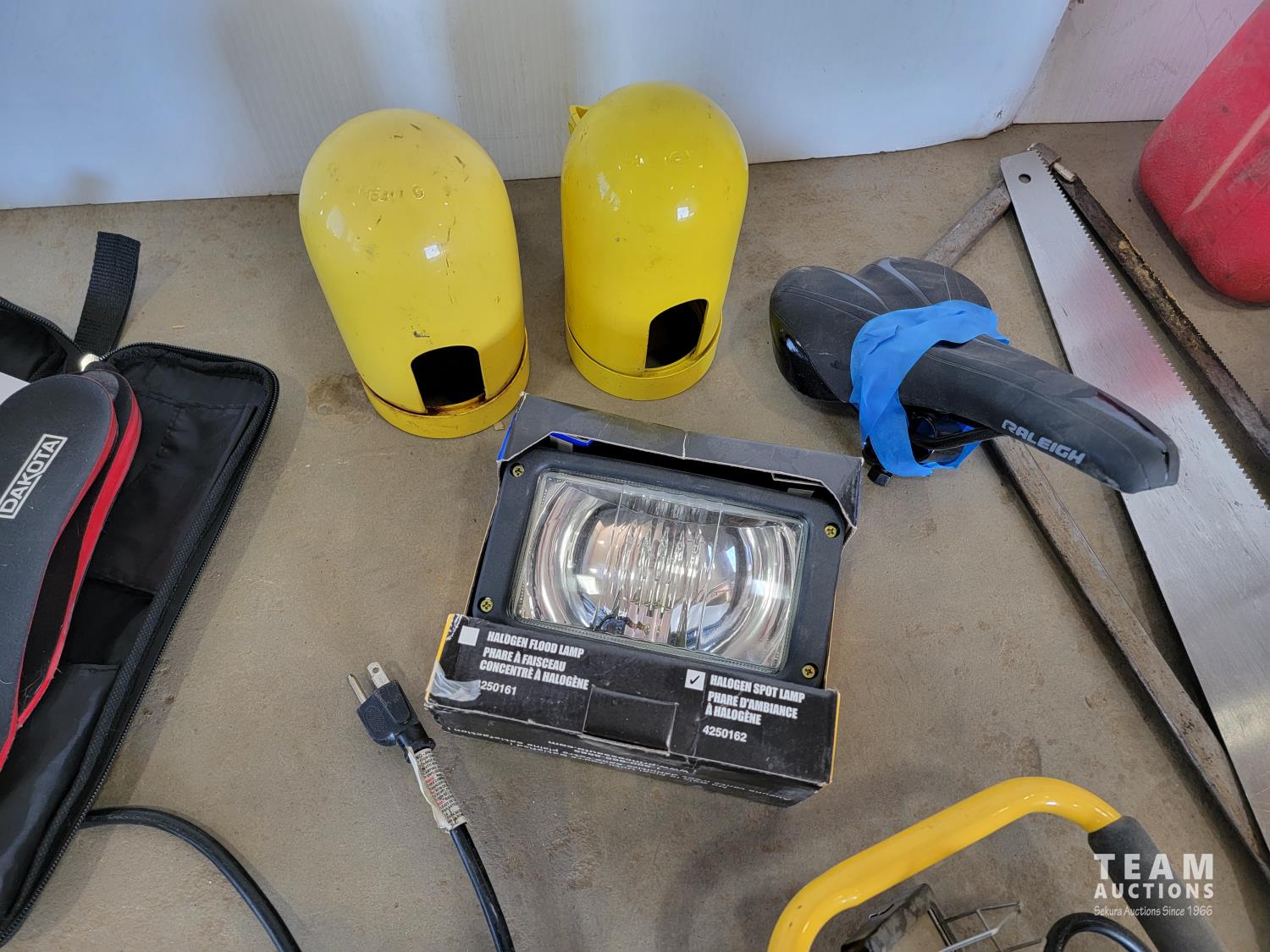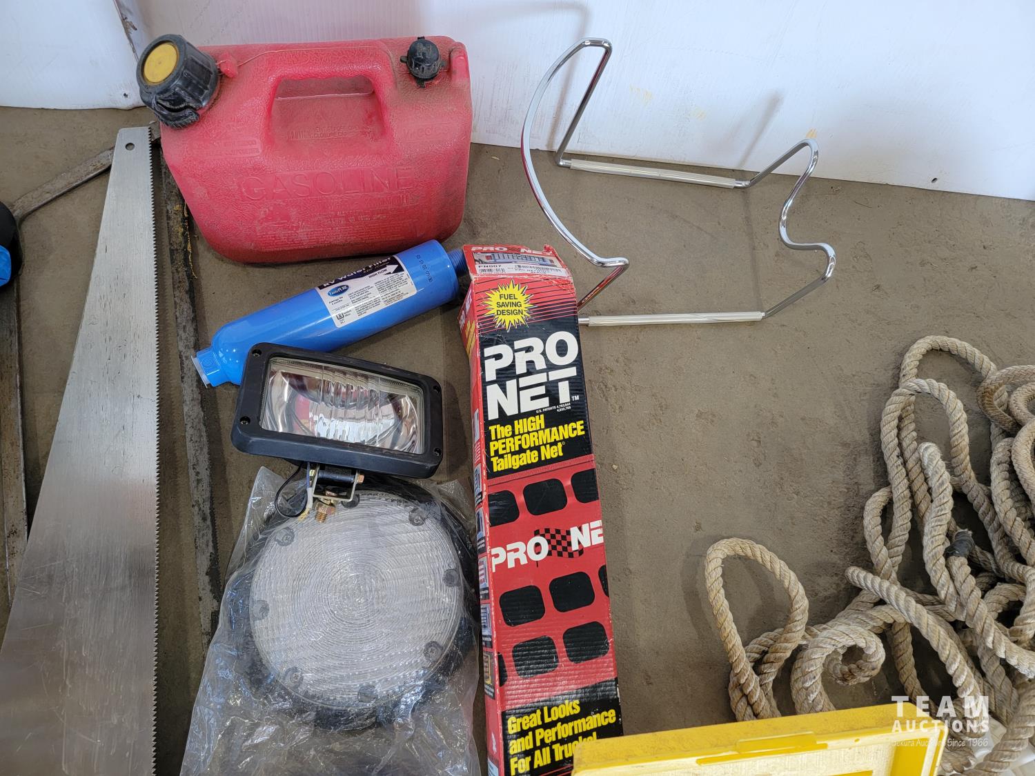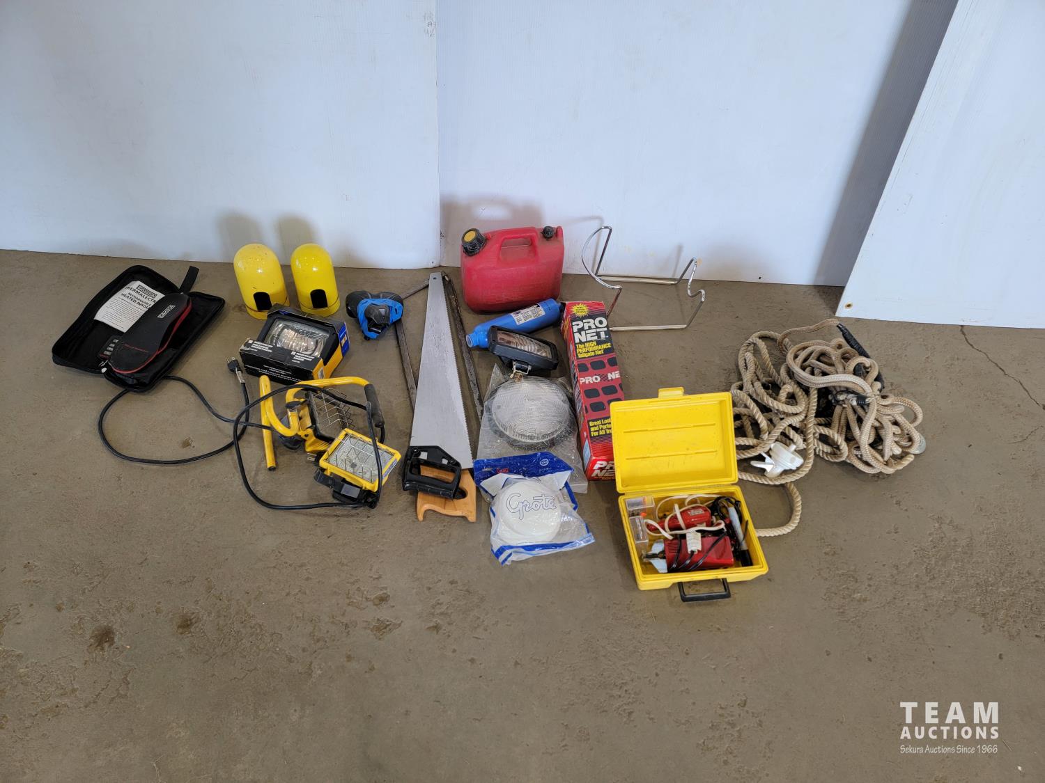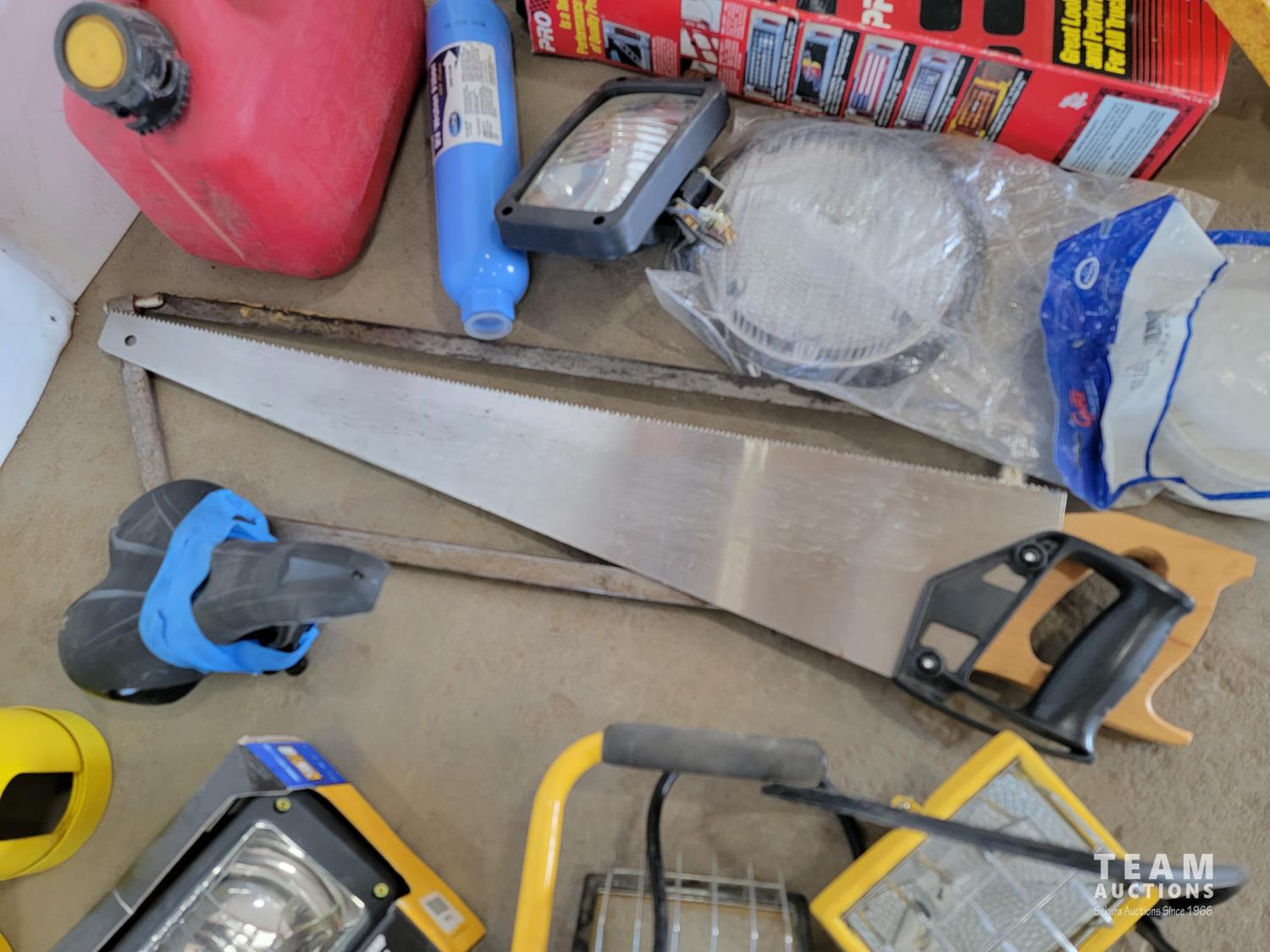 Dakota heated insoles, halogen flood lamps, work lights, hand saws, jerry can, tailgate net, rope, engraver