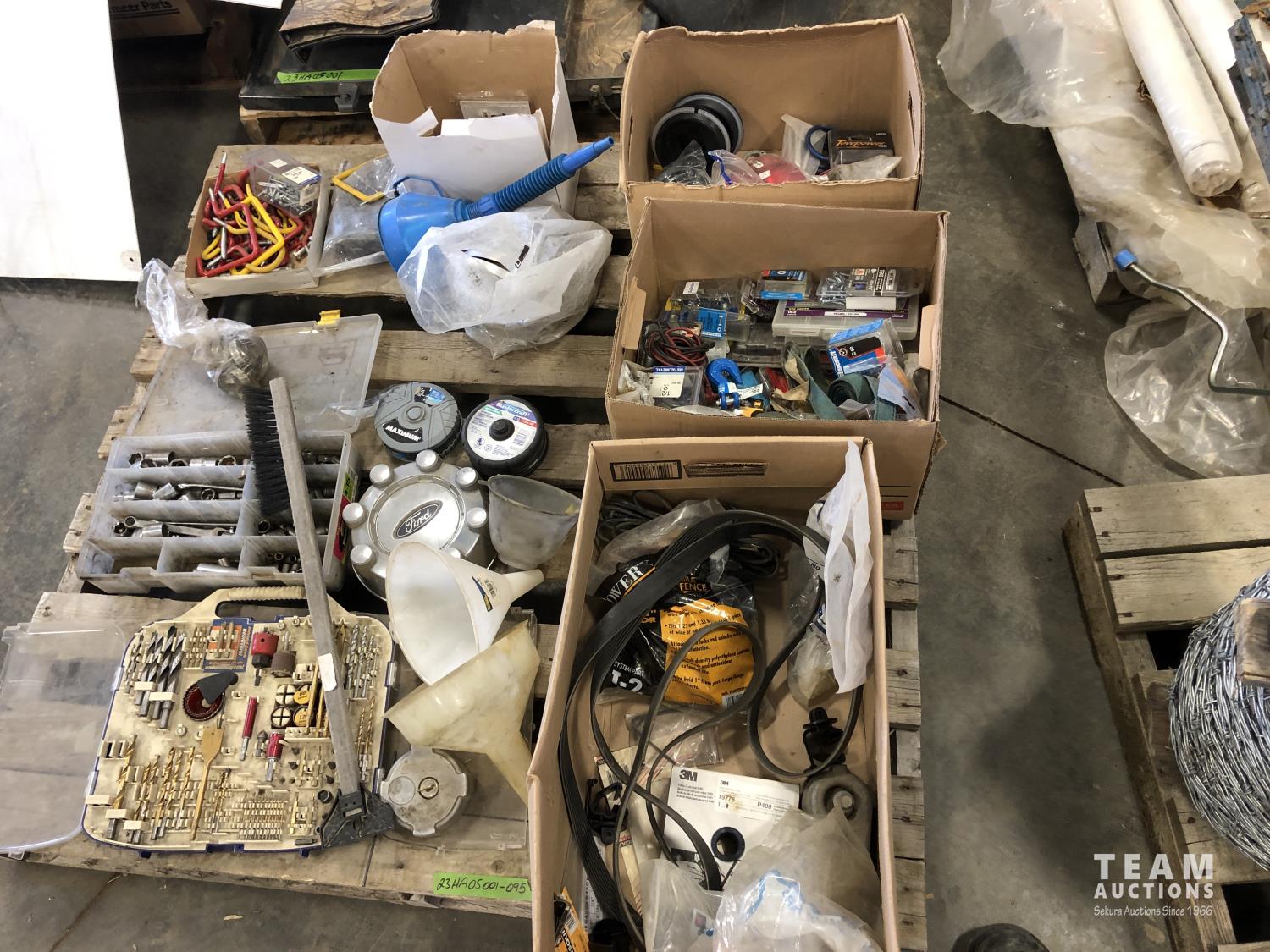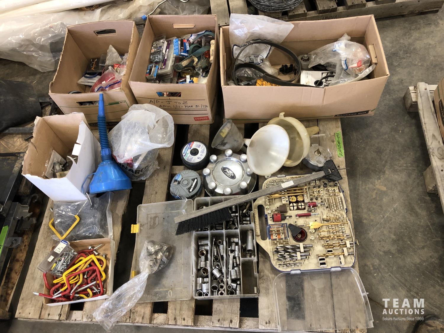 drill bits, sockets, angle grinder discs, pipe clamps, funnels, miscellaneous hardware