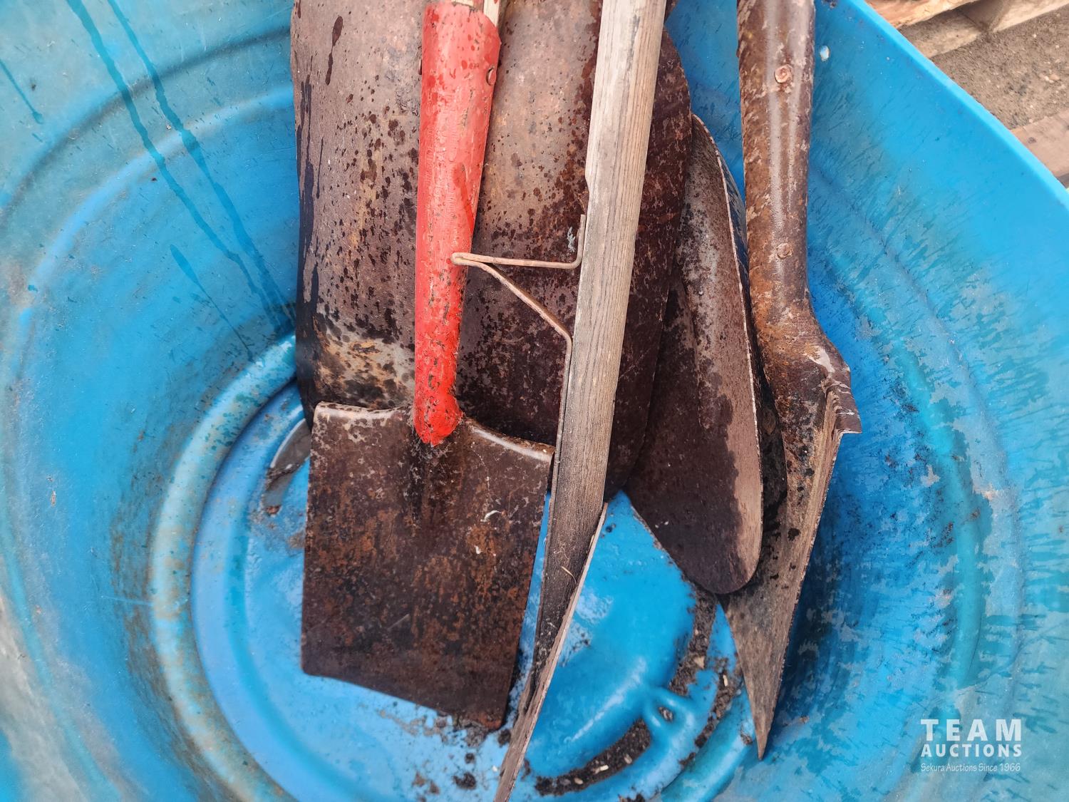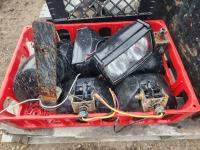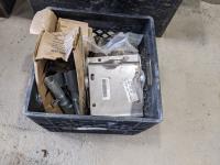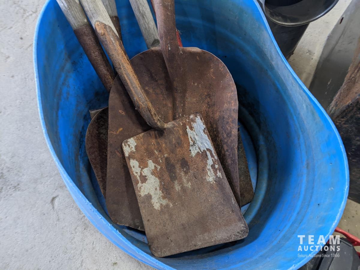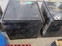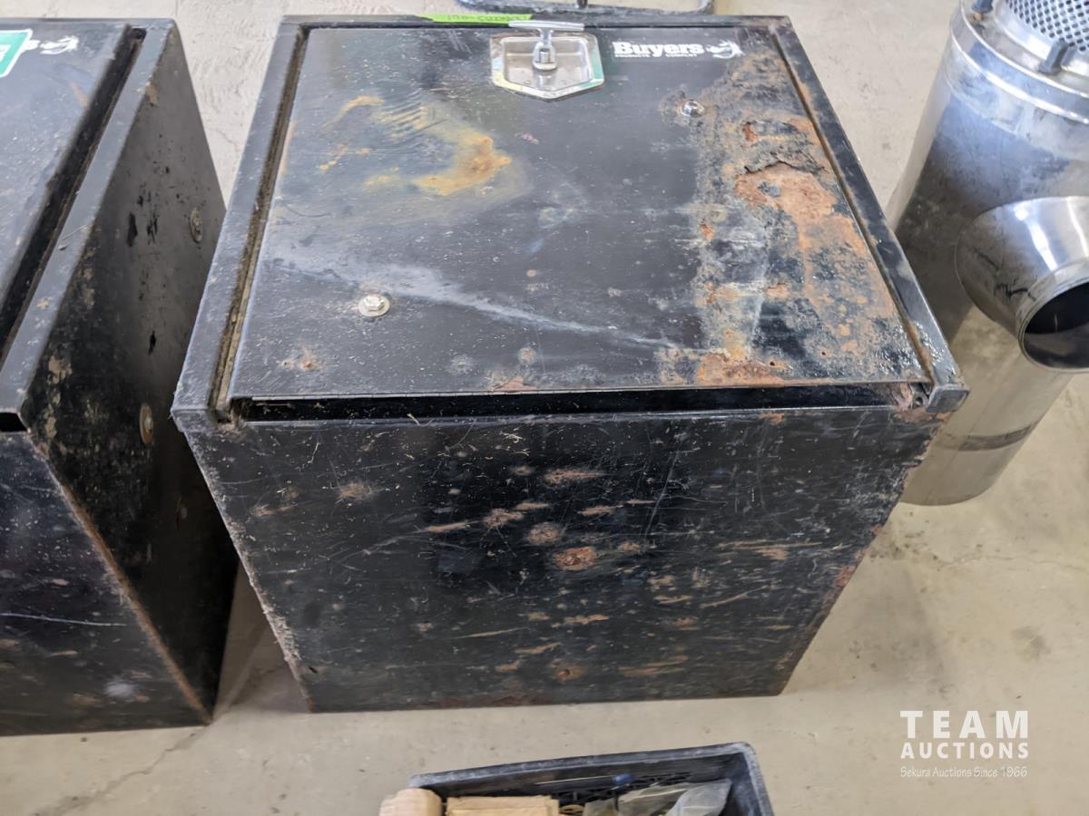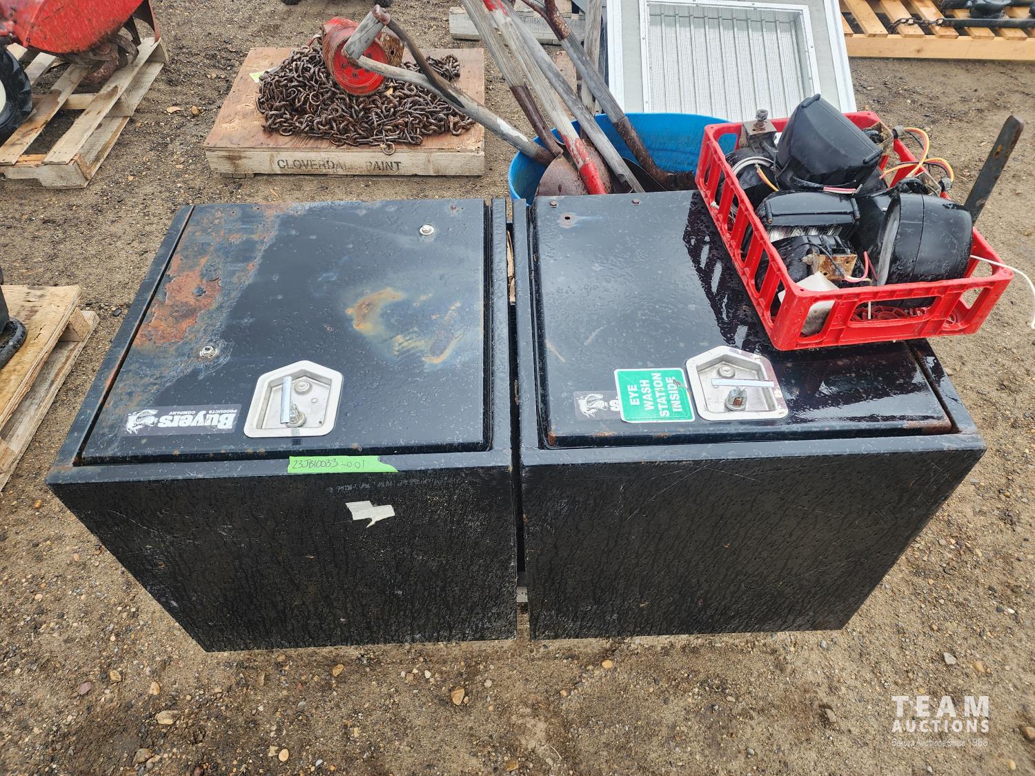 (2) Buier tool boxes 24 x 24 x 24, assortment of shovels in blue plastic barrel, (5) fog lights and miscellaneous heavy truck parts