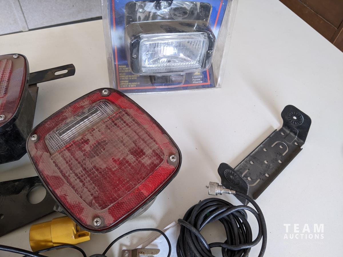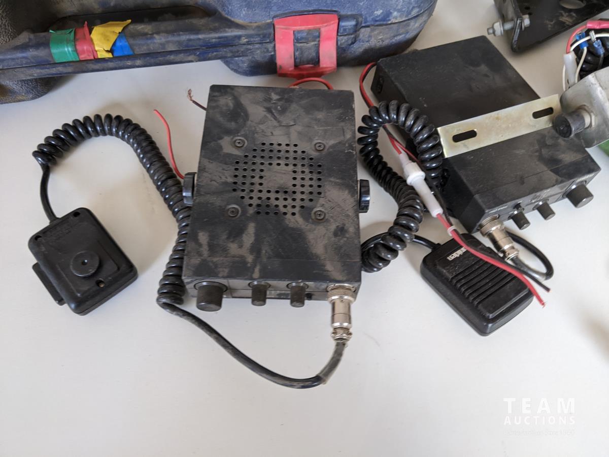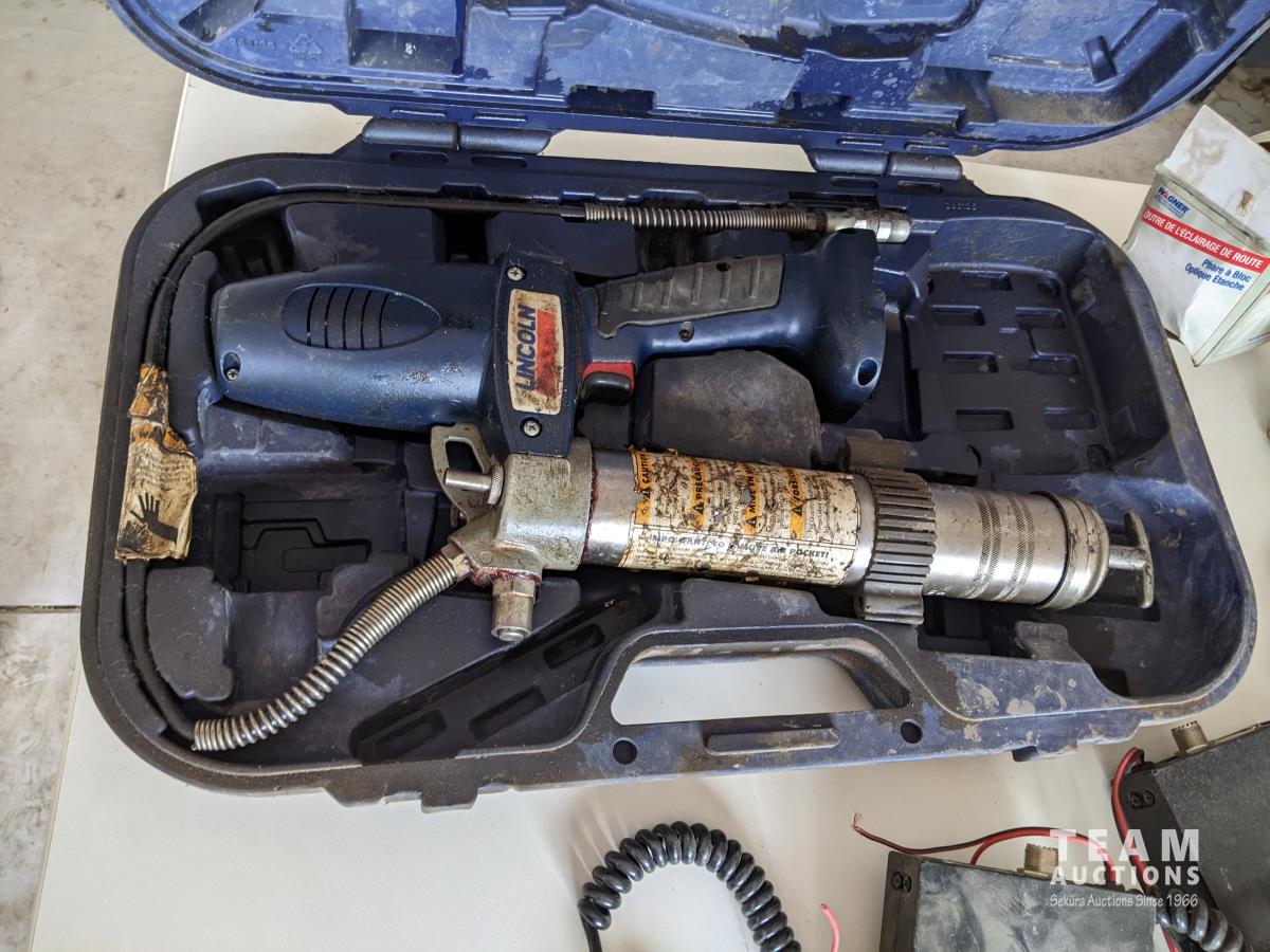 Lincoln grease gun, (2) batteries, (1) charger, various CB radios, trailer lights