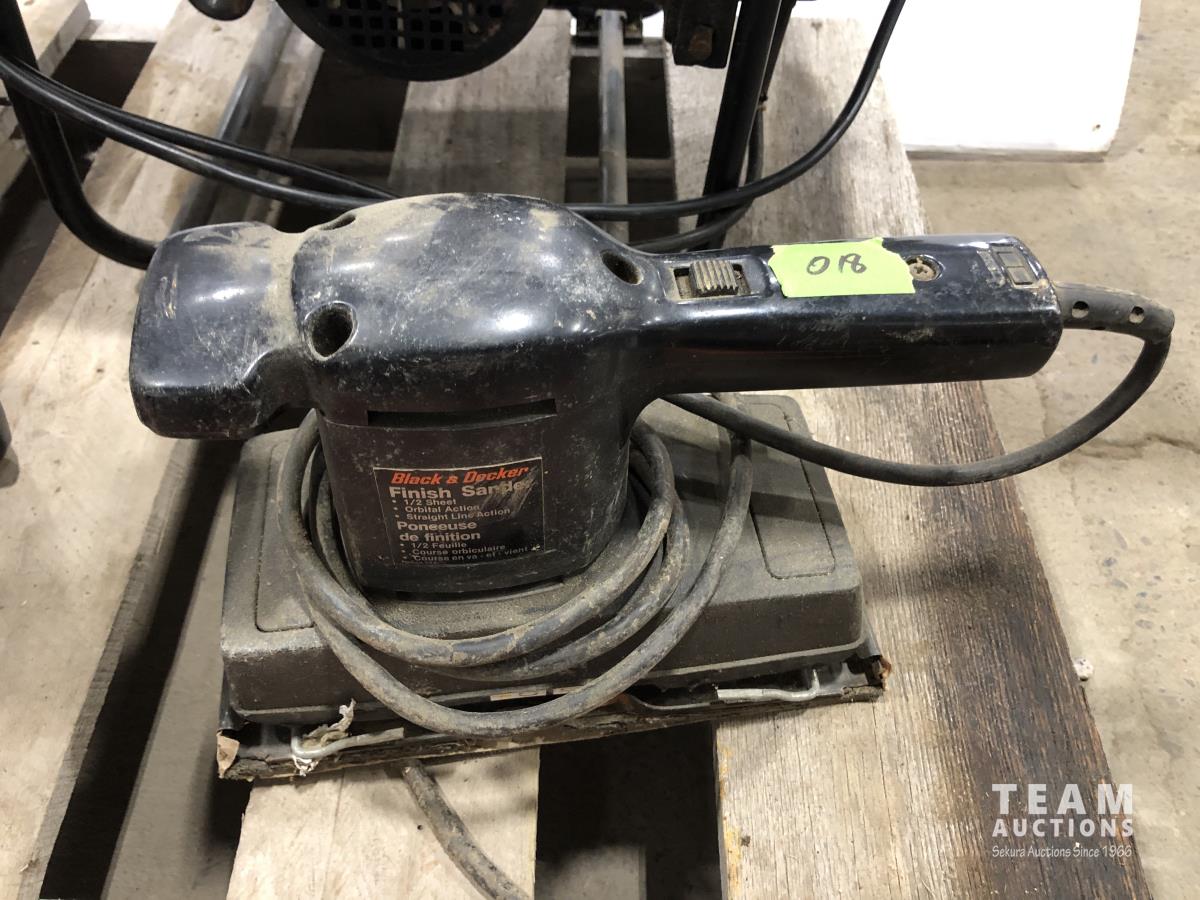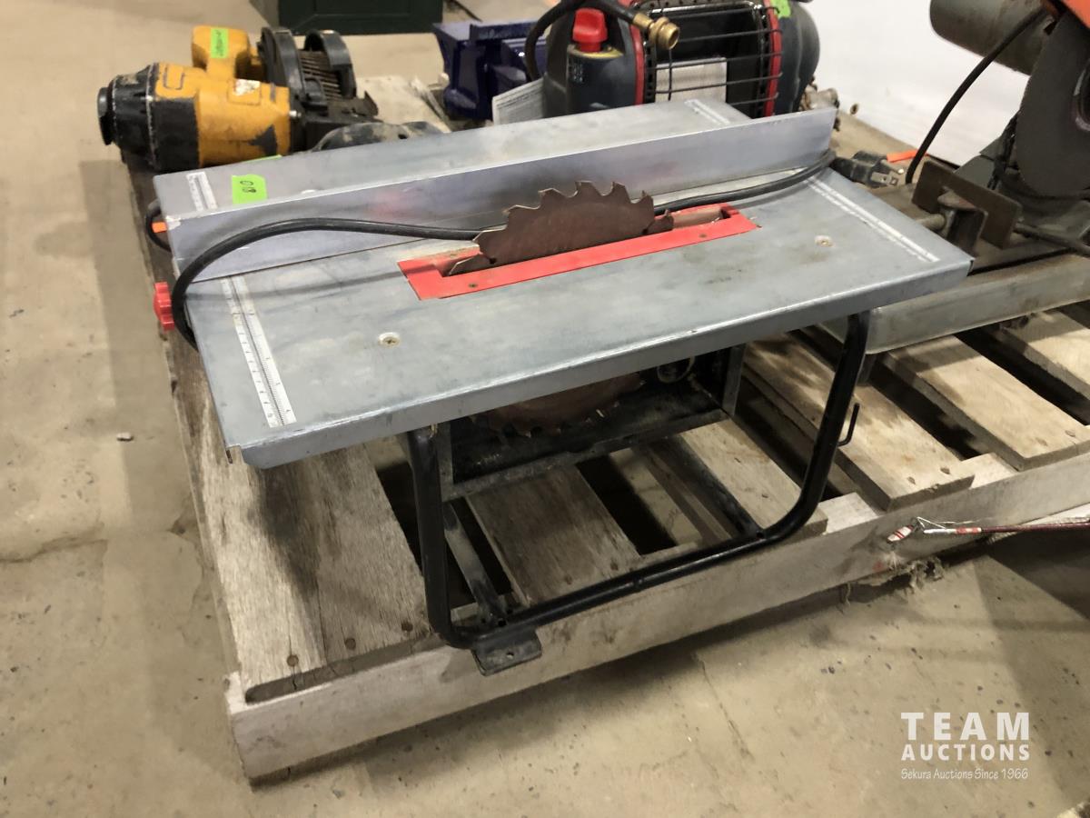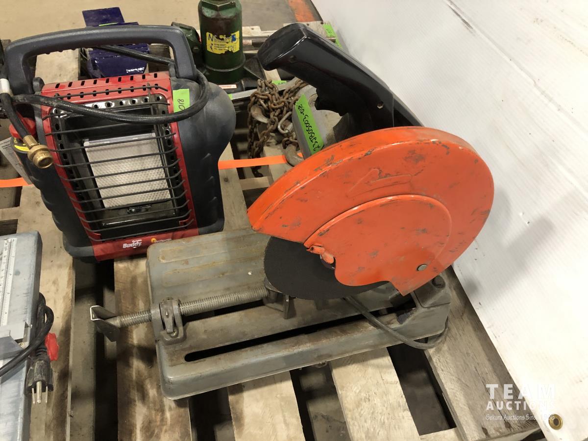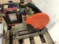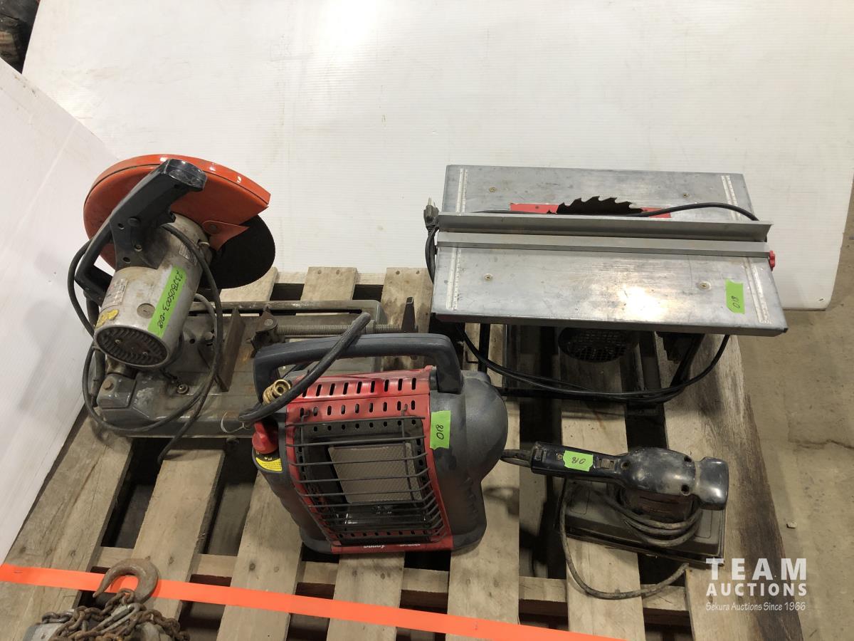 Mr. Heater portable buddy heater, Makita 12 cut off saw, Black & Decker finish sander, 8 inch bench top table saw
