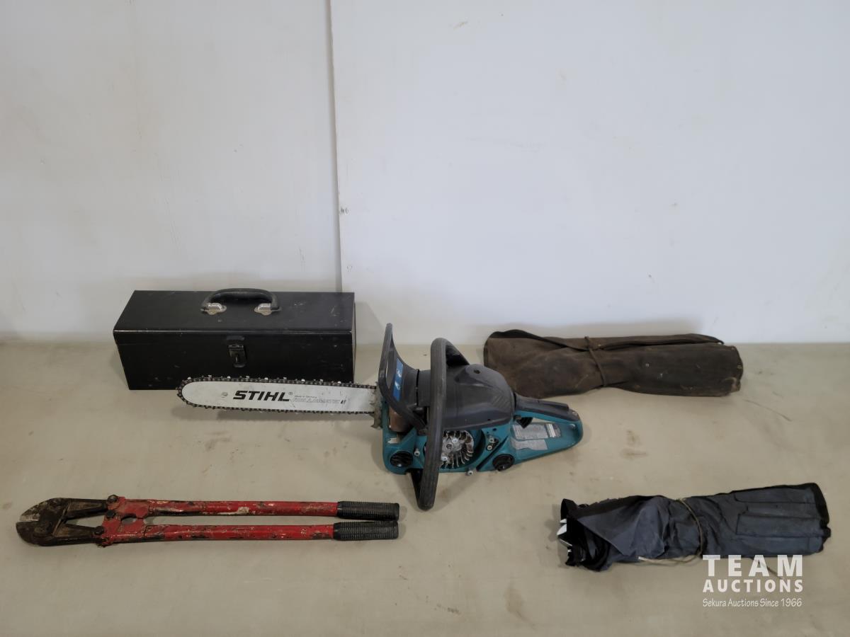 Makita EA32015 chainsaw for parts, toolbox with contents, 24" bolt cutters, (2) wrench sets