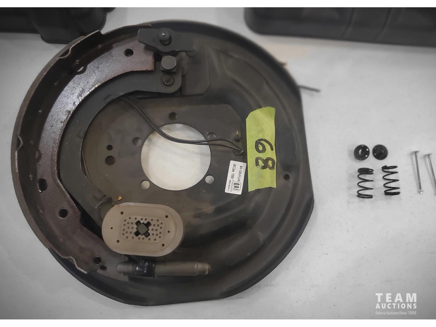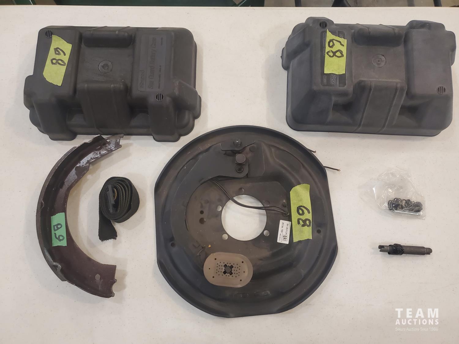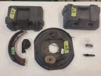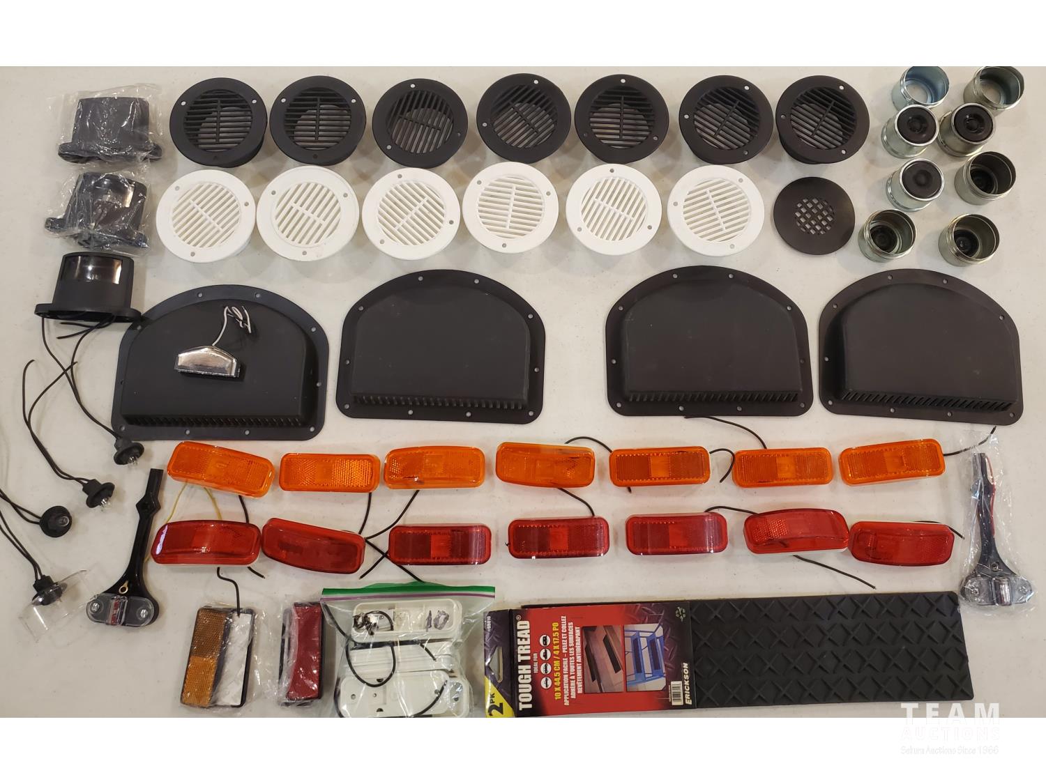 (13) Tie Downs Including Anchoring Plates, (4) Anchor Plates, 5000 lb to 7000 lb axle Electric Brake, Backing Plate, 12 inch x 2 inch Brake shoe, Magnet Kit, Hold down Pins and Adjuster, (2) Battery Box Covers 12 inch × 8 inch & Strap, 2 -12Volt DC 6 inch Amber & Red LED Trailer Fender Lights Double Face LED Side Marker Clearance Lighting. 7- Amber Clearance lights. 7- Red Clearance lights. 2- Red Reflectors. 2-Amber Reflectors. 4- Black Trailer Side Vents. 9- 3 inch round vents. 1- Tough Tread. 3- license plate Lights. 10-clearance light bodies. 3-License Plate bulb holders. 7-Hub grease caps. Set of 2 -ABS Chrome Plated Wheel Covers. Hub Cap fits Trailer Wheels with Eight 7/8 inch Lug Nuts on 6.5 inch BC, 16 inch Wheel
