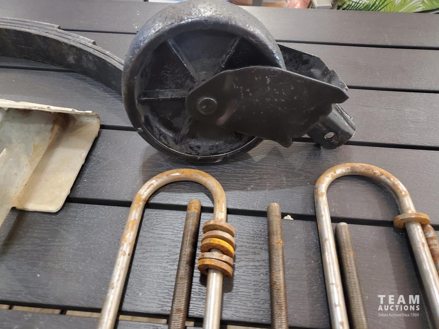 Trailer Wheel Locks, Trailer Roller Wheels, 2- 3500 pound Trailer Axle Springs, Trailer hold down U bolts, Trailer Spring bushings, Wheel Nuts, bearings, trailer license plate holder, shackles and shackle bolts