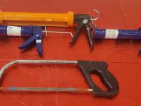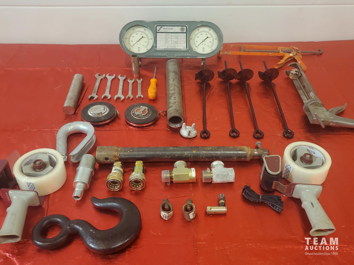14 (mostly) LED Flashlights, 5 Caulking Guns, Miscellaneous Hardware, Swimquip Gauges, Metric End Wrenches, 2 50 ft Tapes, Four Tent Tiedowns, High Pressure Hydraulic Quick Couplers, 16 inch Power Post Hole Extension, 2 Hand-Held Tape Guns