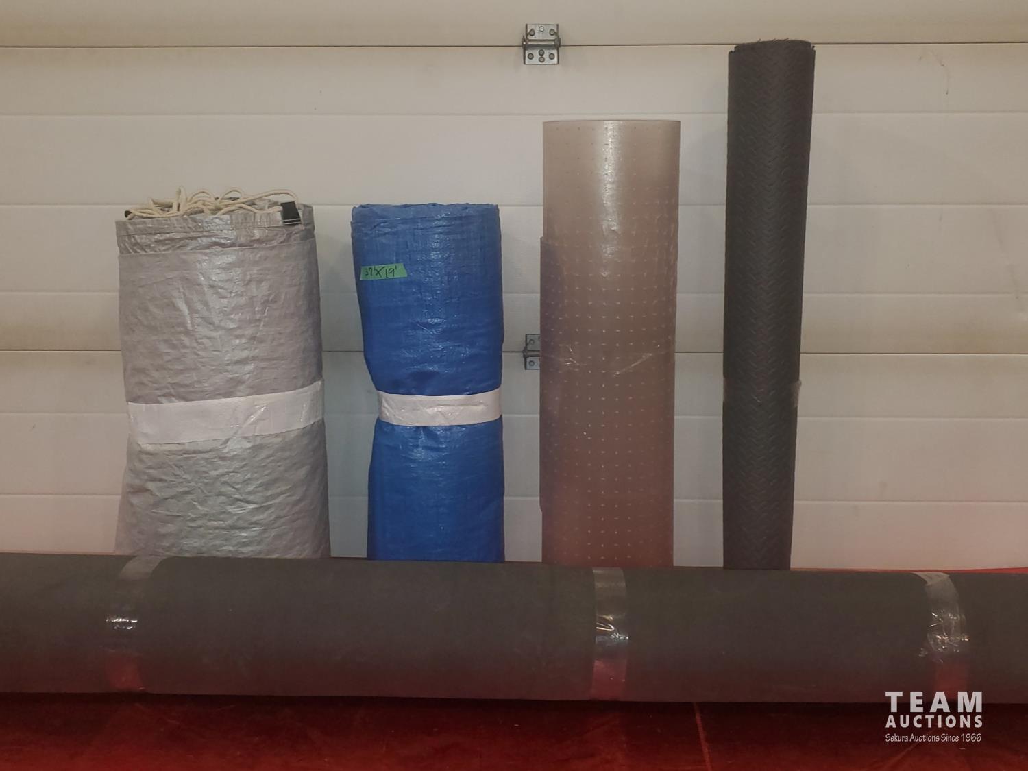 37 ft x 19 ft Tarp, 17 ft x 32 ft Oval Pool Cover Tarp with Drawstring, 41 inch × 47 inch Black Rubber Checker Plate Mat, 6 ft 9 inch ×6 ft Black Rubber Mat, 4 ft x 3 ft Hard Plastic Desk Chair Mat.
