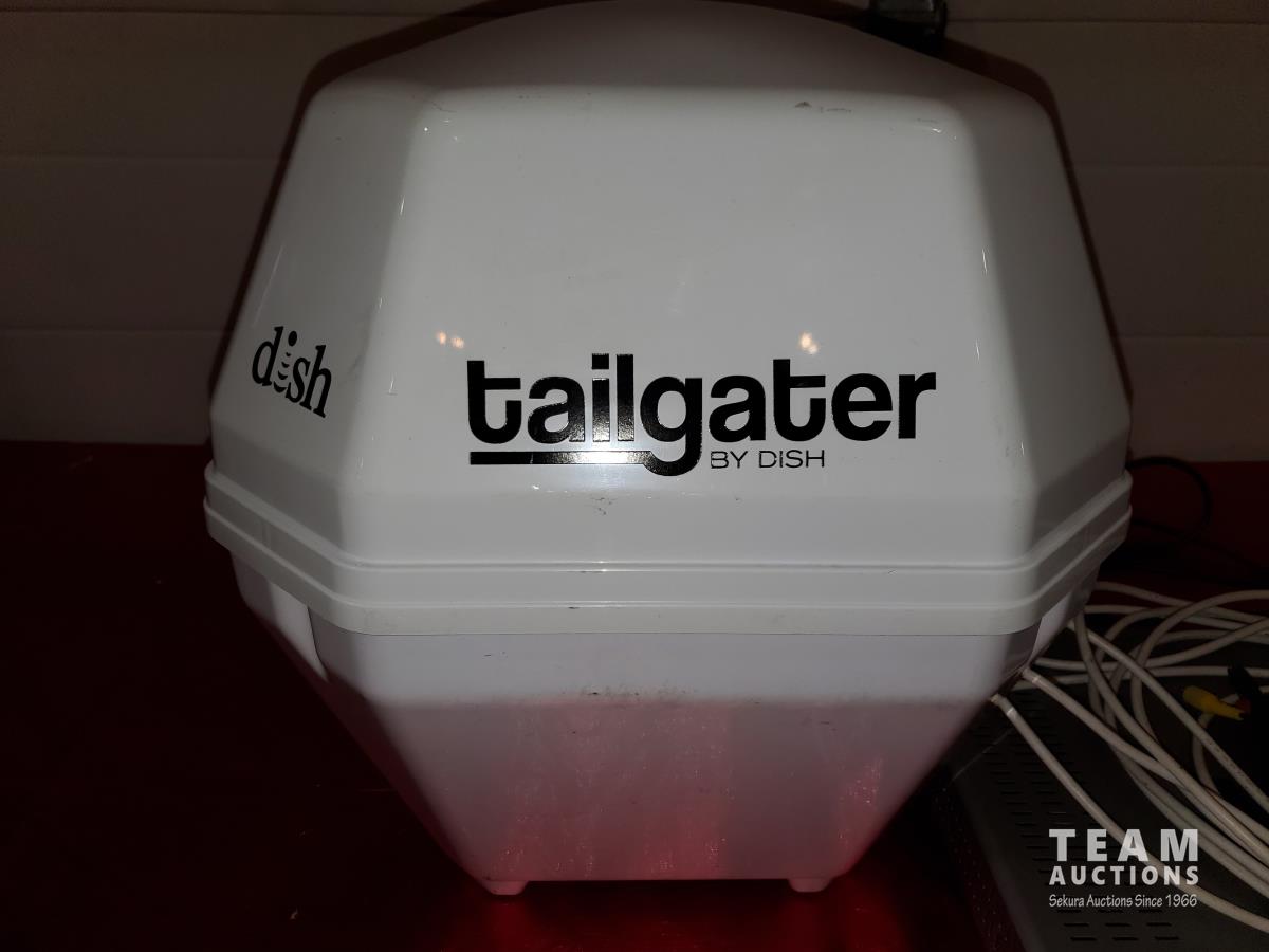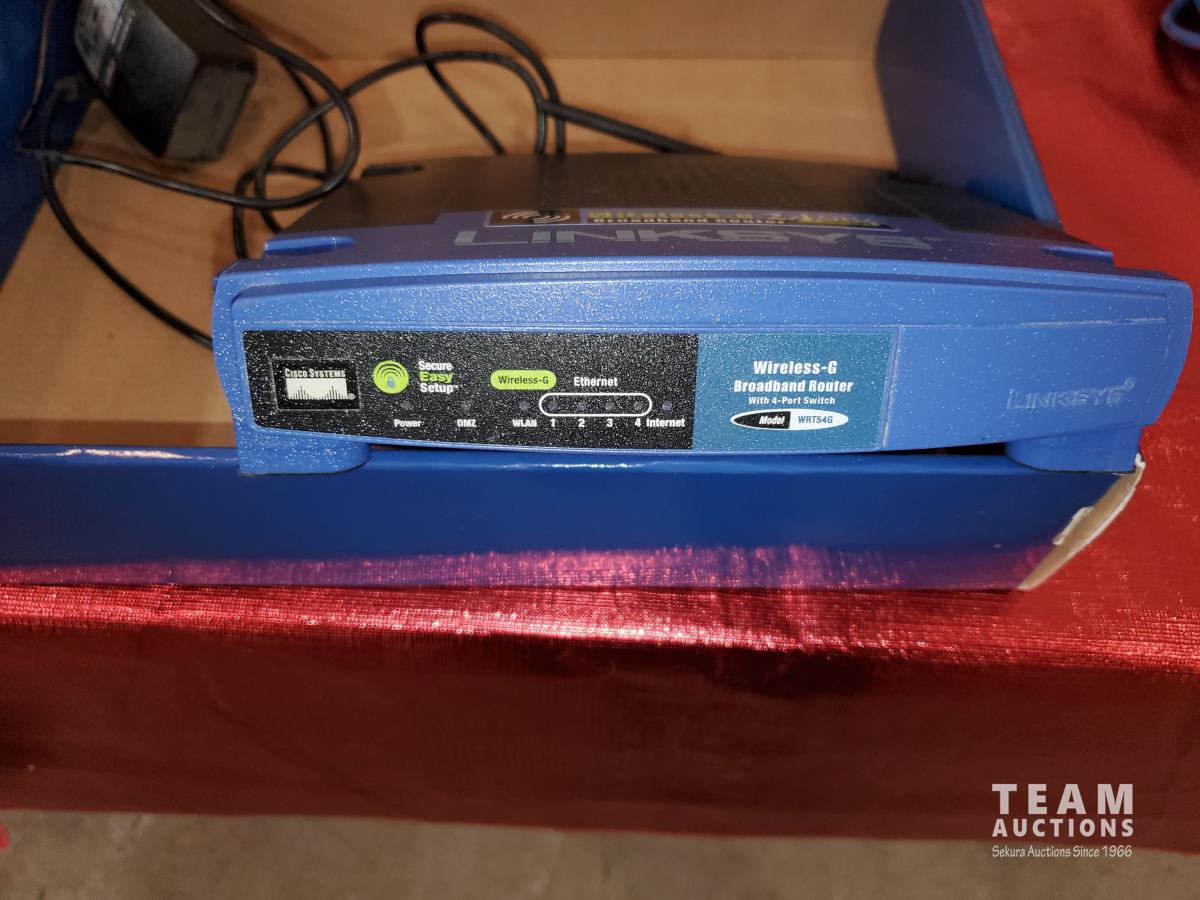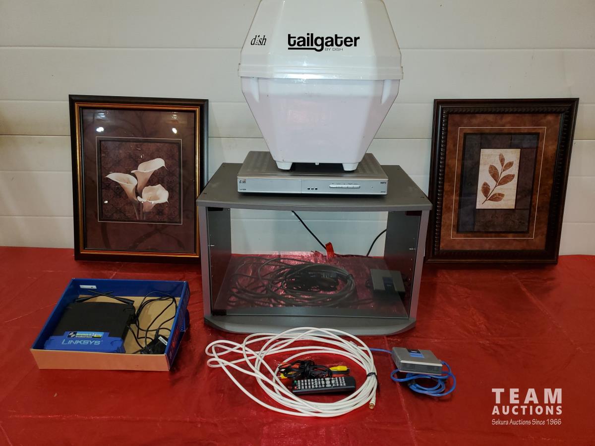 RV Tailgate Satellite Dish & Accessories, Linksys Wireless Broadband Router, Wireless to Telephone Adaptor, Glass and Wood Small Stand, (2) Art Pictures Framed