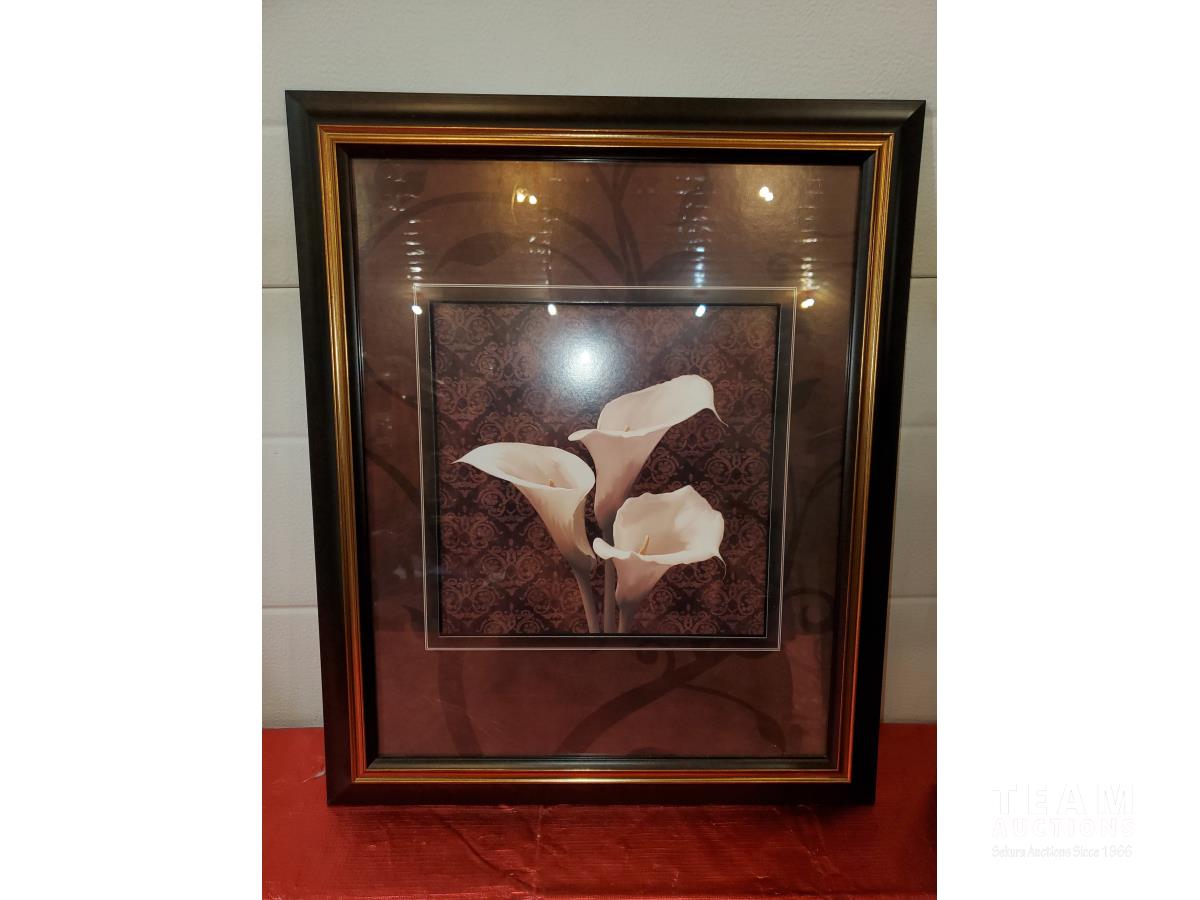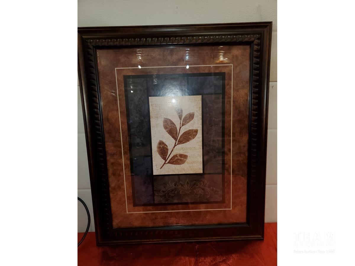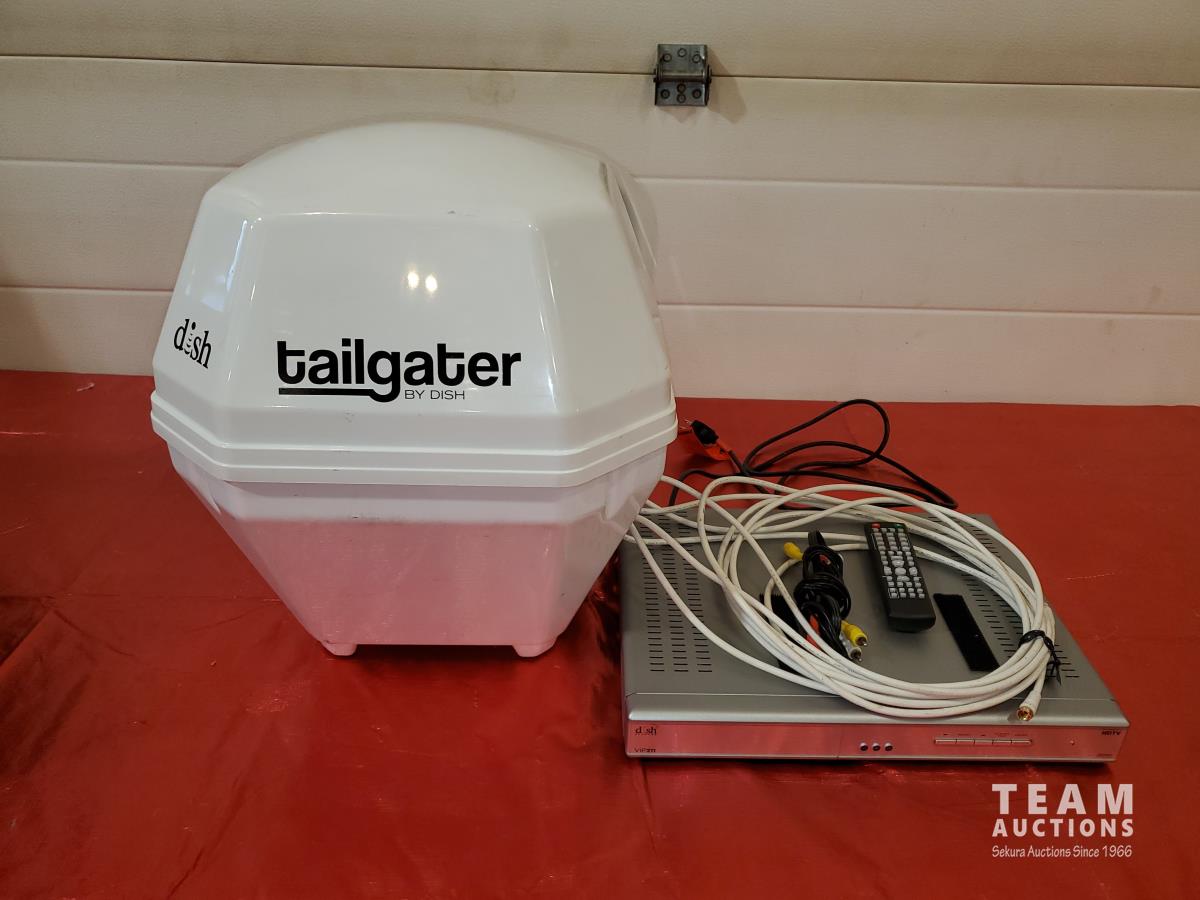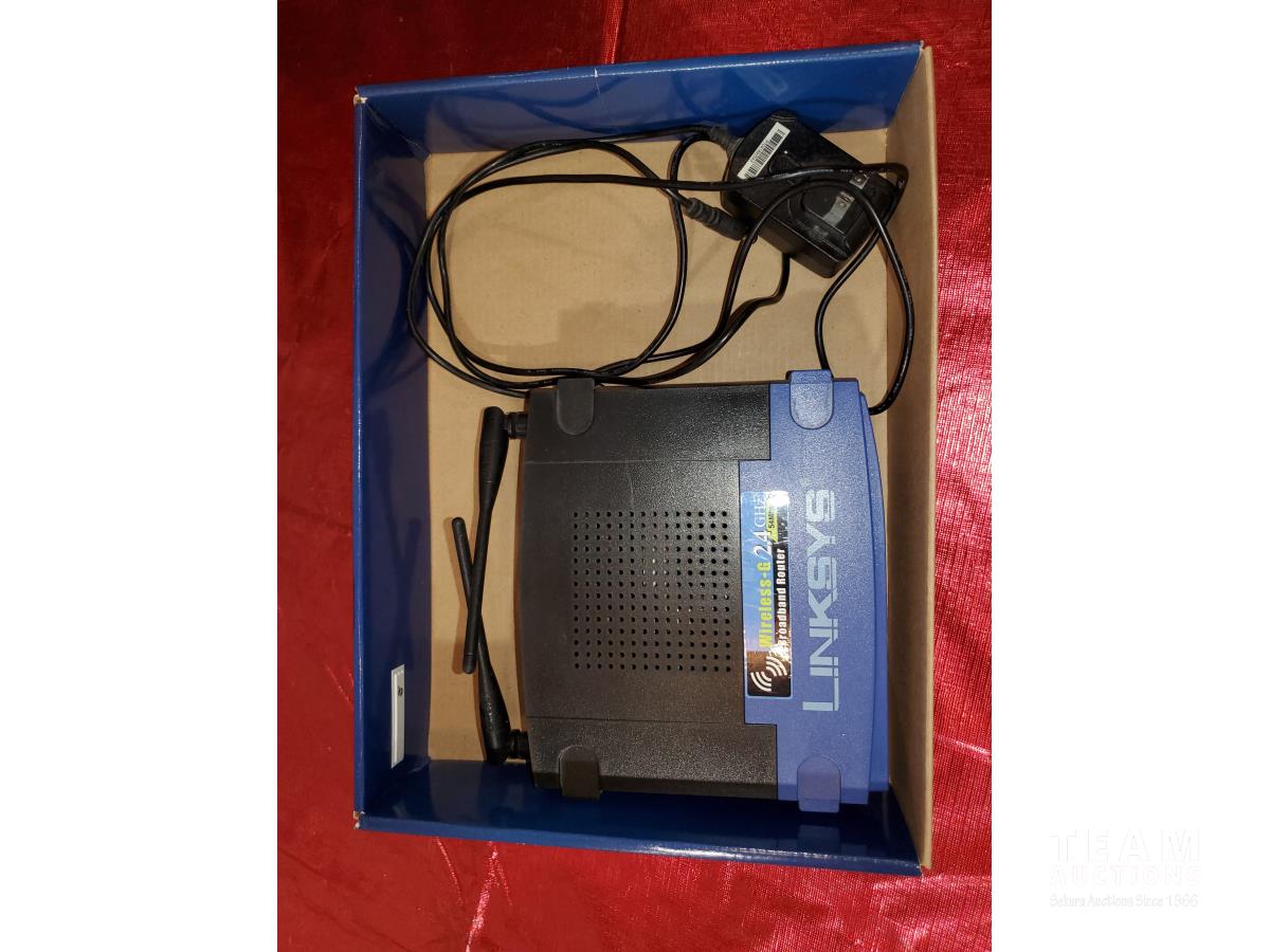 RV Tailgate Satellite Dish & Accessories, Linksys Wireless Broadband Router, Wireless to Telephone Adaptor, Glass and Wood Small Stand, (2) Art Pictures Framed
