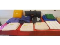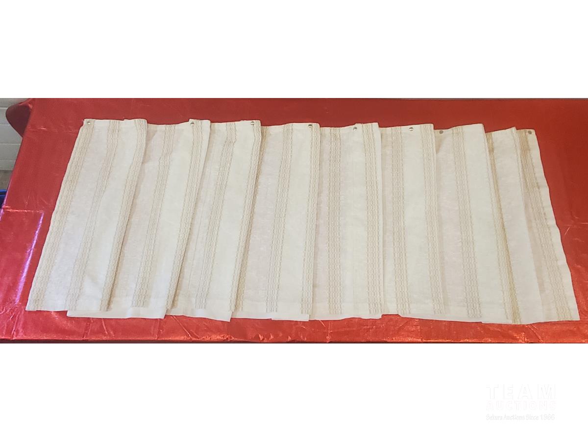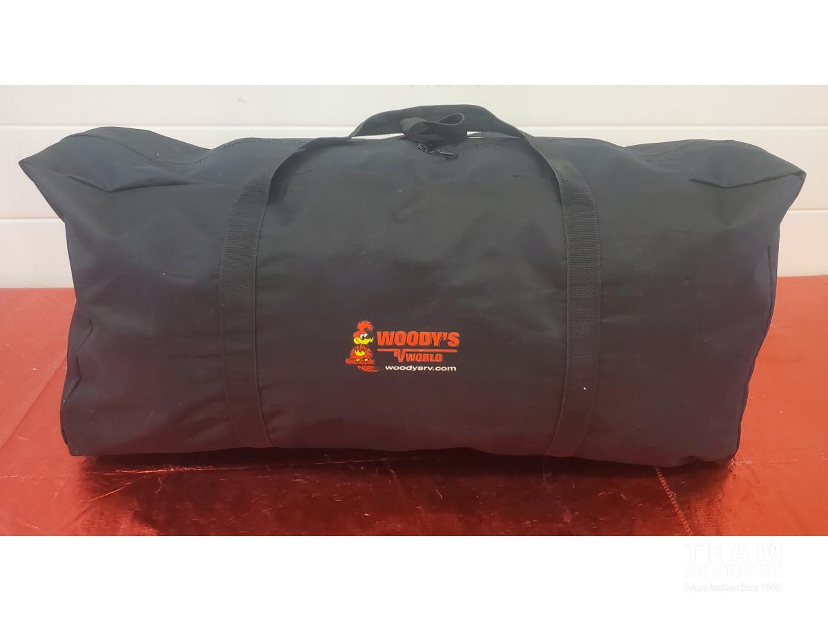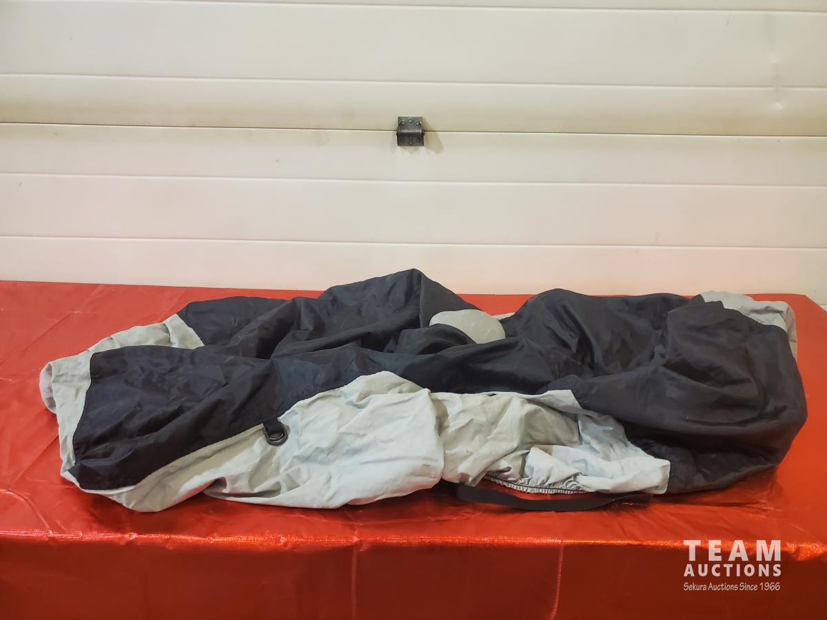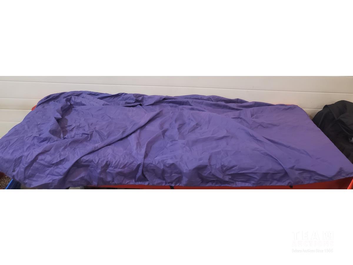 Large RV Duffle Bag, Covermax Deluxe Medium Motorcycle (covers up to 500 cc with Small Fairing), Approximately 11 ft 7 inch PWC or Small Boat Cover, Beige Sheers 20 ft wide x 7 ft 3 inch High & (2) 9 ft 6 inch Wide x 7 ft 8 inch High, 12 ft x 2 ft 6 inch RV Curtain, 4 Tarps (Sizes as marked), Pillow, Air Mattress or Flotation Device