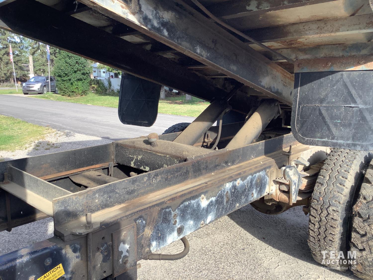 366 V8 gas engine, 5x2 10 speed manual transmission, Renn 12 ft steel box, twin cylinder hoist, hydraulic brakes, 10.00x20 rear tires