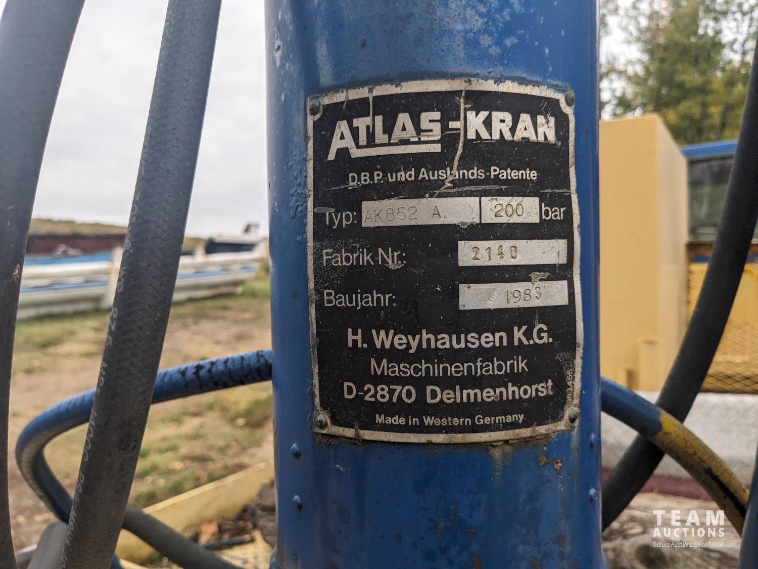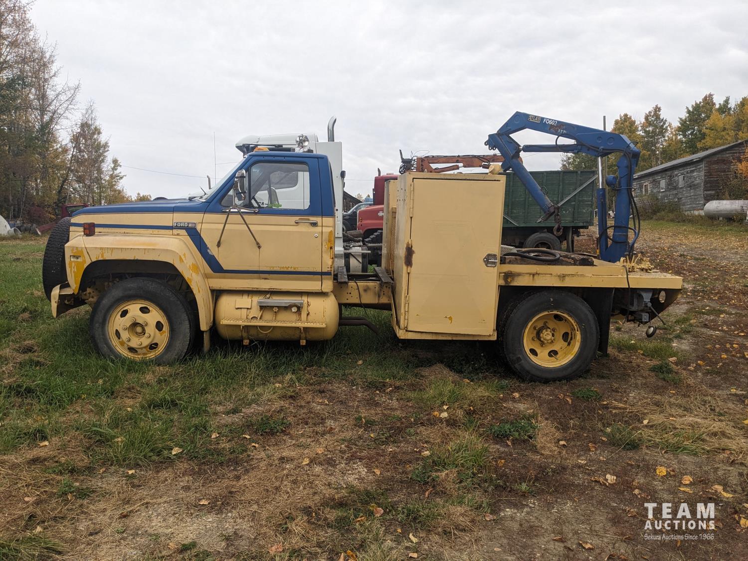 Ford V8 propane engine, 5 speed manual transmission, Atlas F0C02 crane, steel deck with 2 storage compartments, spring suspension, 8.25-20 tires