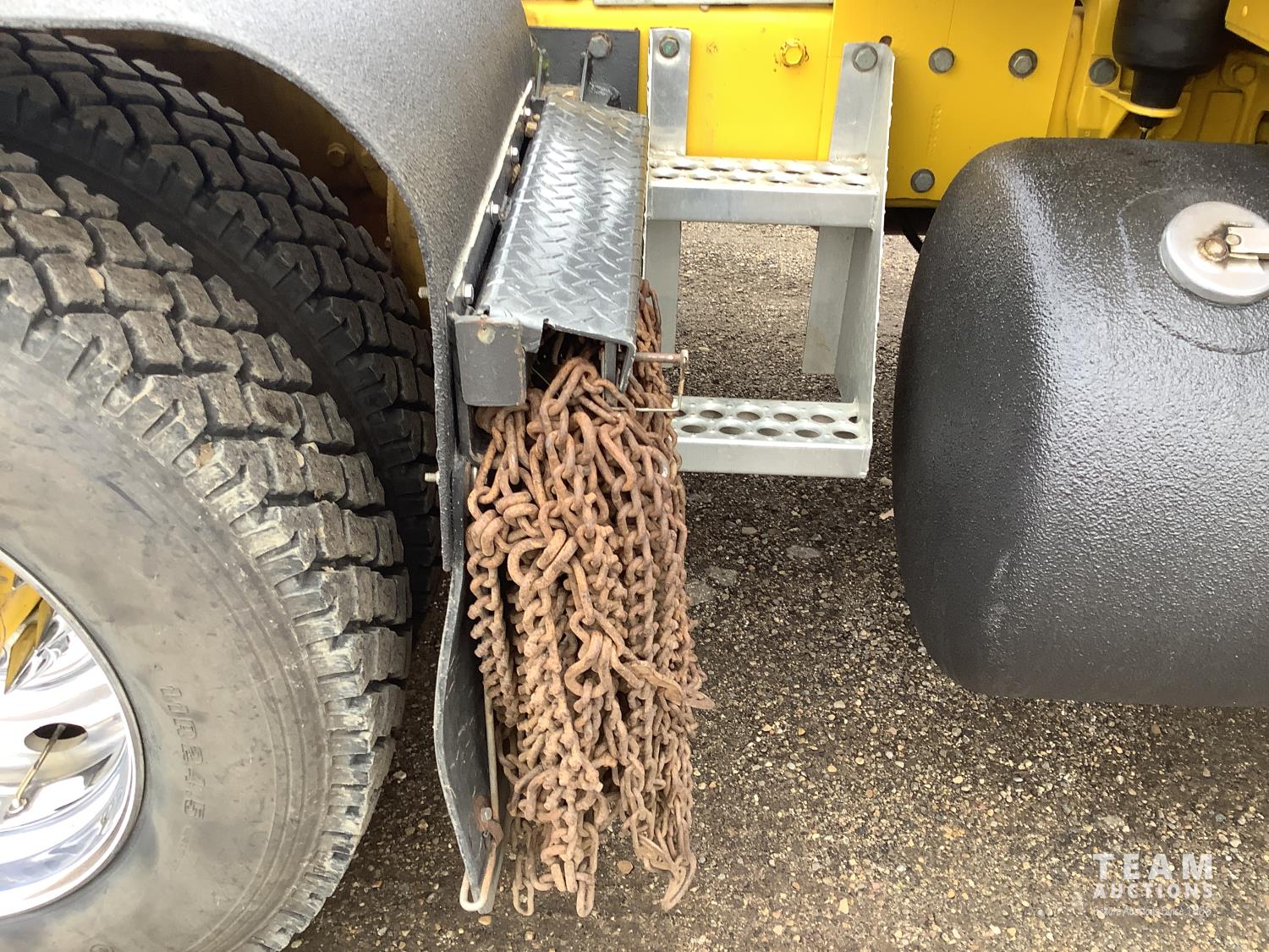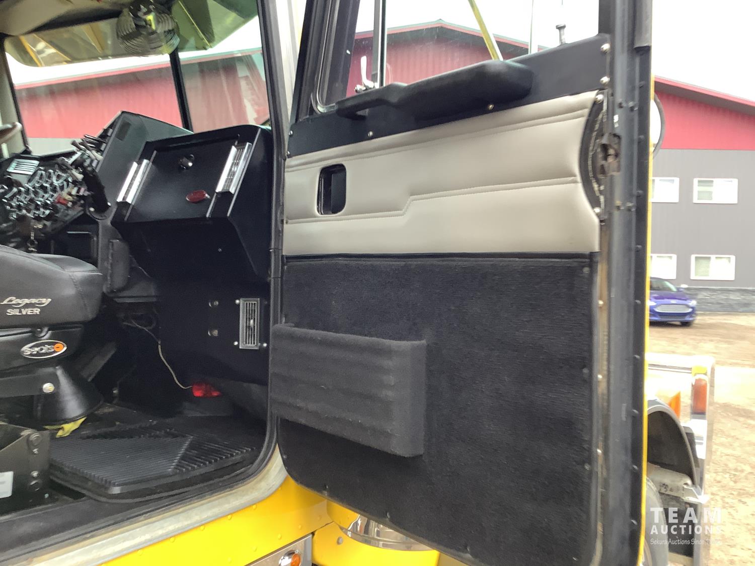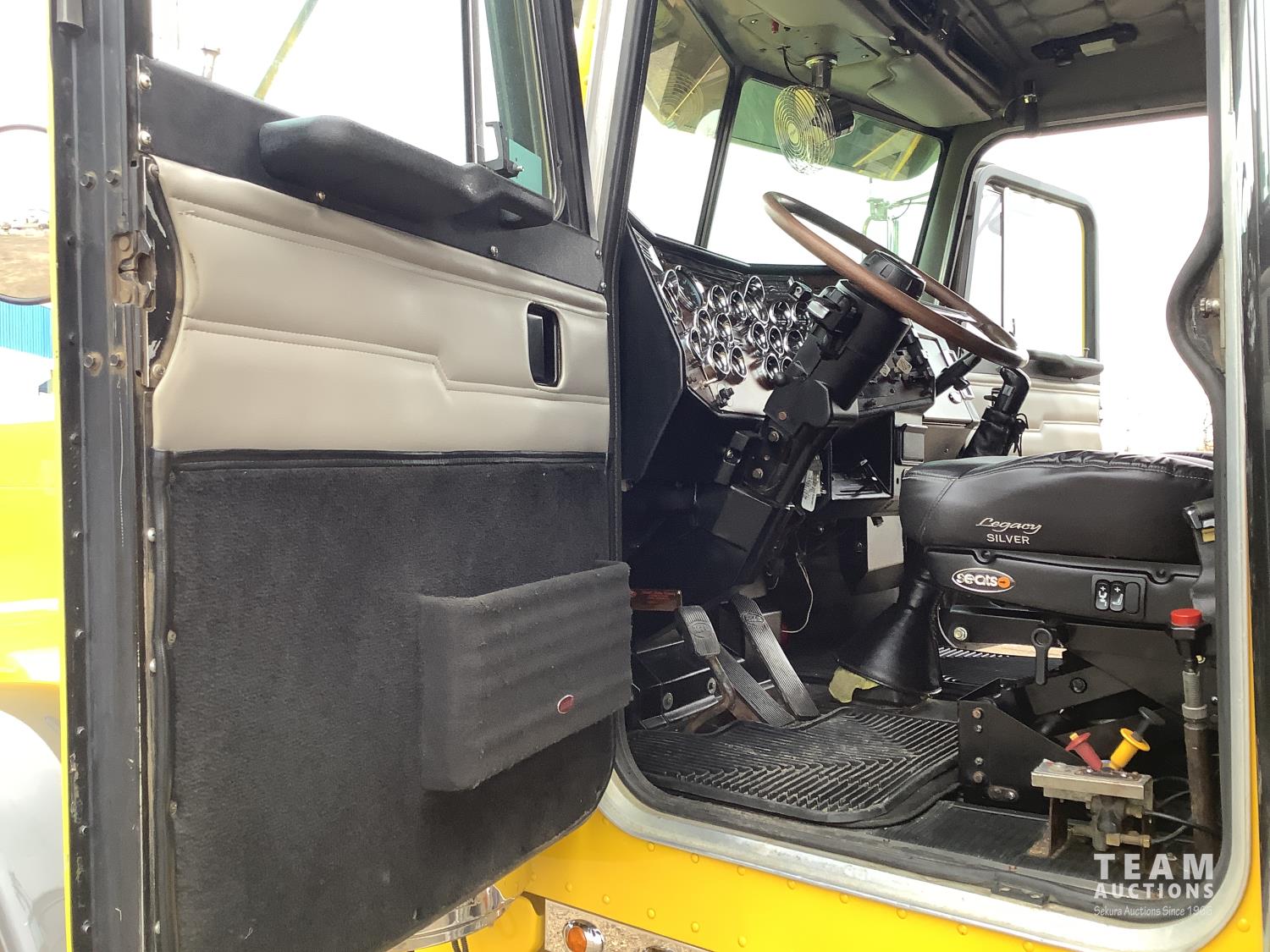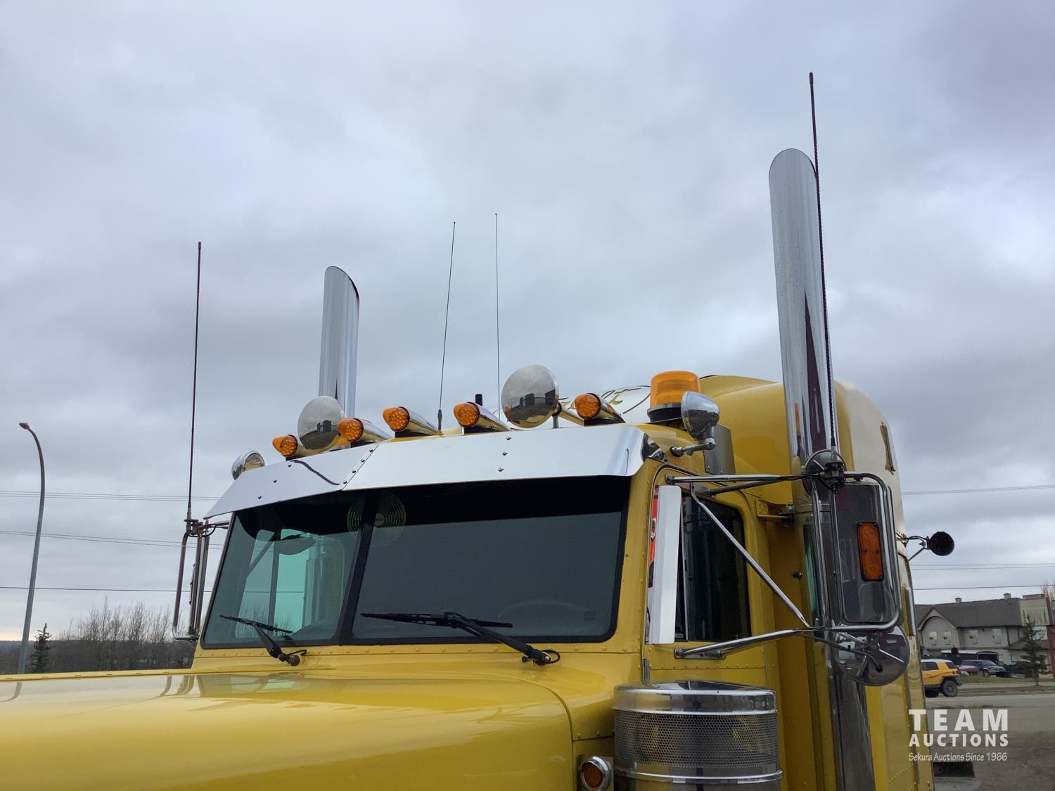 Caterpillar 3406 425 HP engine, engine brake, Eaton Fuller 18 speed transmission, Cat single turbo engine, mid rise sleeper, A/C, leather interior, aluminum moose bumper, headache rack, beacons, chain holders, air sliding 5th wheel, PTO mounted hydraulic pump with tank and hydraulic valve, in cab controls, functional wet kit (wet kit tank and valve haven't been reinstalled but all components are there), winter front, custom built headache rack (in 2021), air ride suspension, 13,000 lb front axle, 46,000 lb rear axles, full lockers, wheel chains, all aluminum wheels, 11R24.5 front tires