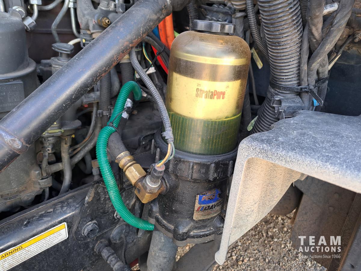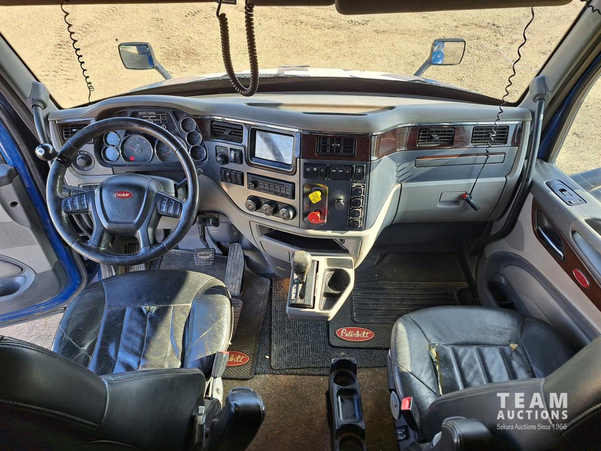 Paccar MX13 12.9 L Inline 6-Cylinder 510 HP diesel engine, DEF required, engine heater, engine brake, Eaton Fuller PACCAR TX-12 auto shift transmission, cab heater, high rise 80 inch sleeper, A/C, cruise control, leather interior, navigation system, radio, aluminum moose bumper, air ride cab, chain holders, 5,988 lb front axle, 20,000 lb rear axles, aluminum outer wheels, 11R22.5 tires
