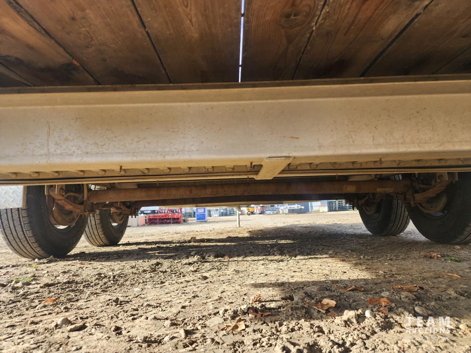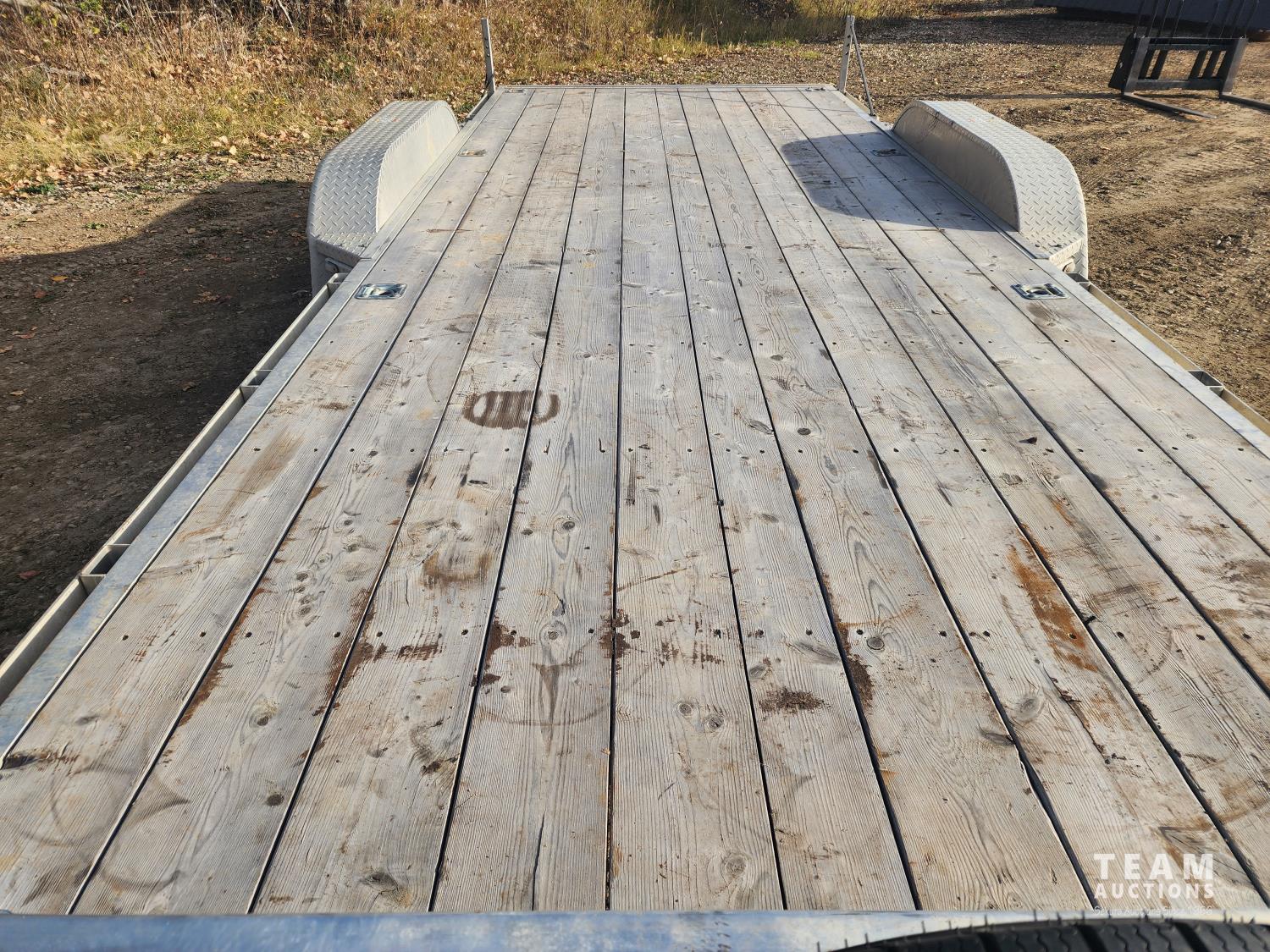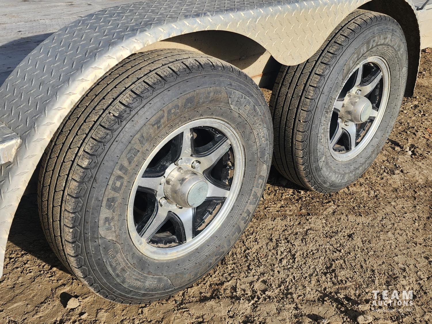 82 inch wide deck, wood deck, slide in ramps, spring suspension, ball hitch, rub rails, stake pockets, LED lights, spare tire, 5200 lb axles, 225/75R15 tires