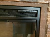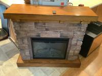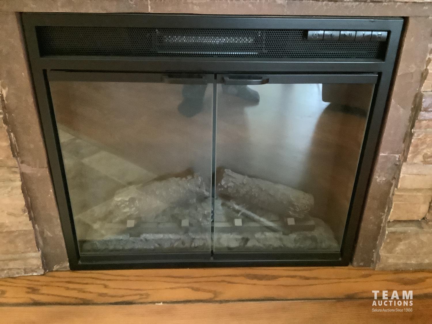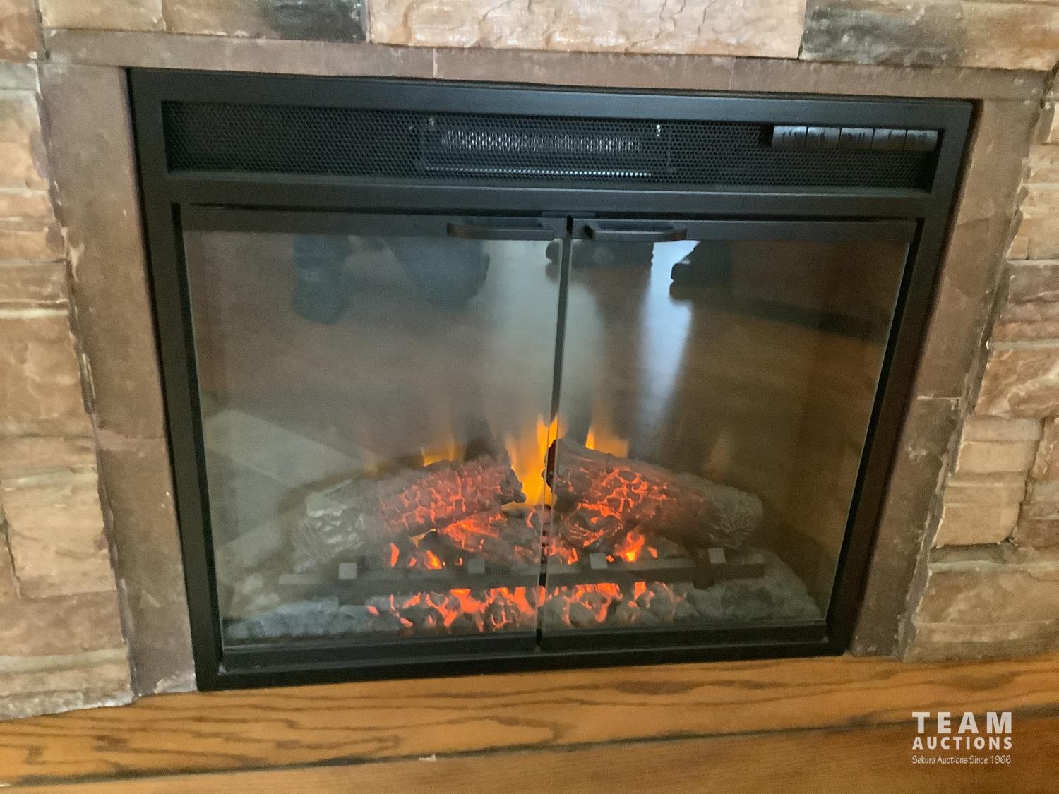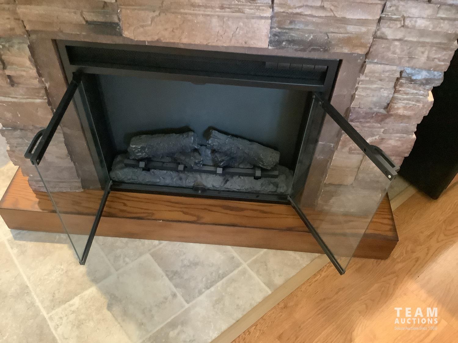110 volt, open glass doors, real rock finish, 44 inch wide, 39 inch high, 14 inch wide